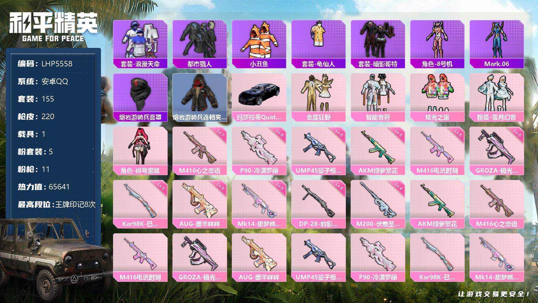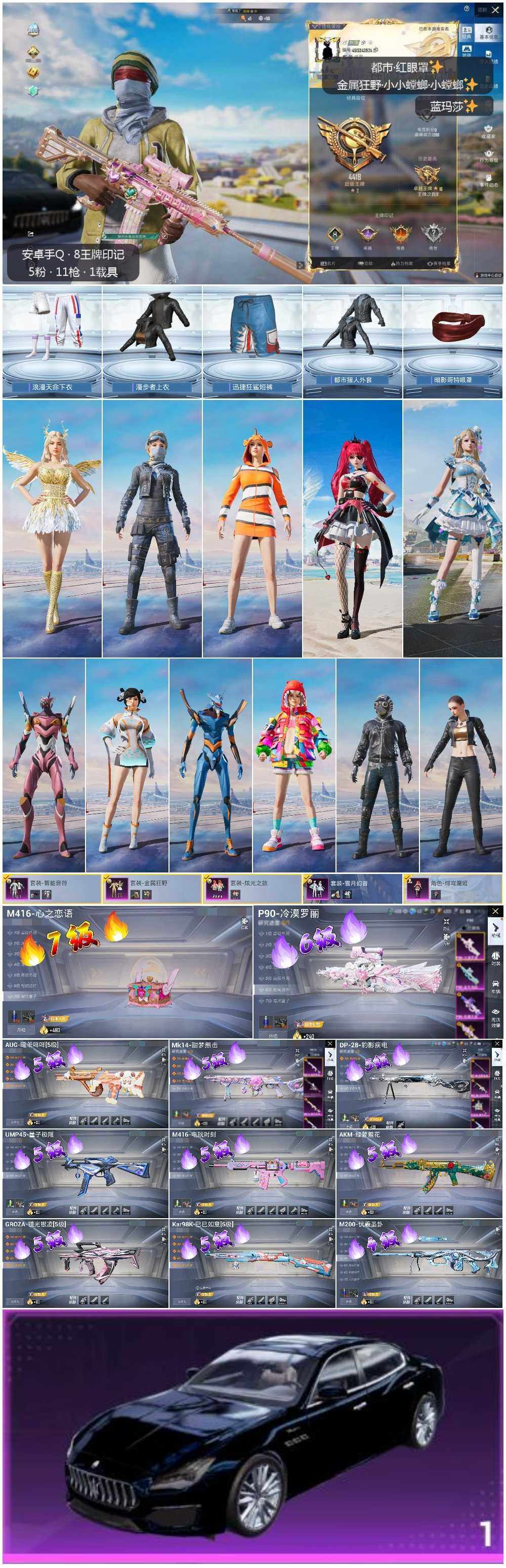 [12842425]素材身法号/地铁满天赋 安卓 手Q-5粉装-11特效枪-1载具-3粉色飞行器-6.5w热力值-8王牌印记-155套装-220枪皮【热门品类】:套装-浪漫天命,套装-都市猎人,套装-小丑鱼,套装-龟仙人,套装-暗影哥特,角色-8号机,角色-Mark.06,熔岩游骑兵面罩,熔岩游骑兵连帽夹克【粉色载具】:玛莎拉蒂Quattroporte(夜幕蓝)【粉色套装】:粉装-金属狂野,粉装-智能音符,粉装-炫光之旅,粉装-雪月幻音,角色-绯穹魔姬【粉色枪皮等级】:AKM-绿萝繁花(五级),M416-心之恋语(七级),M416-电玩时刻(五级),GROZA-镜光银凌(五级),AUG-暖羊咩咩(五级),UMP45-量子极限(五级),P90-冷漠罗丽(六级),Kar98K-巳巳如意(五级),Mk14-甜梦熊击(五级),M200-伏羲圣卦(四级),DP-28-豹影疾电(五级)【粉色飞行器】:春暖花开飞行器,终晖之翼飞行器,飞天猪飞行器