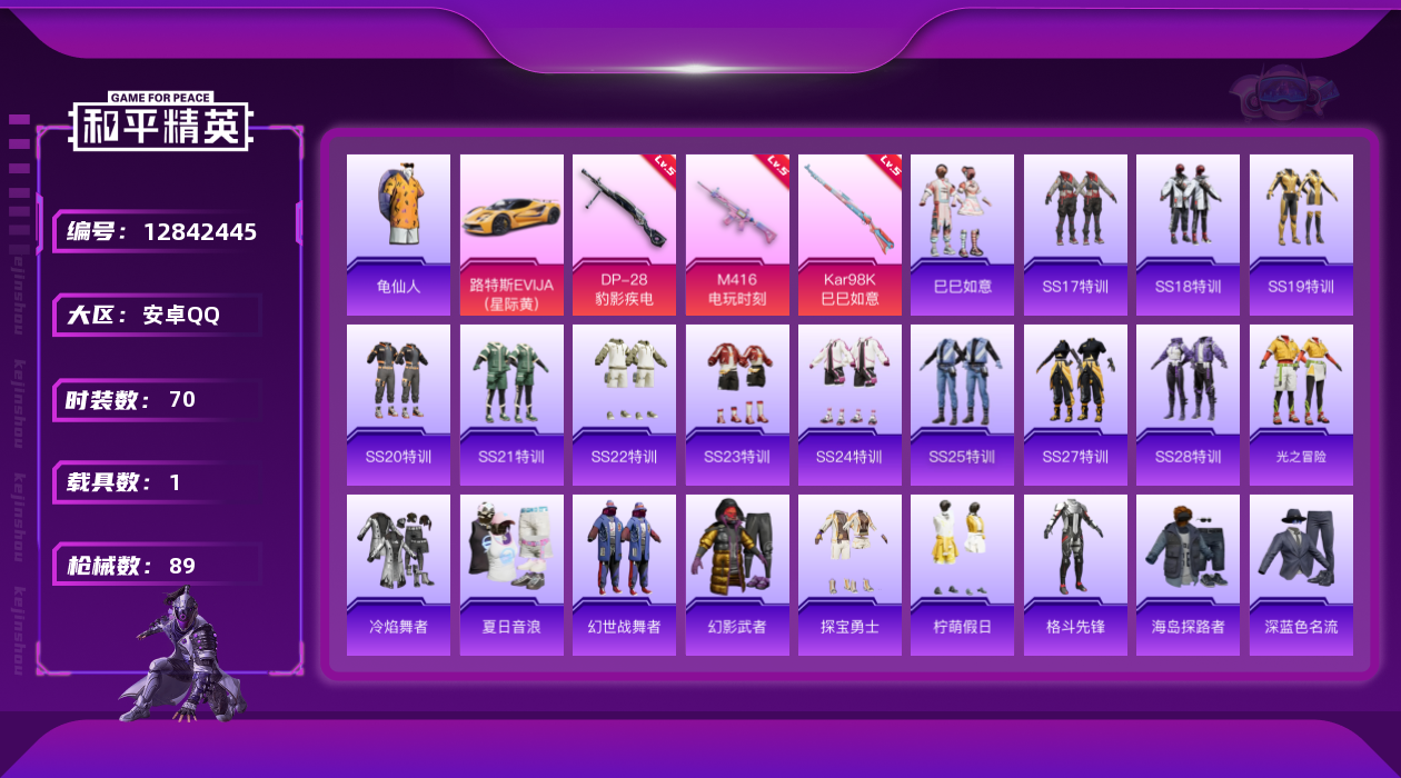 - PX_2089395- 可二次 安卓手Q-6王牌印记-3粉装-4特效枪-0载具-35284热力值-109套装-115枪皮-1卓越印记-0传奇印记, 【3粉装】,小可学妹,天禅智恒,金丰海韵, 【4特效枪】,AKM-绿萝繁花-5级,M416-电玩时刻-5级,Kar98K-巳巳如意-4级,UMP45-量子极限-5级, 【2稀有紫装】,暗影哥特,龟仙人, 【109稀有时装】,SS31特训,SS33特训,