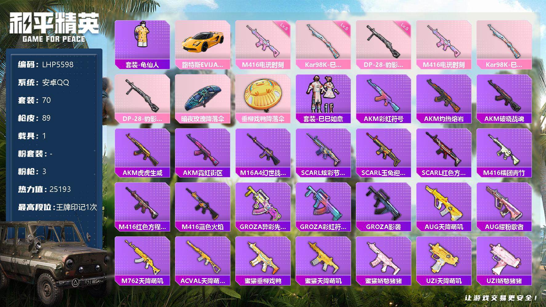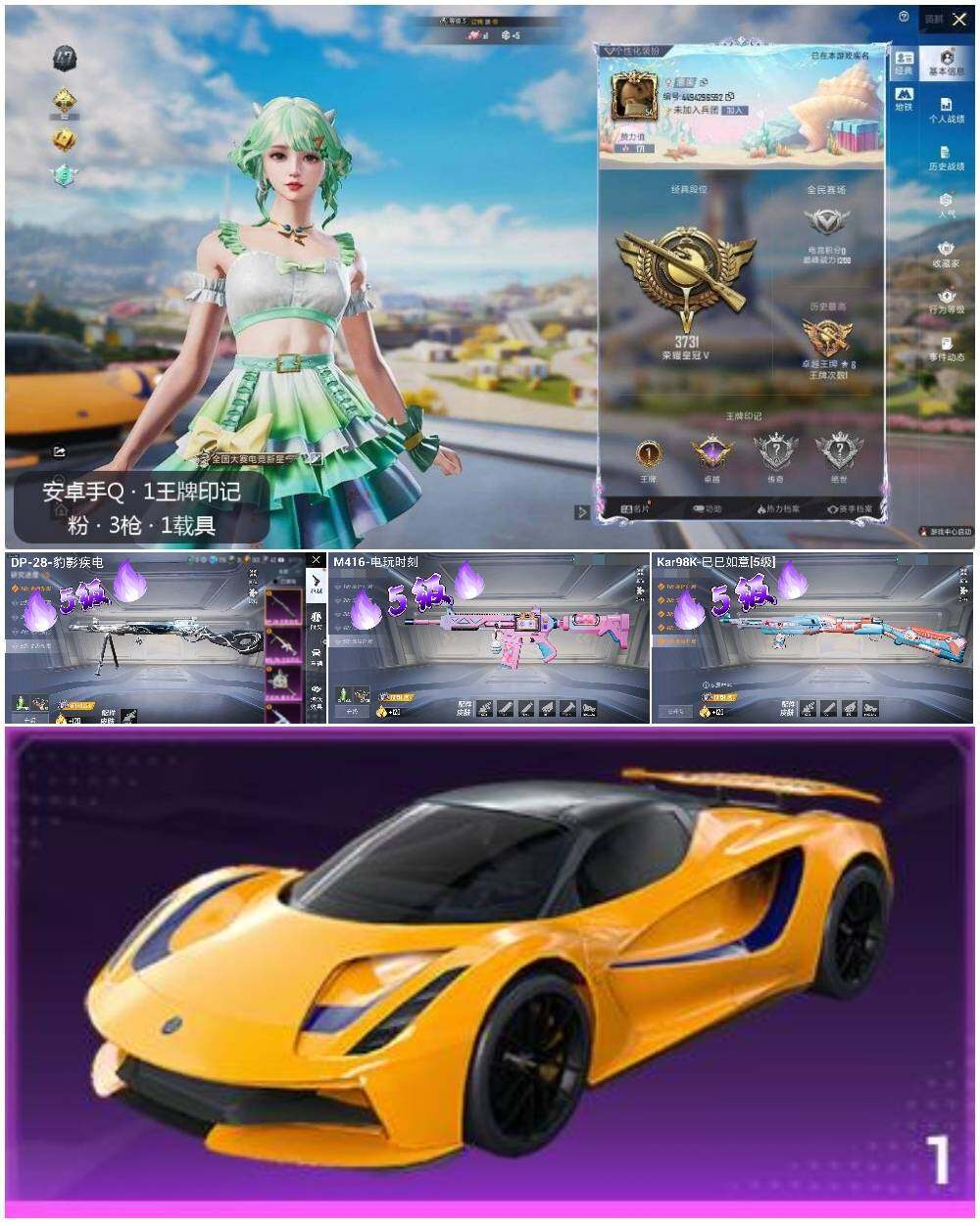 [12842445]安卓 手Q-3特效枪-1载具-2.5w热力值-1王牌印记-70套装-89枪皮【热门品类】:套装-龟仙人【粉色载具】:路特斯EVIJA(星际黄)【粉色枪皮等级】:M416-电玩时刻(五级),Kar98K-巳巳如意(五级),DP-28-豹影疾电(五级)