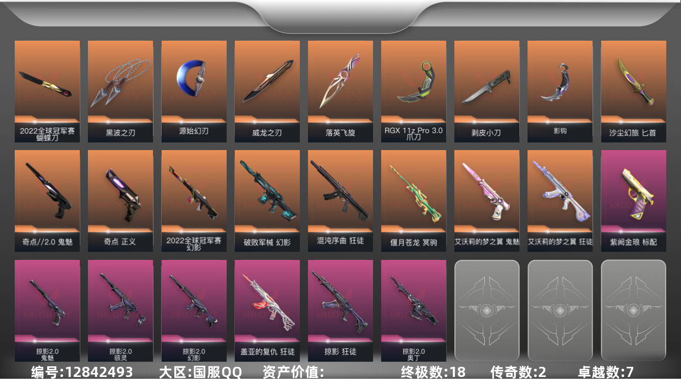[12842493]【套装】:2022全球冠军赛套装,掠影//2.0套装 【英雄】:幻棱,炼狱,维斯,暮蝶,钛狐,壹决,铁臂,捷风,雷兹,幽影,不死鸟,贤者,猎枭,蝰蛇,零,芮娜,奇乐,尚勃勒,霓虹,斯凯,夜露,星礈,K/O,海神,盖可,黑梦,钢锁 【近战 武器】:近战武器-2022全球冠军赛 蝴蝶刀,近战武器-嘟昂嘟昂超弹力水球拳套,近战武器-影钩,近战武器-剥皮小刀,近战武器-RGX 11z Pro//3.0 爪刀,近战武器-黑波之刃,近战武器-落英飞旋,近战武器-威龙之刃,近战武器-源始幻刃,近战武器-沙尘幻旅 匕首 【狂徒】:狂徒-艾沃莉的梦之翼,狂徒-混沌序曲,狂徒-掠影,狂徒-盖亚的复仇,狂徒-沙尘幻旅 【幻影】:幻影-2022全球冠军赛,幻影-破败军械,幻影-掠影//2.0 【戍卫】:戍卫-萌彩剪影 【獠犬】:獠犬-胡桃狂想 【冥驹】:冥驹-偃月苍龙,冥驹-胡桃狂想 【飞将】:飞将-沙尘幻旅 【战神】:战神-萌彩剪影 【奥丁】:奥丁-掠影//2.0 【判官】:判官-萌彩剪影 【骇灵】:骇灵-掠影//2.0,骇灵-沙尘幻旅 【蜂刺】:蜂刺-胡桃狂想 【标配】:标配-紫阙金琅,标配-超能偶像 【正义】:正义-奇点,正义-超限闪存,正义-沙尘幻旅 【鬼魅】:鬼魅-艾沃莉的梦之翼,鬼魅-奇点//2.0,鬼魅-掠影//2.0,鬼魅-胡桃狂想,鬼魅-扑棱扑棱 【狂怒】:狂怒-萌彩剪影 【卡面】:分崩离析 卡面,《双城之战》拥抱 卡面,精灵大战 卡面,欢迎来到底城 卡面,南瓜盛典 卡面,无畏契约:暮蝶 卡面,修车达人 卡面,正义的化身 卡面,终章:生意人麦宝 卡面,铁之华 卡面,时间到 卡面,最高舞台 卡面,树懒大作战 卡面,声感陷阱设计图 卡面,Clutch 卡面,梦幻奶茶 卡面,源能反应 卡面,零点嗅探设计图 卡面,沙雕爆能器 卡面,无畏契约GO!第一卷:芮娜 卡面,清除名单 卡面,无畏契约GO!第一卷:零 卡面,龍记 卡面,《双城之战》金克丝 卡面,蝰蛇vs幽影 卡面,完美调谐 卡面 ,没有什么能逃过我的眼睛 卡面,暗枪 卡面,无畏契约GO!第一卷:贤者 卡面,终章:黑影先生的咖啡! 卡面,铁臂vs雷兹 卡面,纪念照 P2 卡面,钢锁vs盖可 卡面,别冒尖 卡面,一击全倒 卡面,黑影先生的咖啡! 卡面,天台狂欢 卡面,胡桃狂想 卡面,沙尘幻旅 卡面,壹决工牌 卡面,萌彩剪影 卡