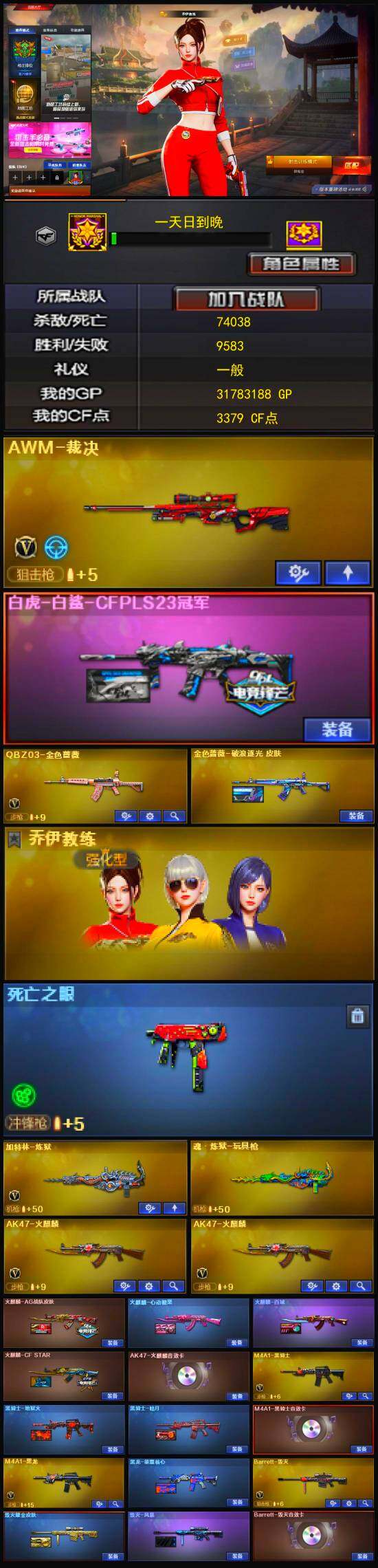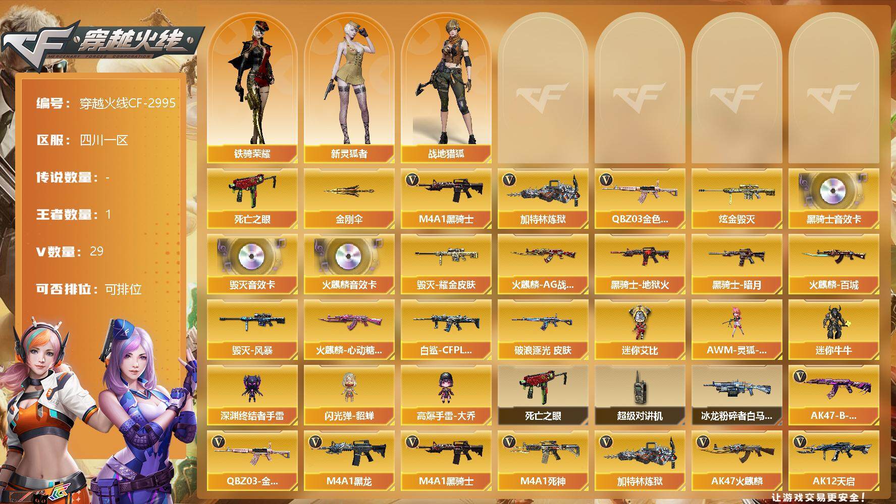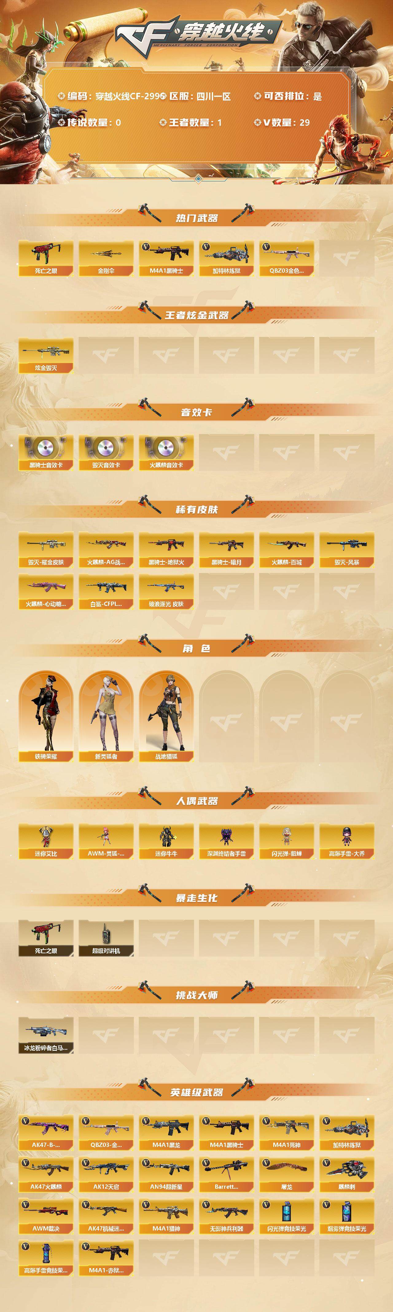 [12842784]四川一区-29V-1王者-2炫金 【热门武器】:QBZ03-金色蔷薇,死亡之眼,M4A1-黑骑士,加特林-炼狱,金刚伞 【王者炫金武器】:炫金毁灭*2 【音效卡】:AK47-火麒麟音效卡,M4A1-黑骑士音效卡,Barrett-毁灭音效卡 【稀有皮肤】:白虎-白鲨-CFPLS23冠军,金色蔷薇-破浪逐光 皮肤,火麒麟-AG战队皮肤,火麒麟-百城,火麒麟-心动糖果,黑骑士-暗月,黑骑士-地狱火,毁灭耀金皮肤,毁灭-风暴 【角色】:战地猎狐,新灵狐者,铁骑荣耀 【人偶武器】:AWM-灵狐-15周年嘉年华,迷你艾比,迷你牛牛,深渊终结者手雷,闪光弹-貂蝉,高爆手雷-大乔 【暴走生化】:死亡之眼,超级对讲机 【挑战大师】:冰龙粉碎者-白马银枪 【英雄级武器】:高爆手雷-竞技荣光,烟雾弹-竞技荣光,闪光弹-竞技荣光,QBZ03-金色蔷薇,无影-神兵利器,M4A1-黑龙,M4A1-黑骑士,M4A1-死神,加特林-炼狱,AK47-火麒麟*2,AK12-天启*2,AN94-超新星,Barrett-毁灭,AWM-裁决,AK47-机械迷城,M4A1-猎神,AK47-B-常胜将军,M4A1-赤狱骑士,麒麟刺*2,屠龙*2 【特殊枪械】:1黑骑士,1炼狱