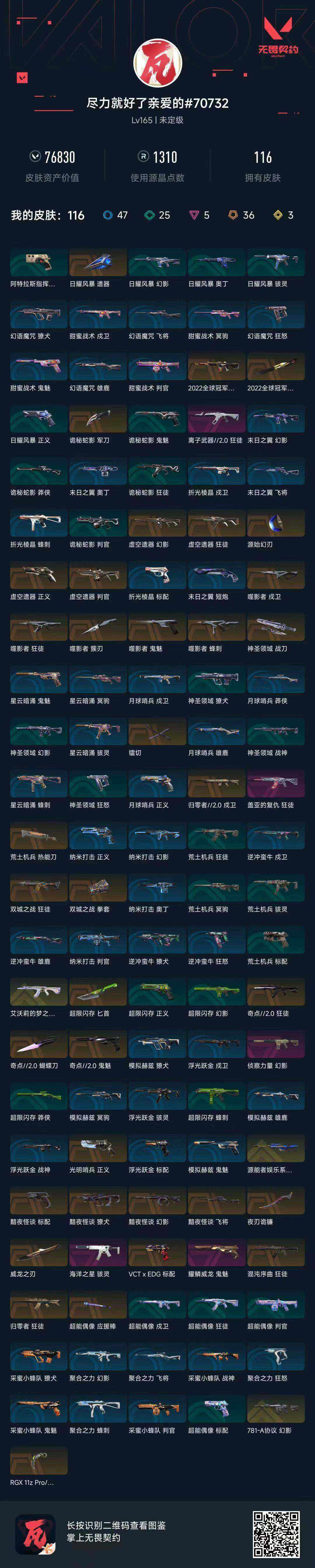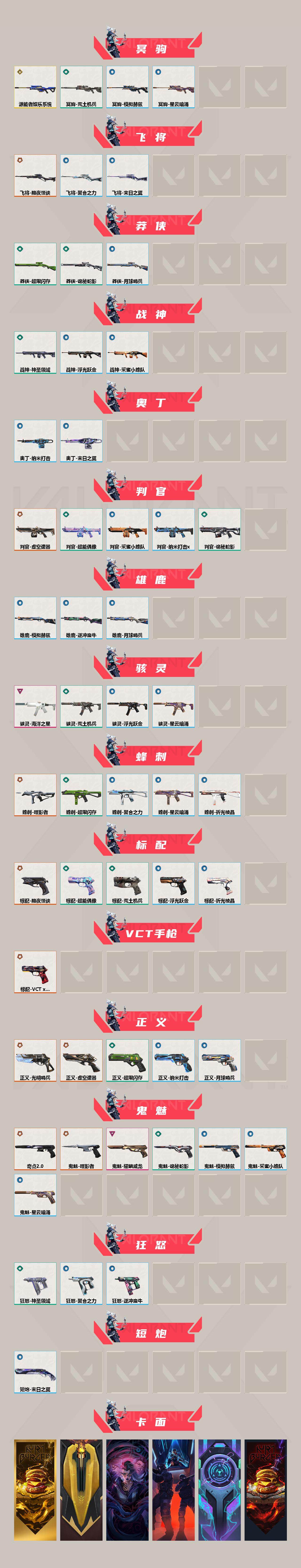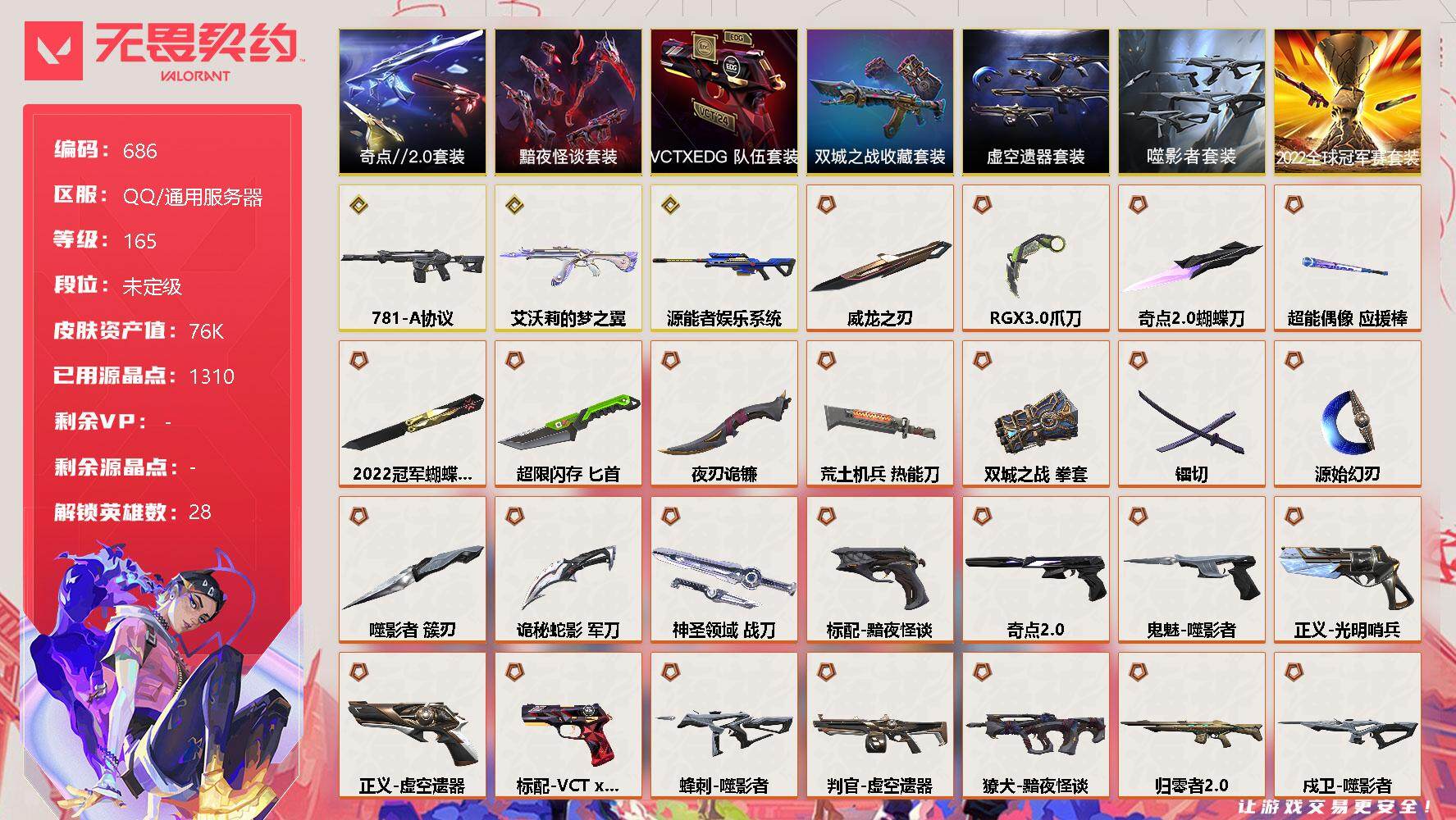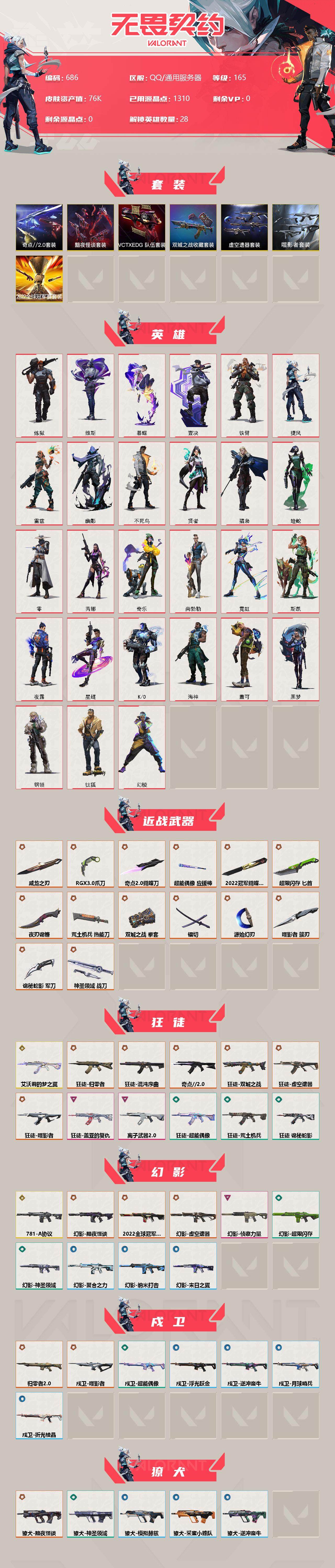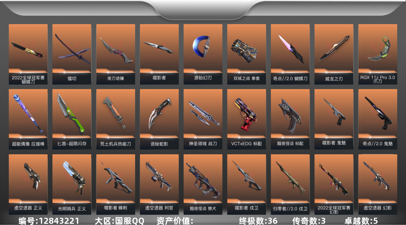 [12843221]【套装】:2022全球冠军赛套装,噬影者套装,虚空遗器套装,《双城之战》收藏套装,奇点//2.0套装,黯夜怪谈套装,VCTxEDG 队伍套装 【英雄】:幻棱,炼狱,维斯,暮蝶,钛狐,壹决,铁臂,捷风,雷兹,幽影,不死鸟,贤者,猎枭,蝰蛇,零,芮娜,奇乐,尚勃勒,霓虹,斯凯,夜露,星礈,K/O,海神,盖可,黑梦,钢锁 【近战 武器】:近战武器-2022全球冠军赛 蝴蝶刀,近战武器-奇点//2.0 蝴蝶刀,近战武器-RGX 11z Pro//3.0 爪刀,近战武器-噬影者 簇刃,近战武器-镭切,近战武器-威龙之刃,近战武器-双城之战 拳套,近战武器-源始幻刃,近战武器-超能偶像 应援棒,近战武器-超限闪存 匕首,近战武器-荒土机兵 热能刀,近战武器-夜刃诡镰,近战武器-诡秘蛇影 军刀,近战武器-神圣领域 战刀 【狂徒】:狂徒-艾沃莉的梦之翼,狂徒-归零者,狂徒-混沌序曲,狂徒-奇点//2.0,狂徒-双城之战,狂徒-虚空遗器,狂徒-噬影者,狂徒-盖亚的复仇,狂徒-离子武器//2.0,狂徒-超能偶像,狂徒-荒土机兵,狂徒-诡秘蛇影 【幻影】:幻影-781-A协议,幻影-2022全球冠军赛,幻影-黯夜怪谈,幻影-虚空遗器,幻影-侦察力量,幻影-超限闪存,幻影-神圣领域,幻影-聚合之力,幻影-纳米打击,幻影-末日之翼 【戍卫】:戍卫-归零者//2.0,戍卫-噬影者,戍卫-超能偶像,戍卫-浮光跃金,戍卫-逆冲蛮牛,戍卫-月球哨兵,戍卫-折光棱晶 【獠犬】:獠犬-黯夜怪谈,獠犬-神圣领域,獠犬-采蜜小蜂队,獠犬-模拟赫兹,獠犬-逆冲蛮牛 【冥驹】:冥驹-源能者娱乐系统,冥驹-荒土机兵,冥驹-模拟赫兹,冥驹-星云暗涌 【飞将】:飞将-黯夜怪谈,飞将-聚合之力,飞将-末日之翼 【莽侠】:莽侠-超限闪存,莽侠-诡秘蛇影,莽侠-月球哨兵 【战神】:战神-神圣领域,战神-采蜜小蜂队,战神-浮光跃金 【奥丁】:奥丁-纳米打击,奥丁-末日之翼 【判官】:判官-虚空遗器,判官-超能偶像,判官-诡秘蛇影,判官-采蜜小蜂队,判官-纳米打击x 【雄鹿】:雄鹿-模拟赫兹,雄鹿-逆冲蛮牛,雄鹿-月球哨兵 【骇灵】:骇灵-海洋之星,骇灵-荒土机兵,骇灵-浮光跃金,骇灵-星云暗涌 【蜂刺】:蜂刺-噬影者,蜂刺-超限闪存,蜂刺-聚合之力,蜂刺-星云暗涌,蜂刺-折光棱晶 【标配】:标配-黯夜怪谈,标配-超能偶像,