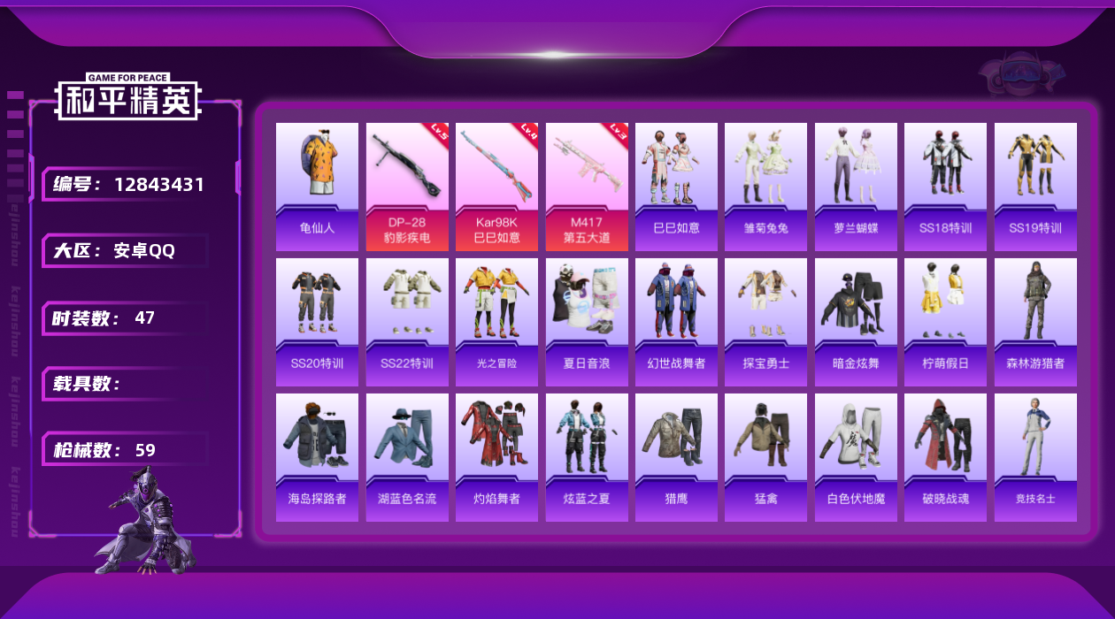 [12843431]安卓 手Q-0粉装-3特效枪-0载具-0粉色飞行器-15149热力值-1王牌印记-47套装-59枪皮 【热门品类】:套装-龟仙人 【粉色枪皮等级】:Kar98K-巳巳如意(四级),M417-第五大道(三级),DP-28-豹影疾电(五级) 【粉色枪皮】:Kar98K-巳巳如意,M417-第五大道,DP-28-豹影疾电 【粉色降落伞】:忍者神龟降落伞 【稀有套装】:套装-龟仙人,套装-巳巳如意,套装-雏菊兔兔,套装-萝兰蝴蝶 【稀有枪皮】:AKM-彩虹符号,AKM-生命誓言,AKM-龙的传人,M16A4-幻世战舞者,M416-糯团青竹,M416-红色方程式,AUG-耀粉歌者,QBZ-彩虹符号,QBZ-洛神天依,M762-天降萌叽,AC-VAL-天降萌叽,蜜獾-天降萌叽,UMP45-生命誓言,UMP45-蓝色火焰,汤姆逊-天降萌叽,汤姆逊-耀粉歌者,P90-巳巳如意,Kar98K-炫彩节奏,SKS-炫彩节奏,VSS-彩虹符号,Mini14-炫彩节奏,S686-生命誓言,S12K-破晓战魂,S12K-幻世战舞者,DBS-彩虹符号,M249-破晓战魂,MG3-幻世战舞者,战术弩-江南烟雨 【其他套装】:套装-SS18特训,套装-SS19特训,套装-SS20特训,套装-SS22特训,套装-光之冒险,套装-夏日音浪,套装-幻世战舞者,套装-探宝勇士,套装-暗金炫舞,套装-柠萌假日,套装-森林游猎者,套装-海岛探路者,套装-湖蓝色名流,套装-灼焰舞者,套装-炫蓝之夏,套装-猎鹰,套装-猛禽,套装-白色伏地魔,套装-破晓战魂,套装-竞技名士,套装-红色运动,套装-绯格组合,套装-缤纷果语,套装-耀粉歌者,套装-虎虎生威吉莉,套装-都市魅力,套装-长空猛禽,套装-飞行日记,套装-魅力单车,套装-鹤鸣,套装-黄色伏地魔,套装-黄色名流,套装-黄色运动,套装-黑色伏地魔,套装-龙的传人,套装-龟仙人 【营地ID】:751459162