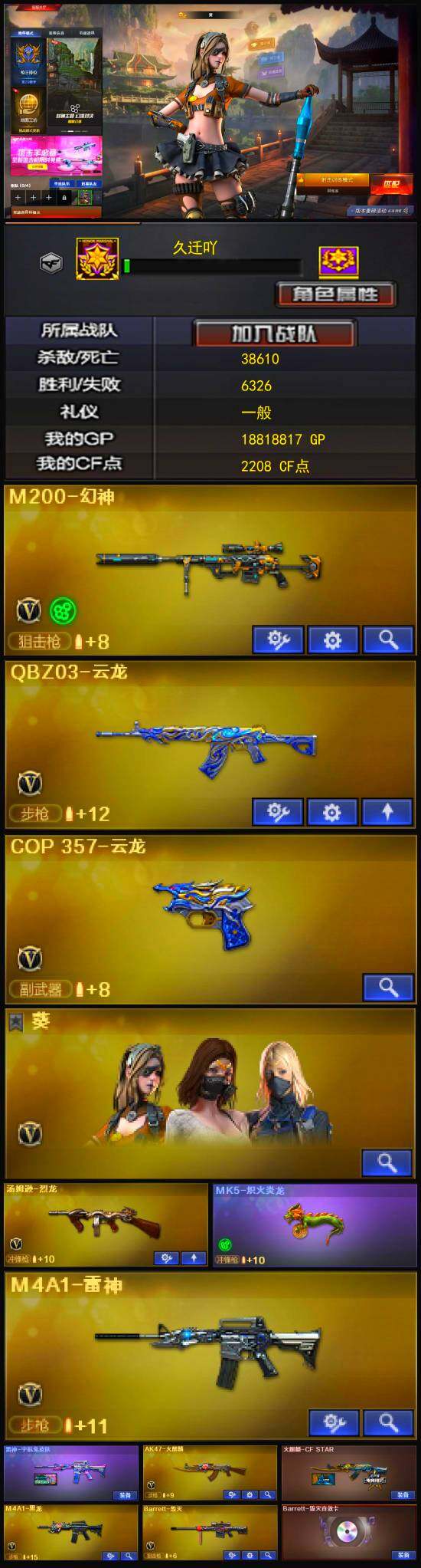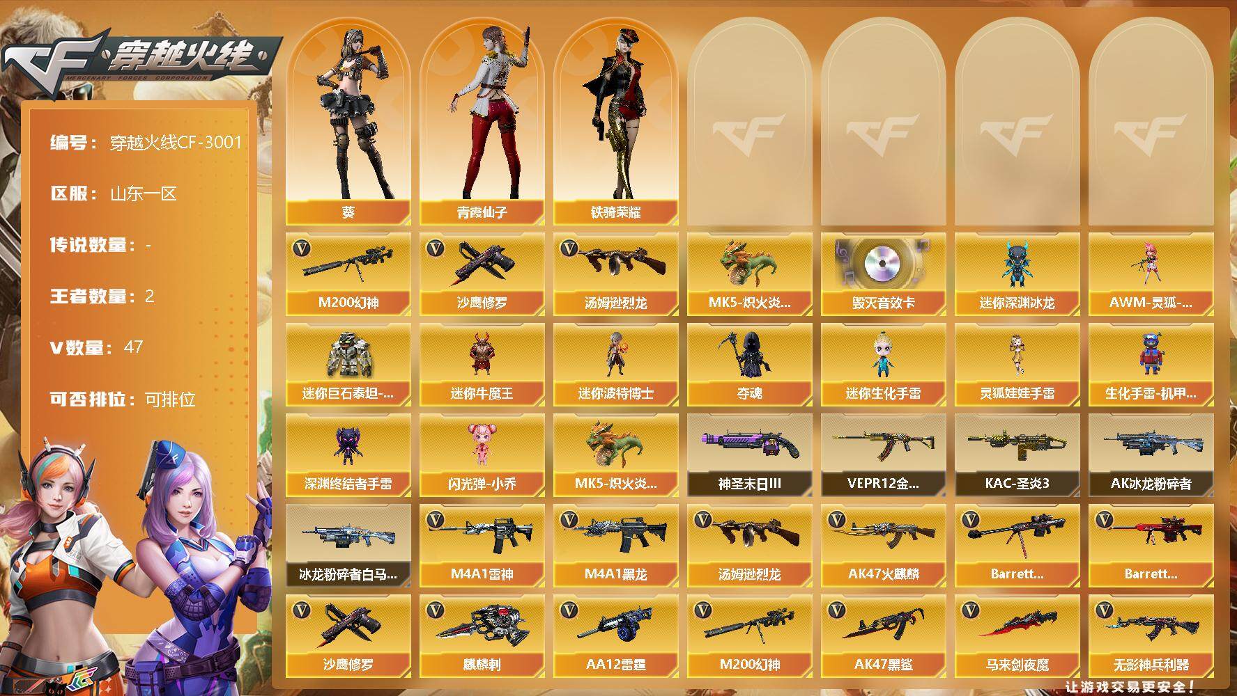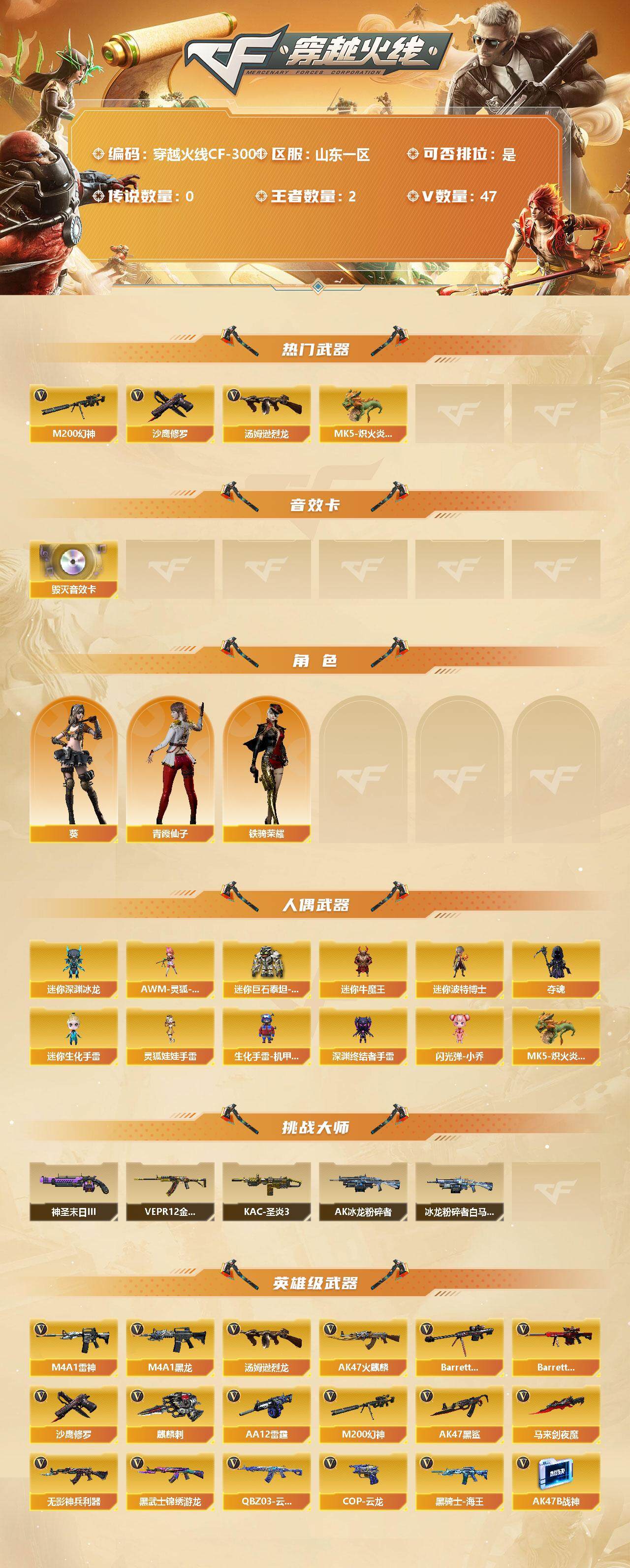 [12843373]山东一区-47V-2王者-0炫金 【热门武器】:M200-幻神,汤姆逊-烈龙,MK5-炽火炎龙,沙鹰-修罗*2 【音效卡】:Barrett-毁灭音效卡 【角色】:葵,铁骑荣耀,青霞仙子 【人偶武器】:MK5-炽火炎龙,AWM-灵狐-15周年嘉年华*2,迷你深渊冰龙*2,迷你巨石泰坦-魔花研究所,迷你牛魔王,迷你波特博士,夺魂*2,迷你生化手雷,灵狐娃娃手雷,生化手雷-机甲核心,深渊终结者手雷,闪光弹-小乔 【挑战大师】:神圣爆裂者-末日III,KAC-圣炎切割者III,VEPR-12-金魔,AK47-冰龙粉碎者,冰龙粉碎者-白马银枪 【英雄级武器】:QBZ03-云龙,COP 357-云龙,马来剑-夜魔,无影-神兵利器,M4A1-雷神,M4A1-黑龙,汤姆逊-烈龙,AK47-火麒麟,Barrett-毁灭,Barrett-极光,AA-12-雷霆,M200-幻神,AK47-黑鲨,黑武士-锦绣游龙,黑骑士-海王*2,AK47-B-战神,沙鹰-修罗*2,麒麟刺 【特殊枪械】:1烈龙