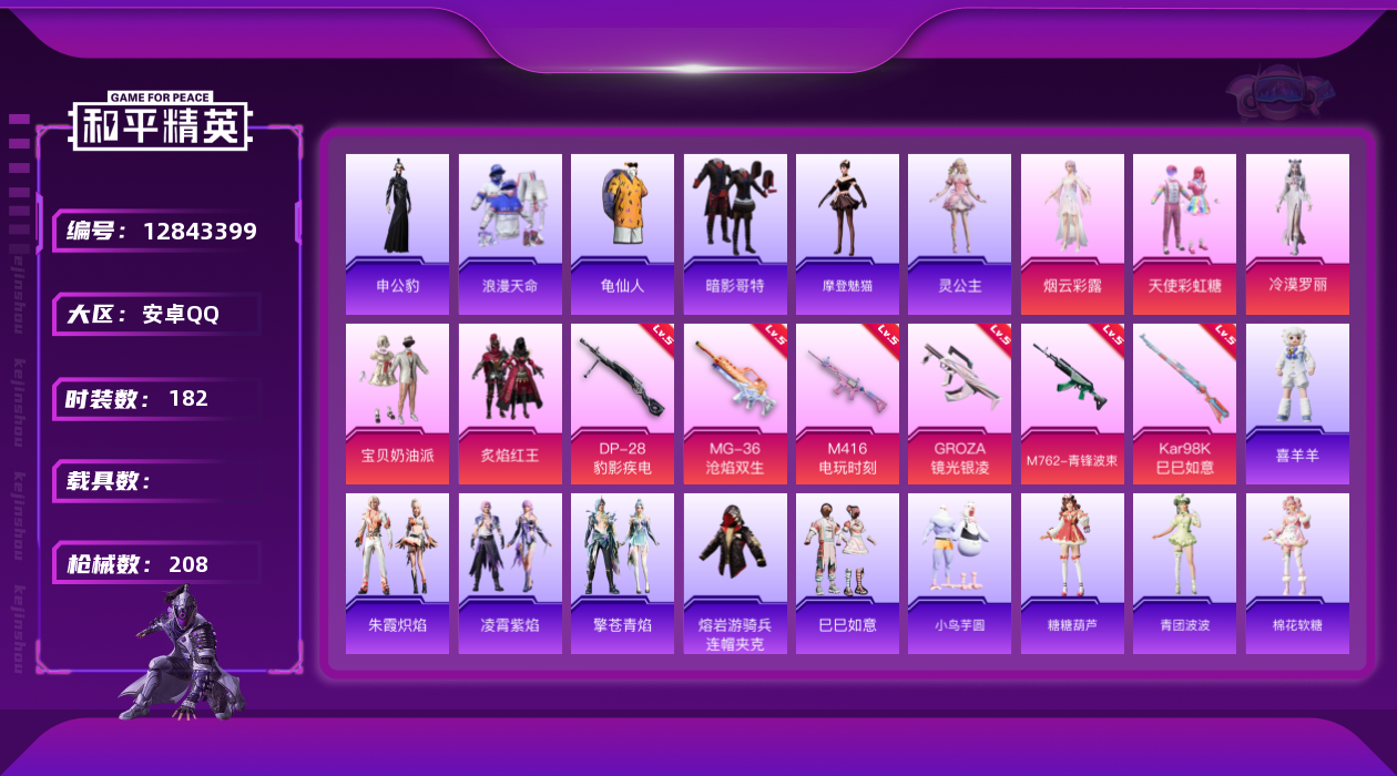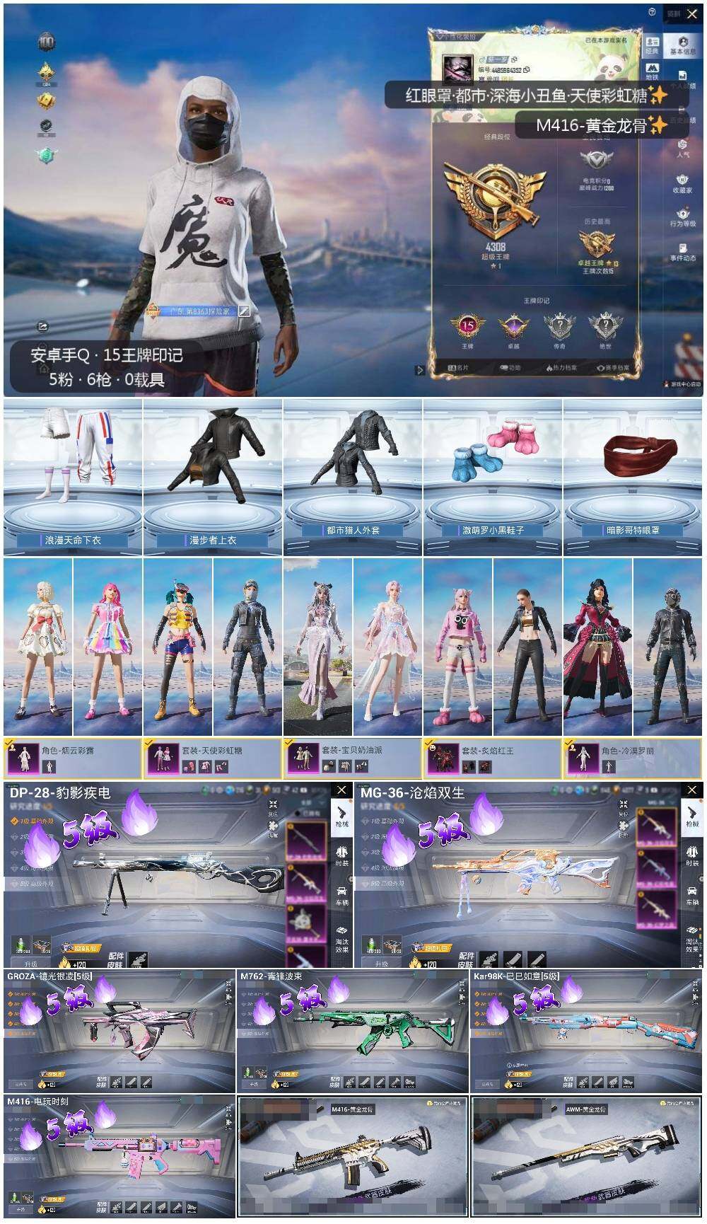 - [11688076]11粉装 10特效枪 10印记 可二次 可修改实名 身法装备:暗影哥特(红眼罩),初号机 觉醒Ver.(新紫螳螂),8号机(新粉螳螂),Mark.06(新蓝螳螂) 优质装备:SCAR-L梦幻火箭,梦幻火箭(新101)(新火箭少女101粉色套装),七级SCAR-L-梦幻火箭,M416电玩时刻,UMP45量子极限,M762-青锋波束,千金淑猫,GROZA-镜光银凌,AUG-许七安,七级AUG-许七安,MK14-甜梦熊击,幻彩电音,MG-36-幻彩电音,Kar98K-巳巳如意 热门装扮:蜜桃特工,歌者泠鸢,严莉莉,美雪,美琪,小蓝,超弦星,初号机 觉醒Ver.(新紫螳螂),迅捷狂鲨,呆萌铁蟹 稀有枪皮:DP-28-豹影疾电 五级特效枪:五级M762-青锋波束,五级UMP45-量子极限,五级GROZA-镜光银凌,五级Kar98K-巳巳如意,五级DP-28-豹影疾电,五级MK14-甜梦熊击,五级M416-电玩时刻 四级特效枪:四级MG-36-幻彩电音 紫色装扮:SS21特训,SS31特训套装,冷焰舞者,极速光影,SS30特训套装,云朵鹅,彩虹兔,雪绒豹,SS33特训套装,顶瓜瓜,时希公主,SS15特训,暗夜傀儡,SS16特训,SS19特训,天籁歌者,瑞龙福将,团圆交子,SS17特训,SS18特训,长空猛禽,雪鹰学院,缤纷果语,虎虎生威吉莉,魅力单车,龙的传人,龟仙人,冰河战士,龙魂突击队,蝶变,香桃花海,黯羽织刑,荒原牛仔,极地朋克,格斗先锋,海岛探路者,滨海假日,滨海厨神,绮丽涂鸦,破蛋小黄鸡,甜蜜告白,福星高照,牛气冲天,灰色格斗者,猛禽,特殊使命,特训学院,小熊娃娃,雏菊兔兔,萝兰蝴蝶,SS29特训,湖畔霞光,星途旅人,纯真浪花,热情海星,曼妙人鱼,SS28特训,粉雾星云,甜酷狙击,8号机(新粉螳螂),Mark.06(新蓝螳螂),光矢逐梦,异域银装,鱼渊荷华,玉兔迎春,燕燕于飞,巳巳如意,青团波波,糖糖葫芦,棉花软糖,竞技名士,绒宝小鹅,暗影哥特(红眼罩),街头风暴,SS25特训,湖雨初晴,焰鹰斗篷,幻羽潜行,SS27特训,智谋强哥,大橘大利,小鸟芋圆,粉恋花,蓝冰羽,紫幽梦,SS32特训服(SS32特训套装),纯白跃动,恋语绒绒,双彩圣灵,冰冻风暴,幸运萌趣趣,光之冒险,海上生明月 优质战备:星途旅人降落伞,金丰海韵降落伞,巴啦啦小魔仙降落伞,江南烟雨降落伞,千金淑
