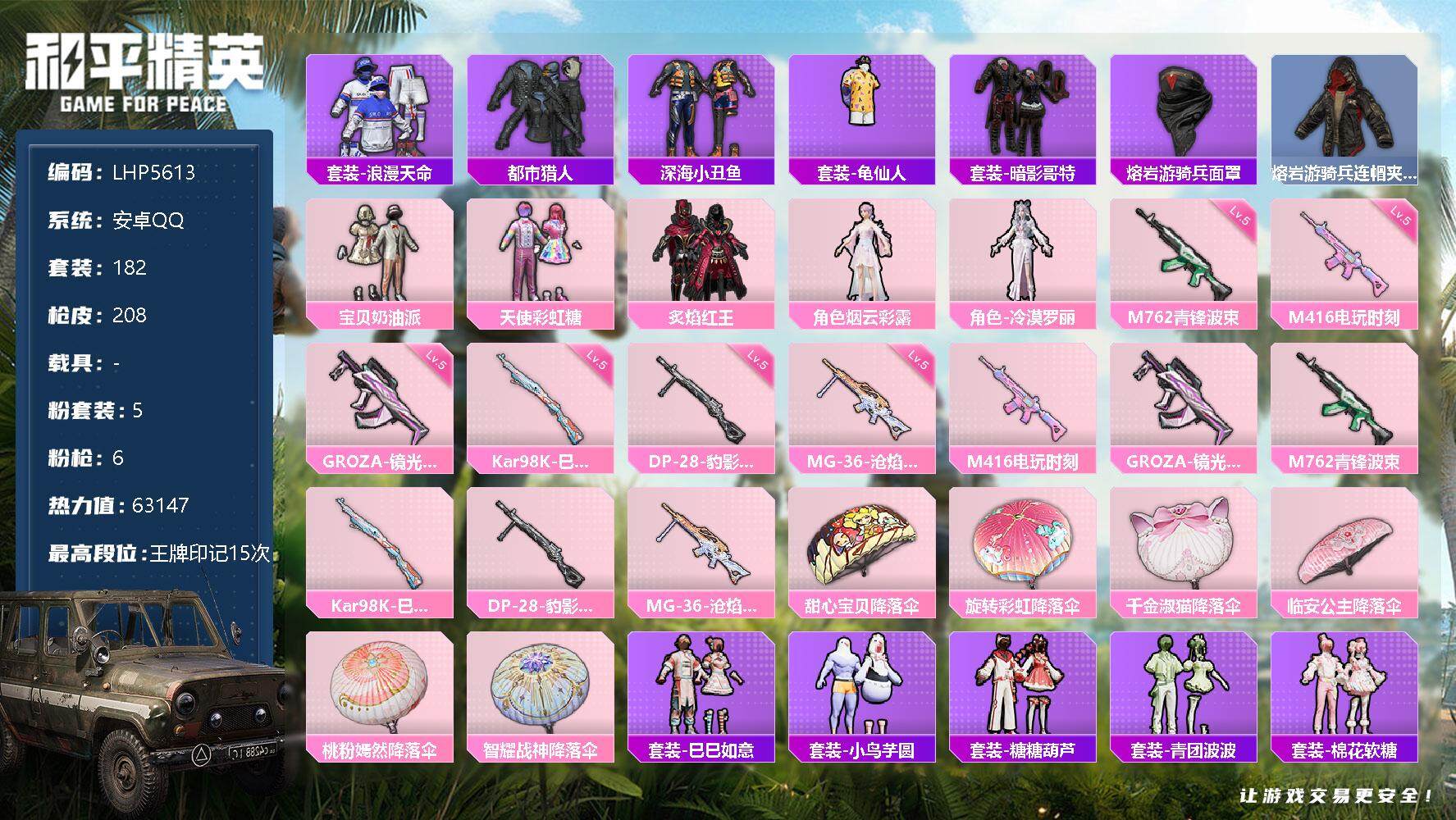 [12843399]地铁满天赋 安卓 手Q-5粉装-6特效枪-1粉色飞行器-6.3w热力值-15王牌印记-182套装-208枪皮【热门品类】:套装-浪漫天命,套装-都市猎人,套装-深海小丑鱼,套装-龟仙人,套装-暗影哥特,熔岩游骑兵面罩,熔岩游骑兵连帽夹克【粉色套装】:粉装-宝贝奶油派,粉装-天使彩虹糖,粉装-炙焰红王,角色-烟云彩露,角色-冷漠罗丽【粉色枪皮等级】:M416-电玩时刻(五级),GROZA-镜光银凌(五级),M762-青锋波束(五级),Kar98K-巳巳如意(五级),DP-28-豹影疾电(五级),MG-36-沧焰双生(五级)