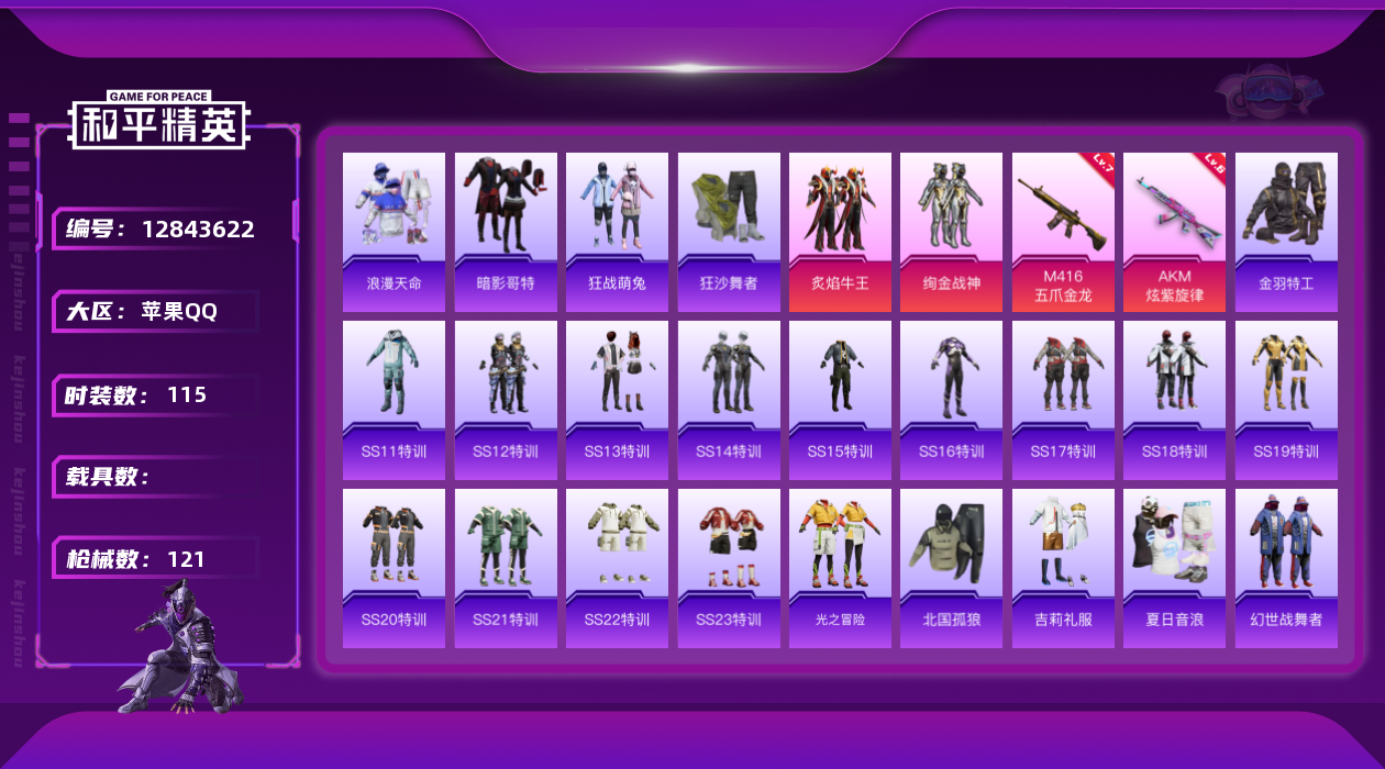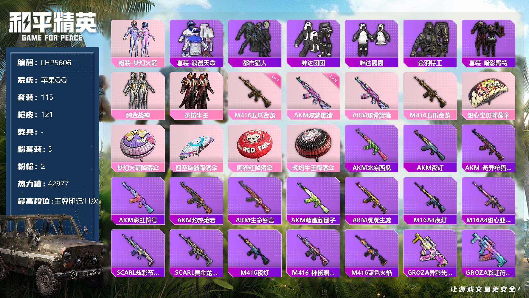 [12843622]苹果 手Q-3粉装-2特效枪-4.2w热力值-11王牌印记-115套装-121枪皮【热门品类】:粉装-梦幻火箭,套装-浪漫天命,套装-都市猎人,套装-胖达团团,套装-胖达圆圆,套装-金羽特工,套装-暗影哥特【粉色套装】:粉装-梦幻火箭,粉装-绚金战神,粉装-炙焰牛王【粉色枪皮等级】:AKM-炫紫旋律(六级),M416-五爪金龙(七级)