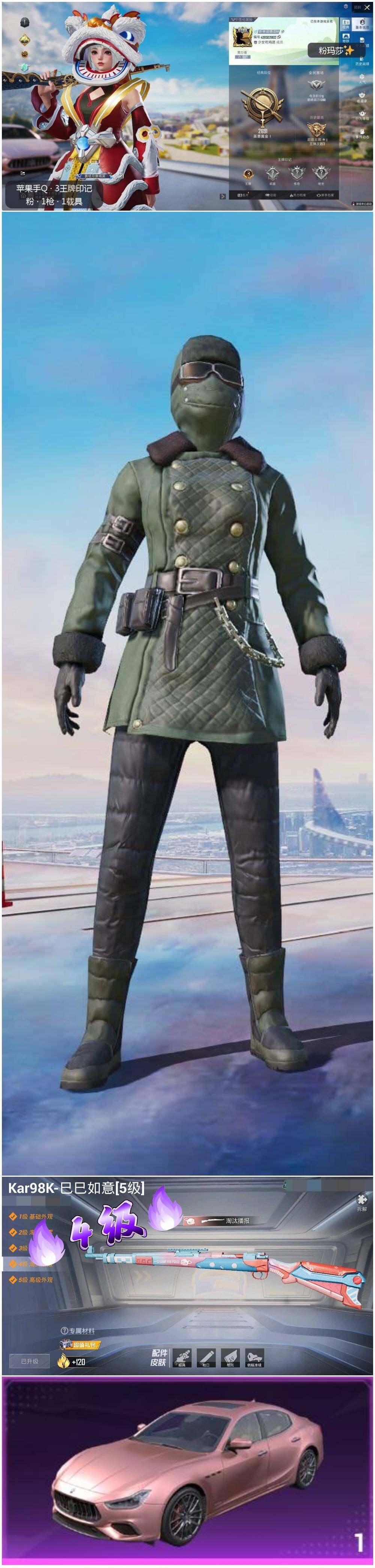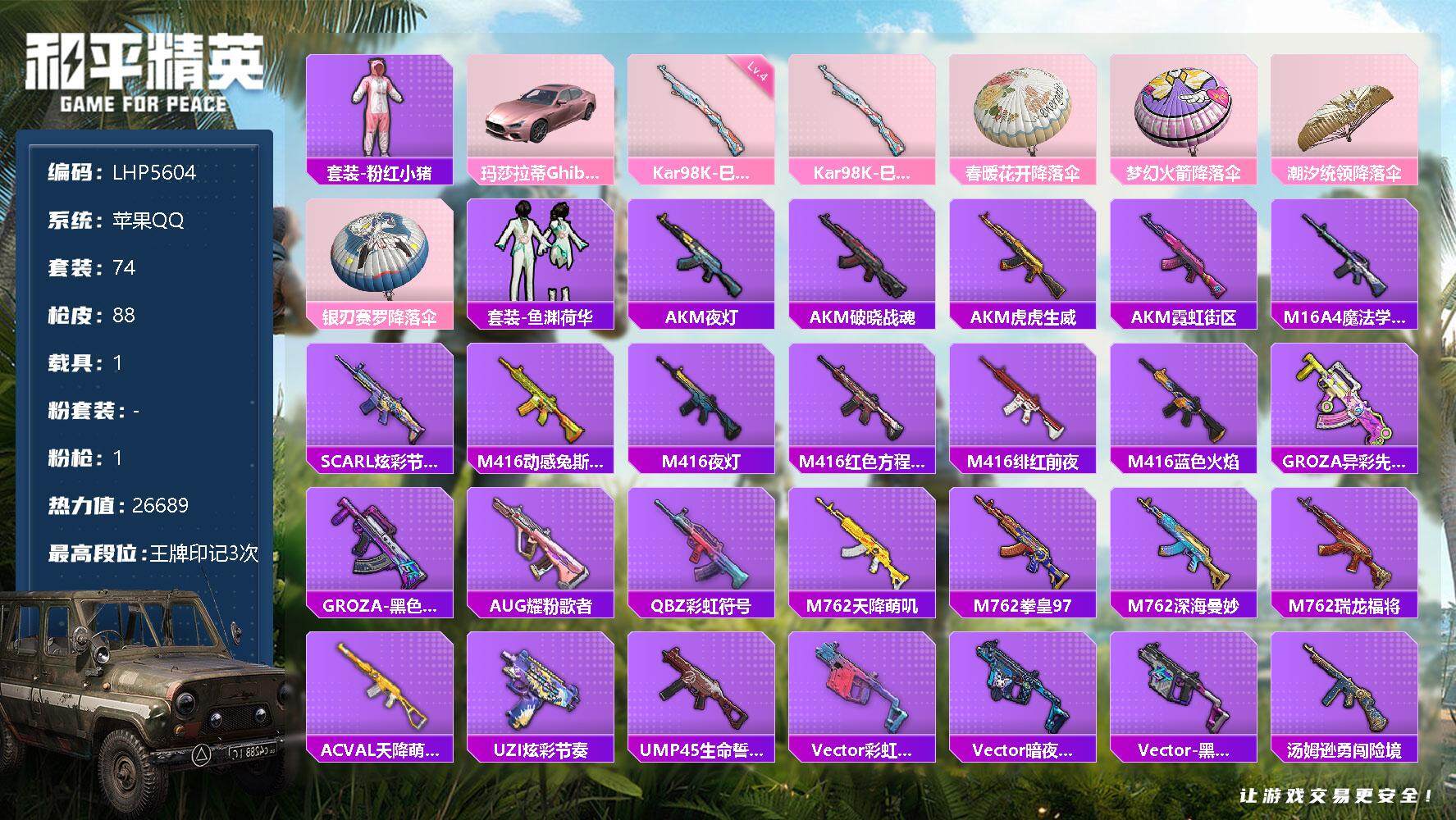 [12843626]苹果 手Q-1特效枪-1载具-2.6w热力值-3王牌印记-74套装-88枪皮【热门品类】:套装-粉红小猪【粉色载具】:玛莎拉蒂Ghibli(粉)【粉色枪皮等级】:Kar98K-巳巳如意(四级)