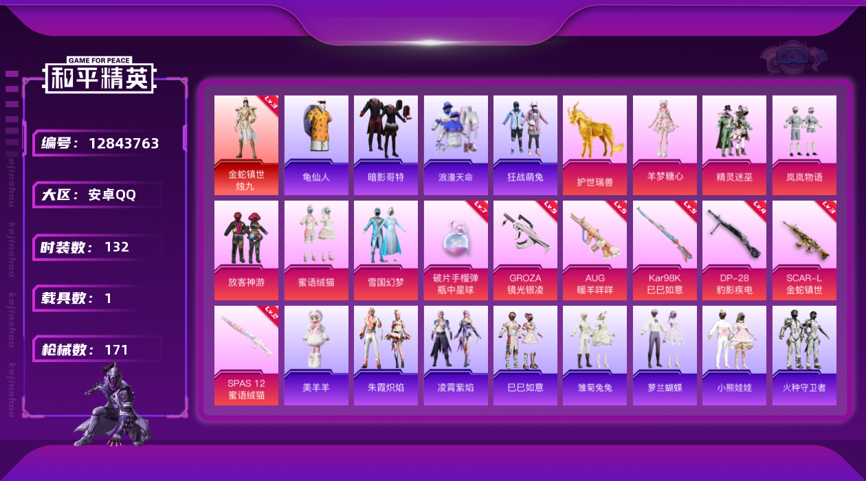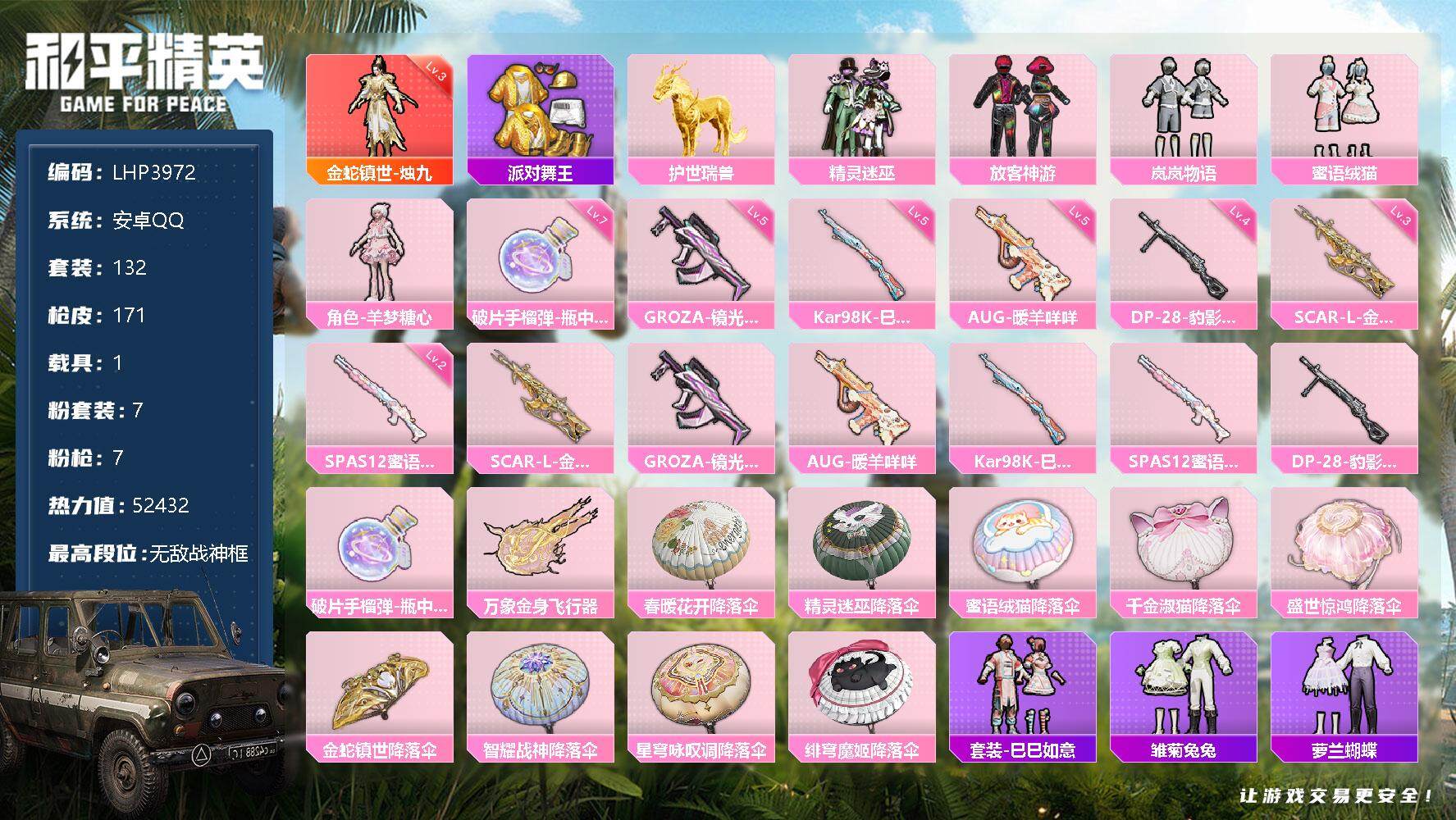 [12843763]包人脸,王者连体219皮肤14传说1典藏 /无敌战神框1/绝世印记1【暑期末清货/特价急出/永久包赔/商品详情看图】:安卓 手Q-1红装-7粉装-7特效枪-1载具-52432热力值-15印记-132套装-171枪皮【热门品类】:套装-派对舞王【角色神装等级】:金蛇镇世-烛九(三级)【稀有载具】:护世瑞兽【特效枪等级】:SCAR-L-金蛇镇世(三级),GROZA-镜光银凌(五级),AUG-暖羊咩咩(五级),Kar98K-巳巳如意(五级),SPAS-12-蜜语绒猫(二级),DP-28-豹影疾电(四级),破片手榴弹-瓶中星球(七级)【优质套装】:粉装-雪国幻梦,粉装-精灵迷巫,粉装-梦幻火箭,粉装-放客神游,粉装-岚岚物语,粉装-蜜语绒猫,角色-羊梦糖心【优质飞行器】:万象金身飞行器