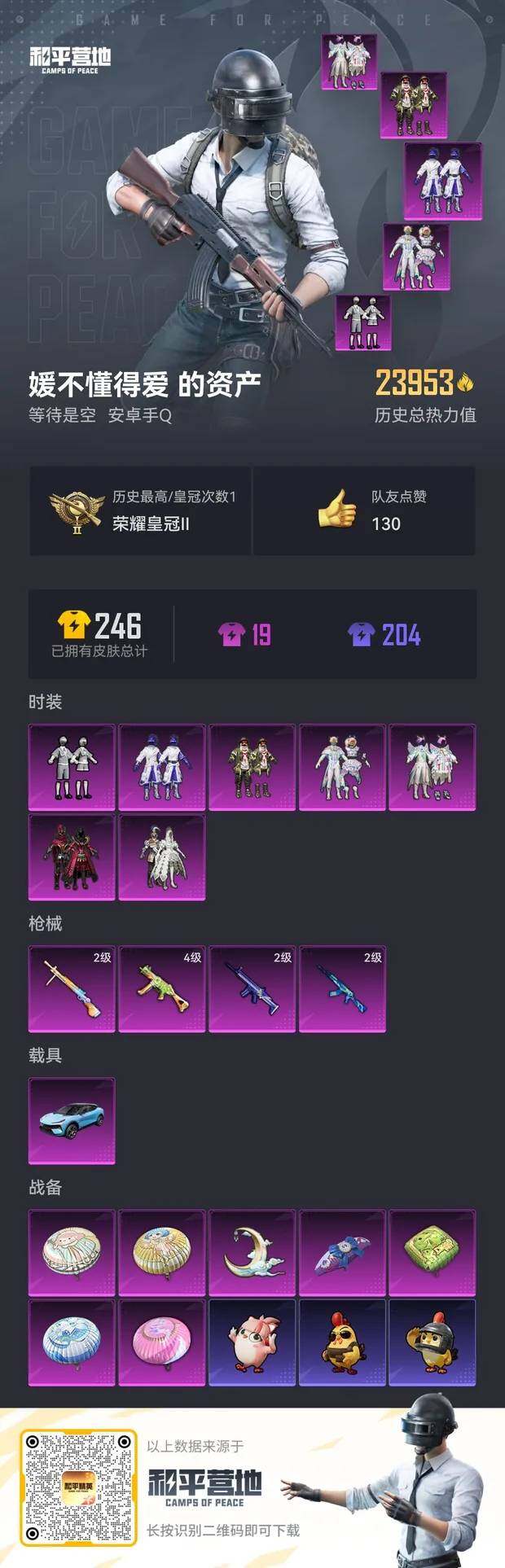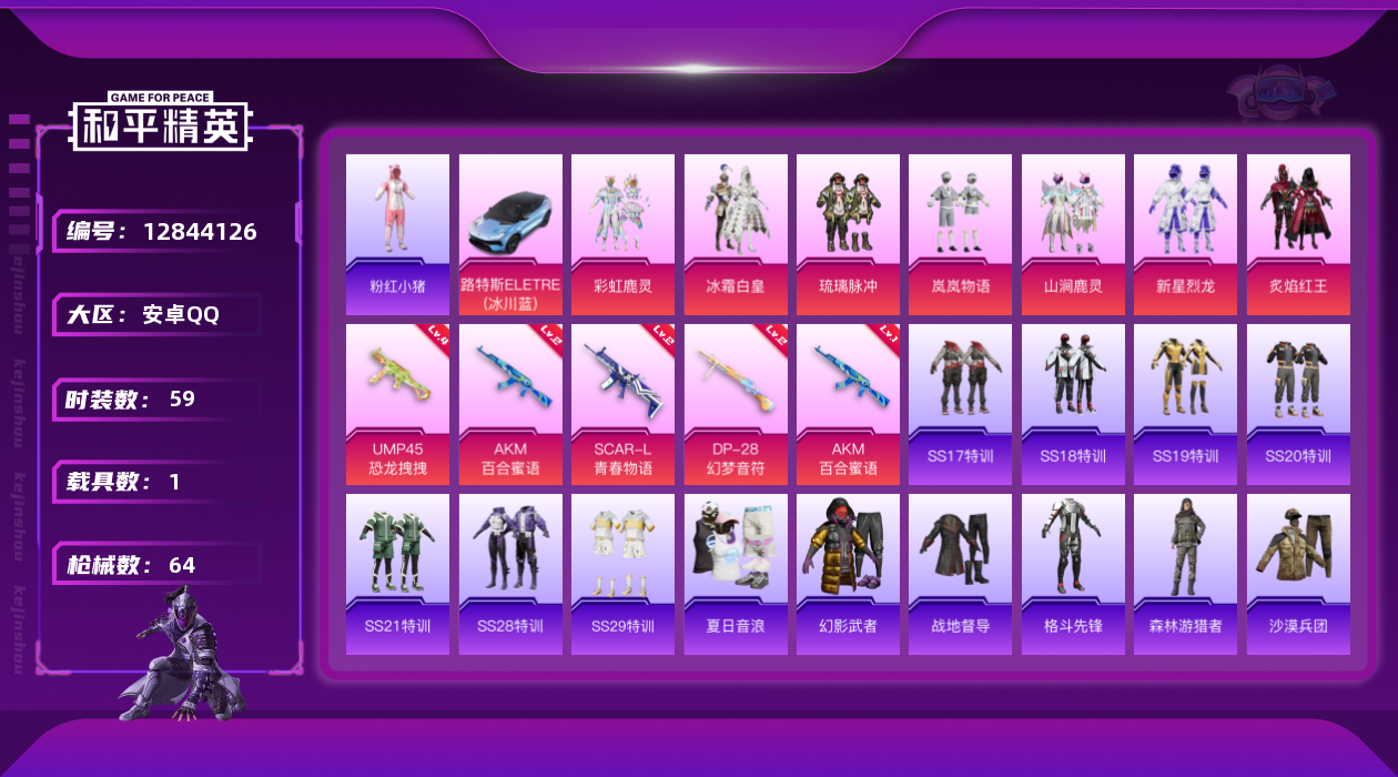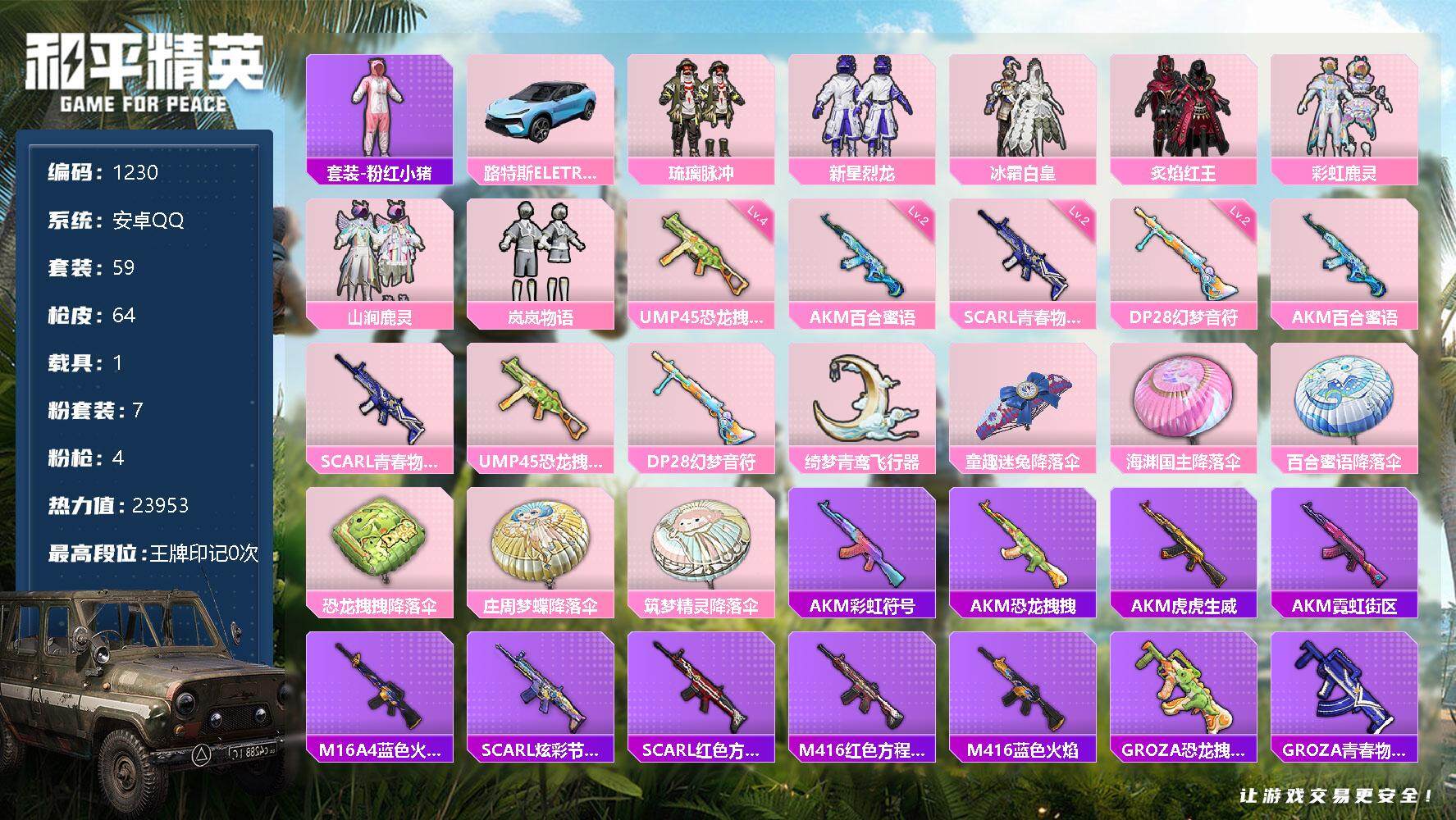 [12844126]安卓 手Q-7粉装-4特效枪-1载具-1粉色飞行器-23953热力值-1王牌印记-59套装-64枪皮