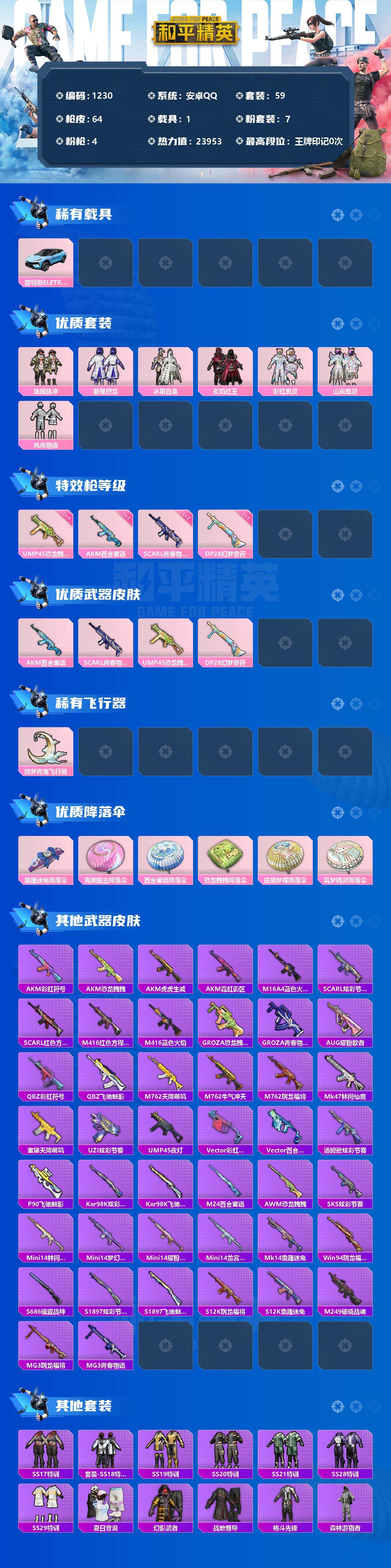 [12844126]安卓 手Q-7粉装-4特效枪-1载具-1粉色飞行器-23953热力值-1王牌印记-59套装-64枪皮 【热门品类】:套装-粉红小猪 【粉色载具】:路特斯ELETRE(冰川蓝) 【粉色套装】:粉装-琉璃脉冲,粉装-新星烈龙,粉装-冰霜白皇,粉装-炙焰红王,粉装-彩虹鹿灵,粉装-山涧鹿灵,粉装-岚岚物语 【粉色枪皮等级】:AKM-百合蜜语(二级),SCAR-L-青春物语(二级),UMP45-恐龙拽拽(四级),DP-28-幻梦音符(二级) 【粉色枪皮】:AKM-百合蜜语,SCAR-L-青春物语,UMP45-恐龙拽拽,DP-28-幻梦音符 【粉色飞行器】:绮梦青鸾飞行器 【粉色降落伞】:童趣迷兔降落伞,海渊国主降落伞,百合蜜语降落伞,恐龙拽拽降落伞,庄周梦蝶降落伞,筑梦精灵降落伞 【稀有枪皮】:AKM-彩虹符号,AKM-恐龙拽拽,AKM-虎虎生威,AKM-霓虹街区,M16A4-蓝色火焰,SCAR-L-炫彩节奏,SCAR-L-红色方程式,M416-红色方程式,M416-蓝色火焰,GROZA-恐龙拽拽,GROZA-青春物语,AUG-耀粉歌者,QBZ-彩虹符号,QBZ-飞驰魅影,M762-天降萌叽,M762-牛气冲天,M762-瑞龙福将,Mk47-林间仙鹿,蜜獾-天降萌叽,UZI-炫彩节奏,UMP45-夜灯,Vector-彩虹符号,Vector-百合蜜语,汤姆逊-炫彩节奏,P90-飞驰魅影,Kar98K-炫彩节奏,Kar98K-飞驰魅影,M24-百合蜜语,AWM-恐龙拽拽,SKS-炫彩节奏,Mini14-林间仙鹿,Mini14-梦幻火箭,Mini14-耀粉歌者,Mini14-龙宫之主,Mk14-童趣迷兔,Win94-瑞龙福将,S686-暗翼战神,S1897-炫彩节奏,S1897-飞驰魅影,S12K-瑞龙福将,S12K-童趣迷兔,M249-破晓战魂,MG3-瑞龙福将,MG3-青春物语 【其他套装】:套装-SS17特训,套装-SS18特训,套装-SS19特训,套装-SS20特训,套装-SS21特训,套装-SS28特训,套装-SS29特训,套装-夏日音浪,套装-幻影武者,套装-战地督导,套装-格斗先锋,套装-森林游猎者,套装-沙漠兵团,套装-深蓝色名流,套装-滨海假日,套装-灼焰舞者,套装-炫蓝之夏,套装-牛气冲天,套装-牛气满满,套装-特训学院,套装-猎鹰,套装-猛禽,套装-白色伏