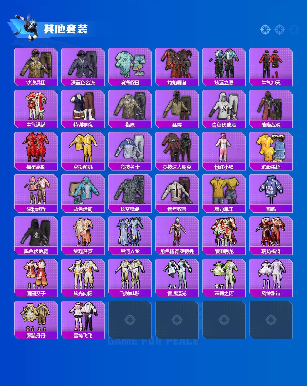【其他套装】:套装-SS17特训,套装-SS18特训,套装-SS19特训,套装-SS20特训,套装-SS21特训,套装-SS28特训,套装-SS29特训,套装-夏日音浪,套装-幻影武者,套装-战地督导,套装-格斗先锋,套装-森林游猎者,套装-沙漠兵团,套装-深蓝色名流,套装-滨海假日,套装-灼焰舞者,套装-炫蓝之夏,套装-牛气冲天,套装-牛气满满,套装-特训学院,套装-猎鹰,套装-猛禽,套装-白色伏