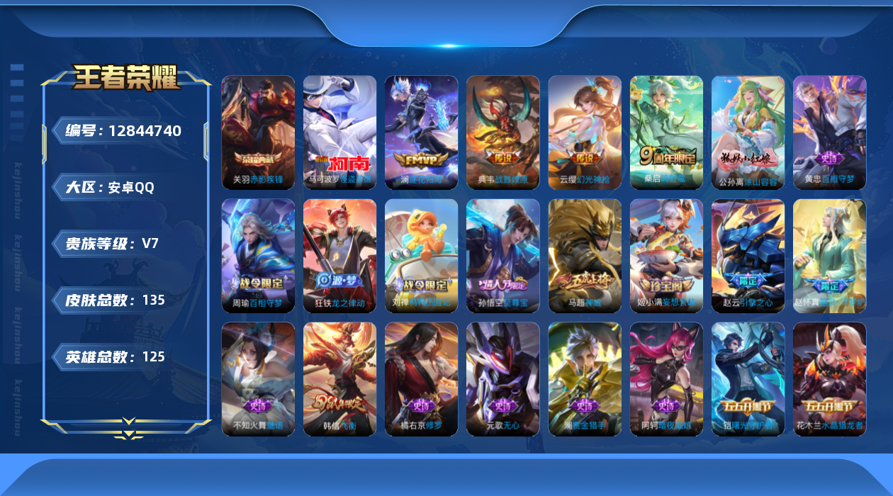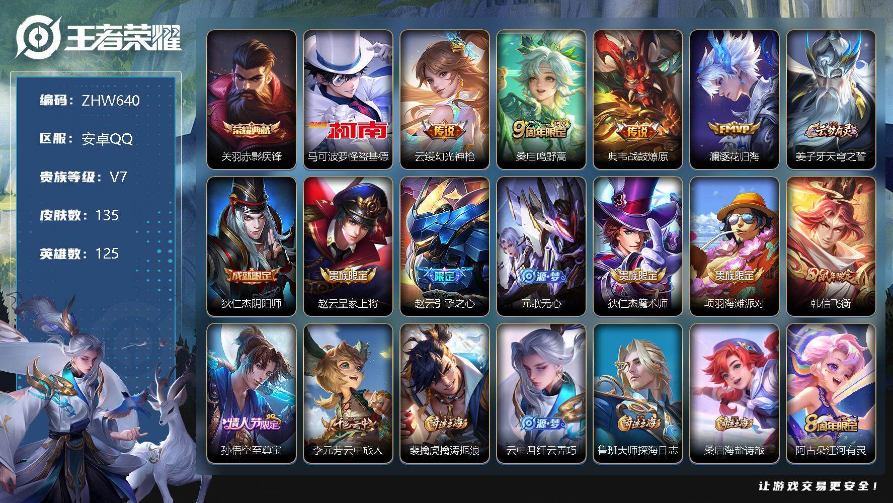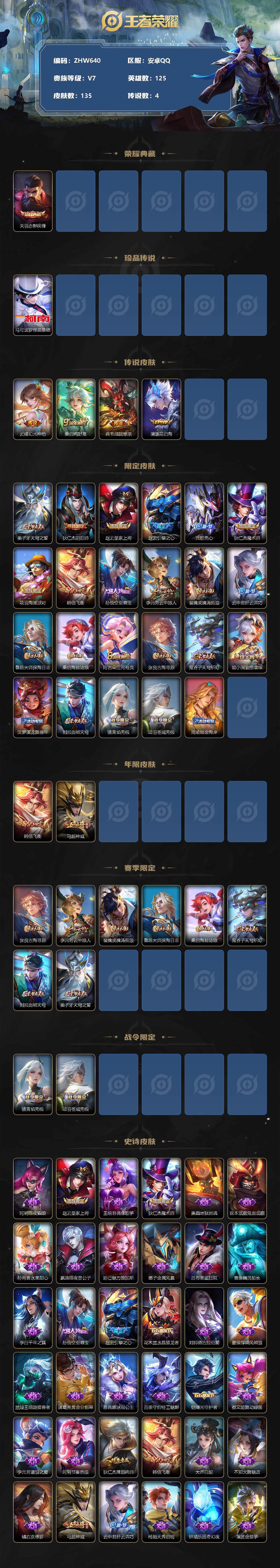 [12844740]安卓Q-V7-最强王者段位-125英雄-135皮肤-1典藏-1珍品传说-4传说-49史诗 【荣耀典藏】:关羽赤影疾锋 【珍品传说】:马可波罗怪盗基德 【传说皮肤】:云缨幻光神枪,桑启鸣野蒿,典韦战鼓燎原,澜逐花归海 【限定皮肤】:姜子牙天穹之誓,狄仁杰阴阳师,赵云皇家上将,赵云引擎之心,元歌无心,狄仁杰魔术师,项羽海滩派对,韩信飞衡,孙悟空至尊宝,李元芳云中旅人,裴擒虎擒涛扼浪,云中君纤云弄巧,鲁班大师探海日志,桑启海盐诗旅,阿古朵江河有灵,张良古海寻踪,鬼谷子天穹祈灯,姬小满妄想食味,沈梦溪龙舞盛年,刘邦剑破天穹,镜青焰无极,项羽苍威无极,周瑜熔金海岸 【年限皮肤】:韩信飞衡,马超神威 【赛季限定】:张良古海寻踪,李元芳云中旅人,裴擒虎擒涛扼浪,鲁班大师探海日志,桑启海盐诗旅,鬼谷子天穹祈灯,刘邦剑破天穹,姜子牙天穹之誓 【战令限定】:镜青焰无极,项羽苍威无极 【史诗皮肤】:阿轲暗夜猫娘,赵云皇家上将,王昭君偶像歌手,狄仁杰魔术师,廉颇地狱岩魂,宫本武藏鬼剑武藏,孙尚香水果甜心,嬴政暗夜贵公子,妲己魅力维加斯,墨子金属风暴,吕布圣诞狂欢,曹操幽灵船长,李白千年之狐,孙悟空至尊宝,赵云引擎之心,花木兰水晶猎龙者,刘邦德古拉伯爵,夏侯惇乘风破浪,兰陵王暗隐猎兽者,诸葛亮黄金分割率,雅典娜冰冠公主,百里守约特工魅影,铠曙光守护者,蔡文姬舞动绿茵,李元芳逐浪之夏,阿轲节奏热浪,狄仁杰鹰眼统帅,韩信飞衡,大乔白蛇,不知火舞魅语,橘右京修罗,马超神威,云中君纤云弄巧,杨戬天秀启明,钟馗乐园奇幻夜,澜赏金猎手,元歌无心,阿古朵江河有灵,姬小满妄想食味,镜青焰无极,百里守约百相守梦,牛魔星界战将,孙膑茶境仙,赵怀真器灵浮梦炉,刘禅鸭鸭历险记,狂铁龙之律动,周瑜百相守梦,黄忠百相守梦,公孙离涂山容容 【其他皮肤】:项羽海滩派对,韩信教廷特使,韩信街头霸王,露娜哥特玫瑰,赵云忍炎影,芈月红桃皇后,白起白色死神,扁鹊化身博士,宫本武藏未来纪元,妲己少女阿狸,典韦黄金武士,亚瑟死亡骑士,花木兰兔女郎,甄姬花好人间,刘备万事如意,后羿阿尔法小队,狄仁杰阴阳师,刘备汉昭烈帝,关羽龙腾万里,钟无艳海滩丽影,老夫子功夫老勺,李白敏锐之力,大乔守护之力,刘禅秘密基地,马可波罗潮玩牛仔,李元芳云中旅人,桑启海盐诗旅,猪八戒潮玩探月行,裴擒虎擒涛扼浪,太乙真人劲辣红锅,鲁班大师探海日志,李元芳妄想特