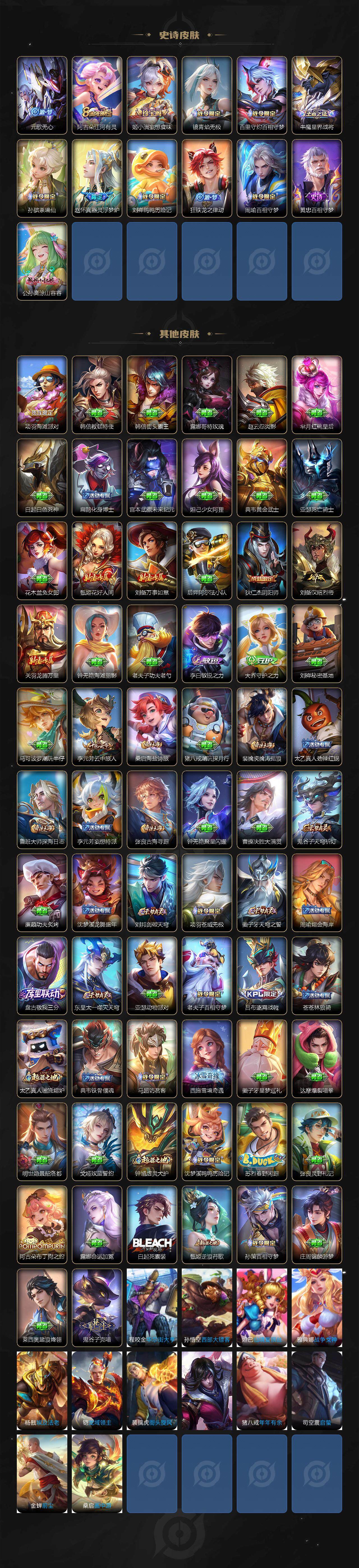 【史诗皮肤】:阿轲暗夜猫娘,赵云皇家上将,王昭君偶像歌手,狄仁杰魔术师,廉颇地狱岩魂,宫本武藏鬼剑武藏,孙尚香水果甜心,嬴政暗夜贵公子,妲己魅力维加斯,墨子金属风暴,吕布圣诞狂欢,曹操幽灵船长,李白千年之狐,孙悟空至尊宝,赵云引擎之心,花木兰水晶猎龙者,刘邦德古拉伯爵,夏侯惇乘风破浪,兰陵王暗隐猎兽者,诸葛亮黄金分割率,雅典娜冰冠公主,百里守约特工魅影,铠曙光守护者,蔡文姬舞动绿茵,李元芳逐浪之夏,阿轲节奏热浪,狄仁杰鹰眼统帅,韩信飞衡,大乔白蛇,不知火舞魅语,橘右京修罗,马超神威,云中君纤云弄巧,杨戬天秀启明,钟馗乐园奇幻夜,澜赏金猎手,元歌无心,阿古朵江河有灵,姬小满妄想食味,镜青焰无极,百里守约百相守梦,牛魔星界战将,孙膑茶境仙,赵怀真器灵浮梦炉,刘禅鸭鸭历险记,狂铁龙之律动,周瑜百相守梦,黄忠百相守梦,公孙离涂山容容