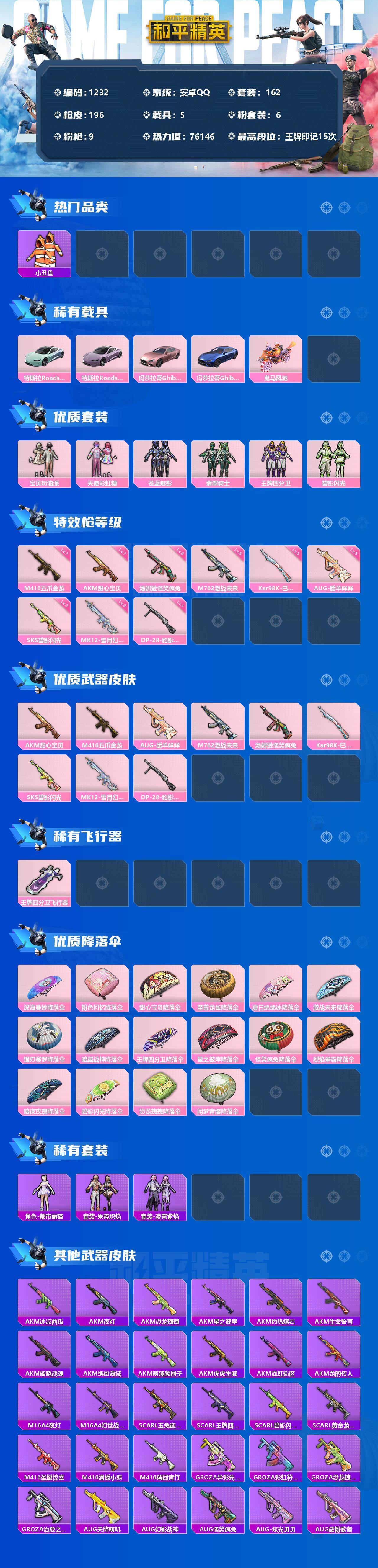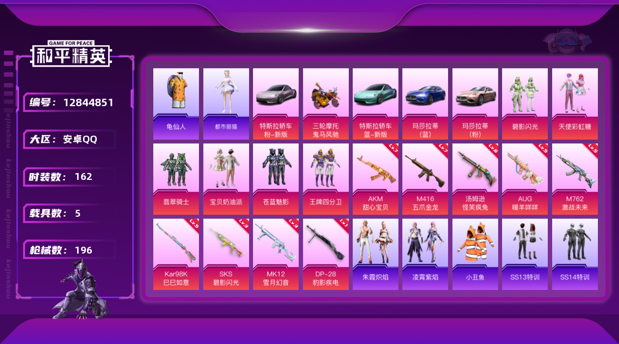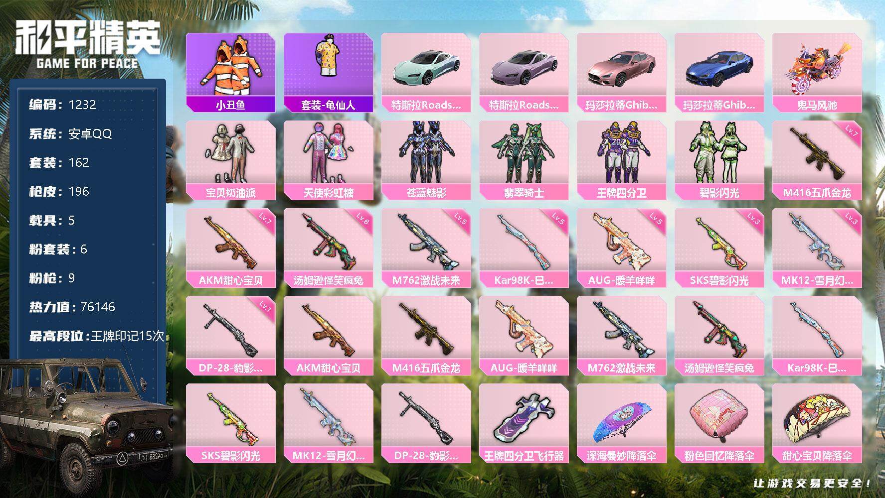 [12844851]安卓 手Q-6粉装-9特效枪-5载具-1粉色飞行器-76146热力值-15王牌印记-162套装-196枪皮 【热门品类】:套装-小丑鱼,套装-龟仙人 【粉色载具】:特斯拉Roadster(水滴蓝),特斯拉Roadster(沁心粉),玛莎拉蒂Ghibli(粉),玛莎拉蒂Ghibli(蓝),鬼马风驰 【粉色套装】:粉装-宝贝奶油派,粉装-天使彩虹糖,粉装-苍蓝魅影,粉装-翡翠骑士,粉装-王牌四分卫,粉装-碧影闪光 【粉色枪皮等级】:AKM-甜心宝贝(七级),M416-五爪金龙(七级),AUG-暖羊咩咩(五级),M762-激战未来(五级),汤姆逊-怪笑疯兔(六级),Kar98K-巳巳如意(五级),SKS-碧影闪光(三级),MK12-雪月幻音(三级),DP-28-豹影疾电(一级) 【粉色枪皮】:AKM-甜心宝贝,M416-五爪金龙,AUG-暖羊咩咩,M762-激战未来,汤姆逊-怪笑疯兔,Kar98K-巳巳如意,SKS-碧影闪光,MK12-雪月幻音,DP-28-豹影疾电 【粉色飞行器】:王牌四分卫飞行器 【粉色降落伞】:深海曼妙降落伞,粉色回忆降落伞,甜心宝贝降落伞,至尊龙雀降落伞,夏日绵绵冰降落伞,激战未来降落伞,银刃赛罗降落伞,暗翼战神降落伞,王牌四分卫降落伞,星之彼岸降落伞,怪笑疯兔降落伞,烈焰拳霸降落伞,暗夜玫瑰降落伞,碧影闪光降落伞,恐龙拽拽降落伞,闲梦青缨降落伞 【稀有套装】:套装-龟仙人,角色-都市丽猫,套装-朱霞炽焰,套装-凌霄紫焰 【稀有枪皮】:AKM-冰凉西瓜,AKM-夜灯,AKM-恐龙拽拽,AKM-星之彼岸,AKM-灼热熔岩,AKM-生命誓言,AKM-破晓战魂,AKM-缤纷海域,AKM-萌趣颜团子,AKM-虎虎生威,AKM-霓虹街区,AKM-龙的传人,M16A4-夜灯,M16A4-幻世战舞者,SCAR-L-玉兔迎春,SCAR-L-王牌四分卫,SCAR-L-碧影闪光,SCAR-L-黄金龙骨,M416-圣诞惊喜,M416-滑板小狐,M416-糯团青竹,GROZA-异彩先驱,GROZA-彩虹符号,GROZA-恐龙拽拽,GROZA-治愈之星,AUG-天降萌叽,AUG-幻影战神,AUG-怪笑疯兔,AUG-炫光贝贝,AUG-耀粉歌者,AUG-青春冒险家,QBZ-彩虹符号,QBZ-暗翼战神,QBZ-赛罗,QBZ-飞驰魅影,M762-天降萌叽,M762-瑞龙福将,M7