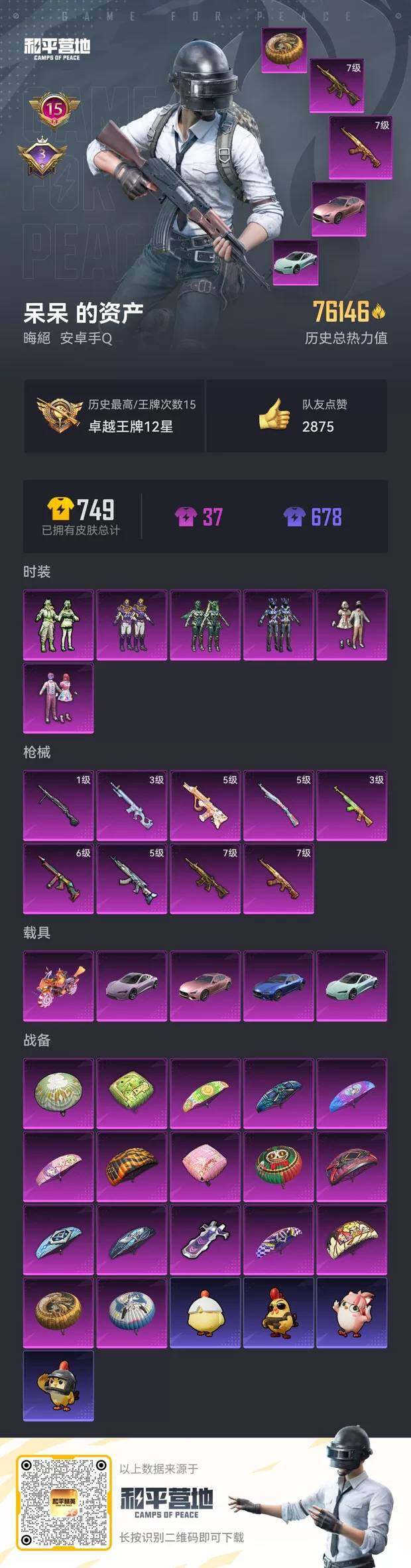 [12844851]安卓 手Q-6粉装-9特效枪-5载具-1粉色飞行器-76146热力值-15王牌印记-162套装-196枪皮
