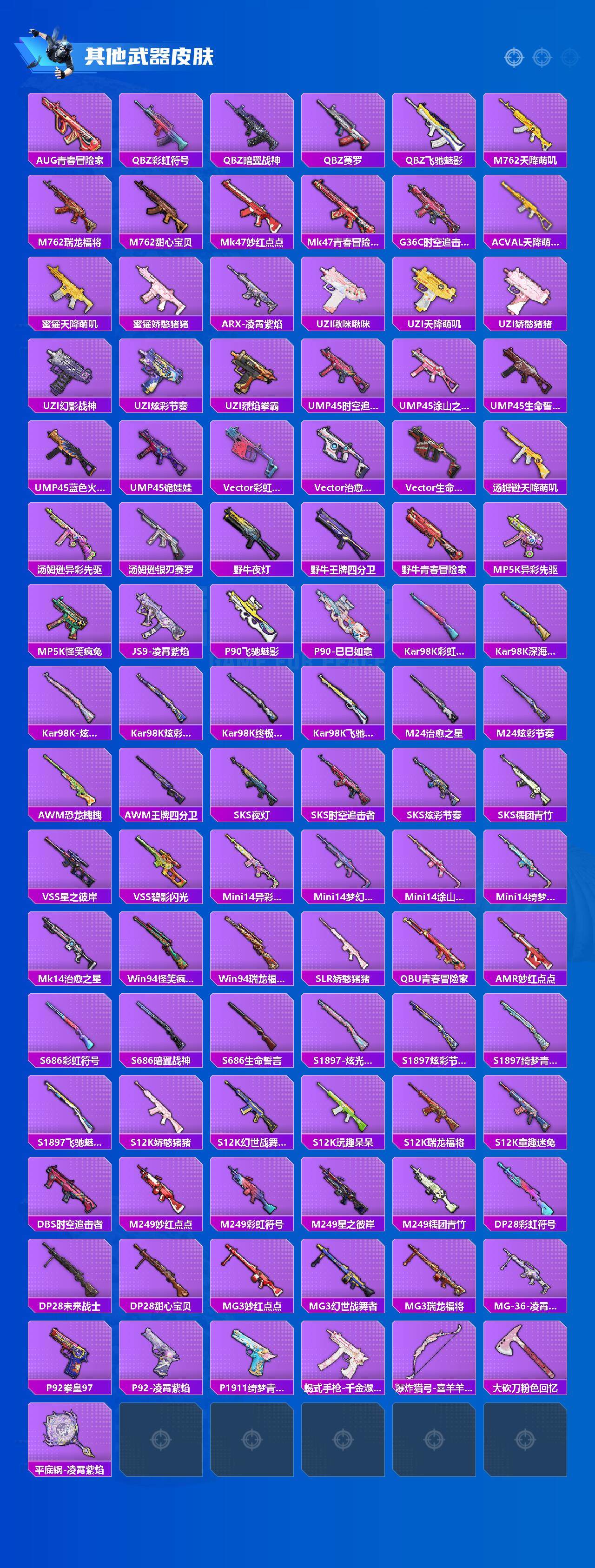 【粉色枪皮】:AKM-甜心宝贝,M416-五爪金龙,AUG-暖羊咩咩,M762-激战未来,汤姆逊-怪笑疯兔,Kar98K-巳巳如意,SKS-碧影闪光,MK12-雪月幻音,DP-28-豹影疾电