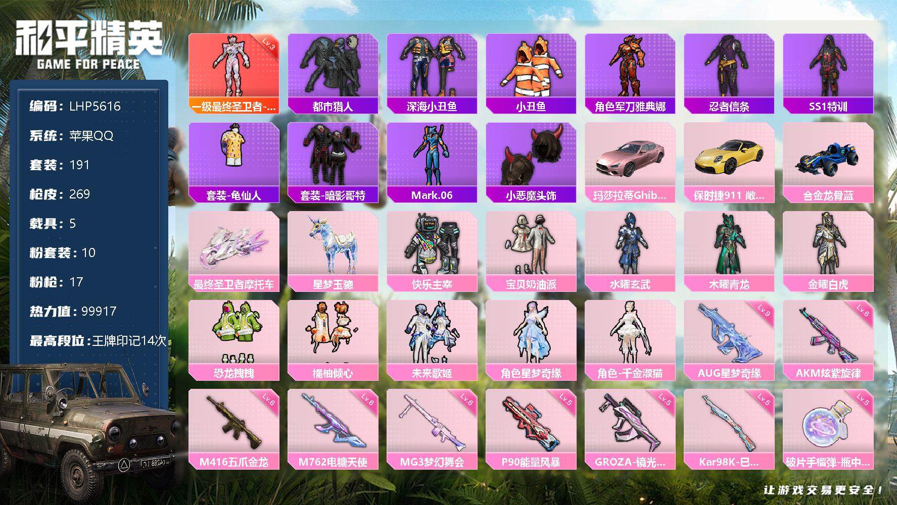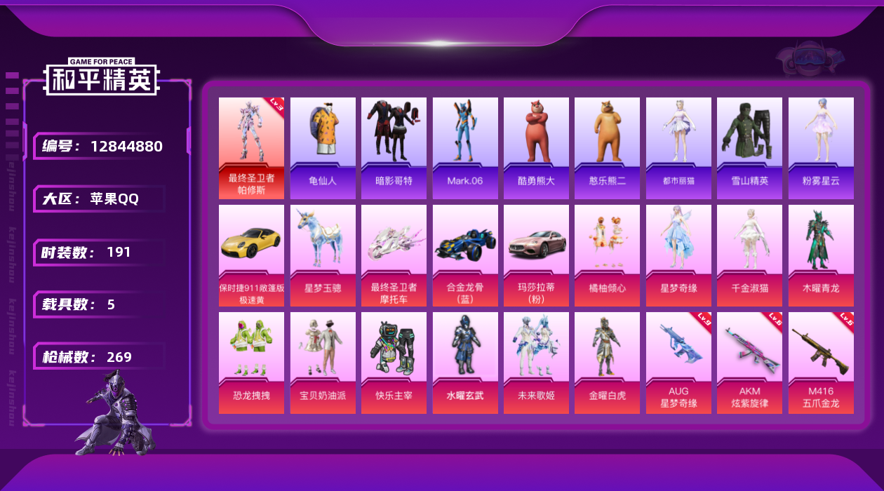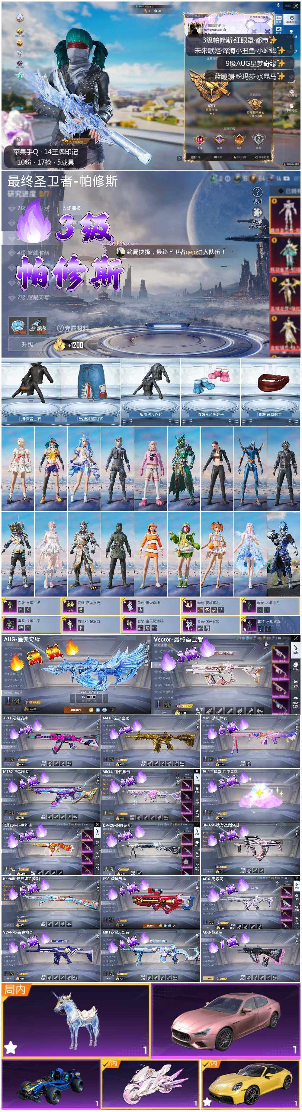 [12844880]素材身法号/地铁满天赋/AUG-星梦奇缘(九级) 苹果 手Q-1神装-10粉装-17特效枪-5载具-1粉色飞行器-9.9w热力值-14王牌印记-191套装-269枪皮【红色神装等级】:最终圣卫者-帕修斯(三级)【热门品类】:套装-都市猎人,套装-深海小丑鱼,套装-小丑鱼,角色-军刀雅典娜,套装-忍者信条,套装-SS1特训,套装-龟仙人,套装-暗影哥特,角色-Mark.06,小恶魔头饰【粉色载具】:玛莎拉蒂Ghibli(粉),保时捷911 敞篷版(极速黄),合金龙骨(蓝),最终圣卫者摩托车,星梦玉骢【粉色套装】:粉装-快乐主宰,粉装-宝贝奶油派,粉装-水曜玄武,粉装-木曜青龙,粉装-金曜白虎,粉装-恐龙拽拽,粉装-橘柚倾心,粉装-未来歌姬,角色-星梦奇缘,角色-千金淑猫【粉色枪皮等级】:AKM-炫紫旋律(六级),SCAR-L-青春物语(四级),M416-五爪金龙(六级),GROZA-镜光银凌(五级),AUG-超新星(一级),AUG-星梦奇缘(九级),M762-电糖天使(六级),ARX-无垠阁(四级),Vector-最终圣卫者(三级),汤姆逊-热量炸弹(五级),P90-能量风暴(五级),Kar98K-巳巳如意(五级),Mk14-甜梦熊击(五级),MK12-雪月幻音(四级),DP-28-豹影疾电(五级),MG3-梦幻舞会(六级),破片手榴弹-瓶中星球(五级)【粉色飞行器】:终晖之翼飞行器