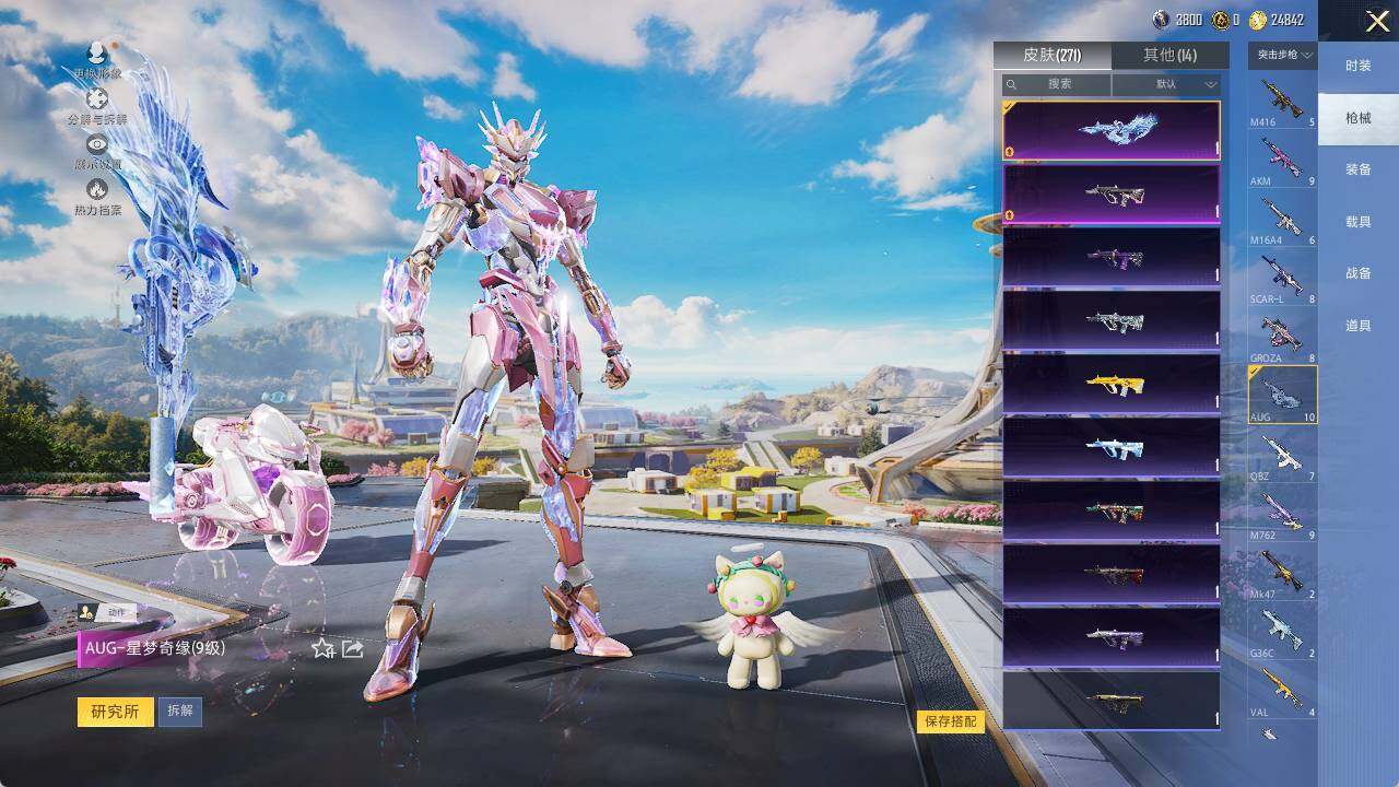 AKM-炫紫旋律,SCAR-L-青春物语,M416-五爪金龙,GROZA-镜光银凌,AUG-超新星,AUG-星梦奇缘,M762-电糖天使,P90-能量风暴,Kar98K-巳巳如意,MK12-雪月幻音,MG3-梦幻舞会