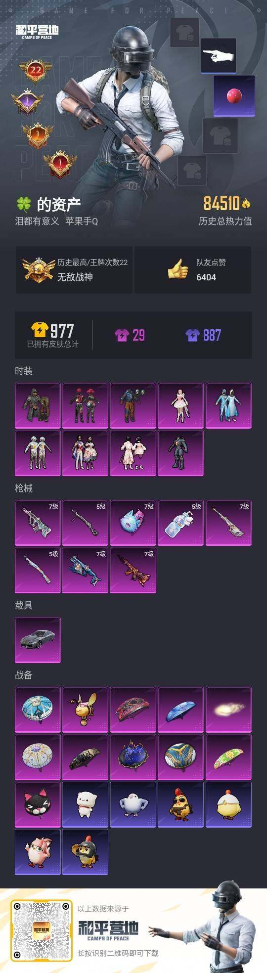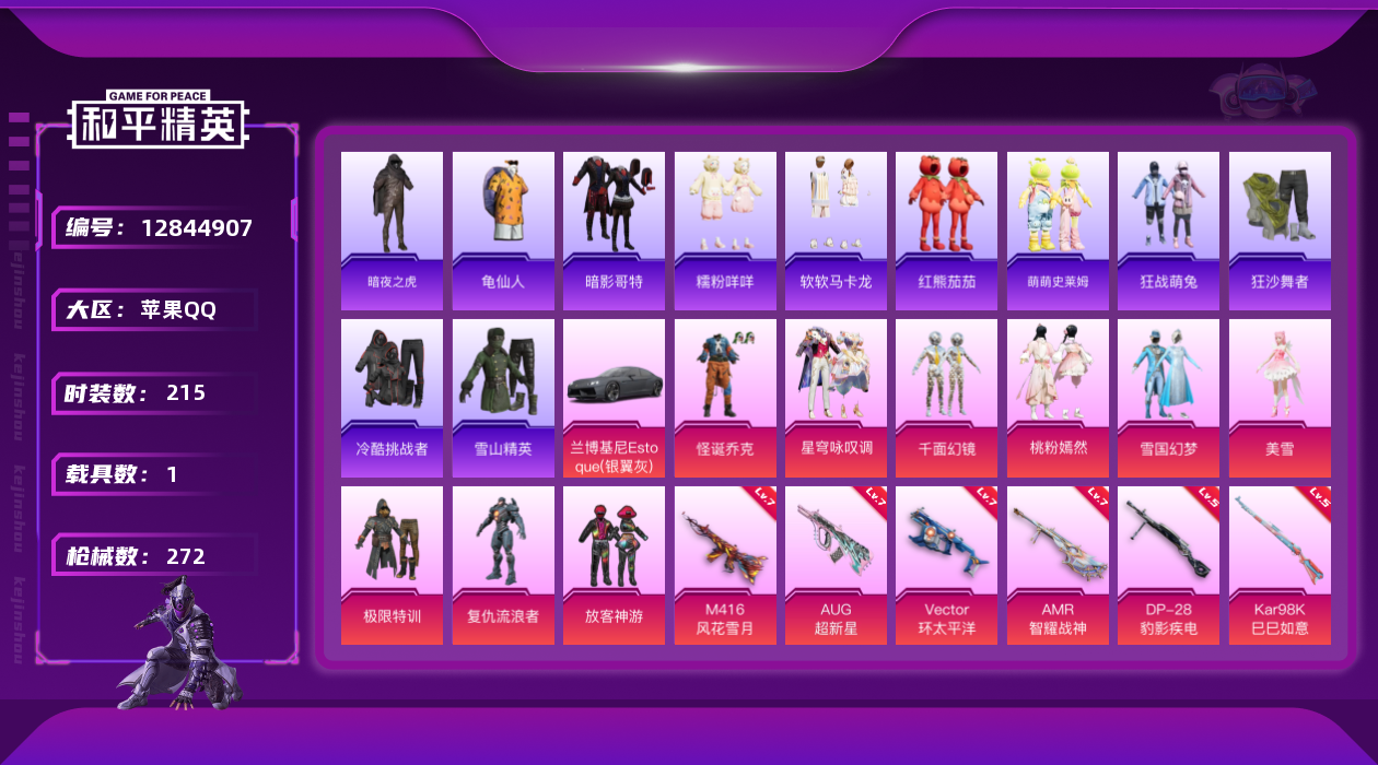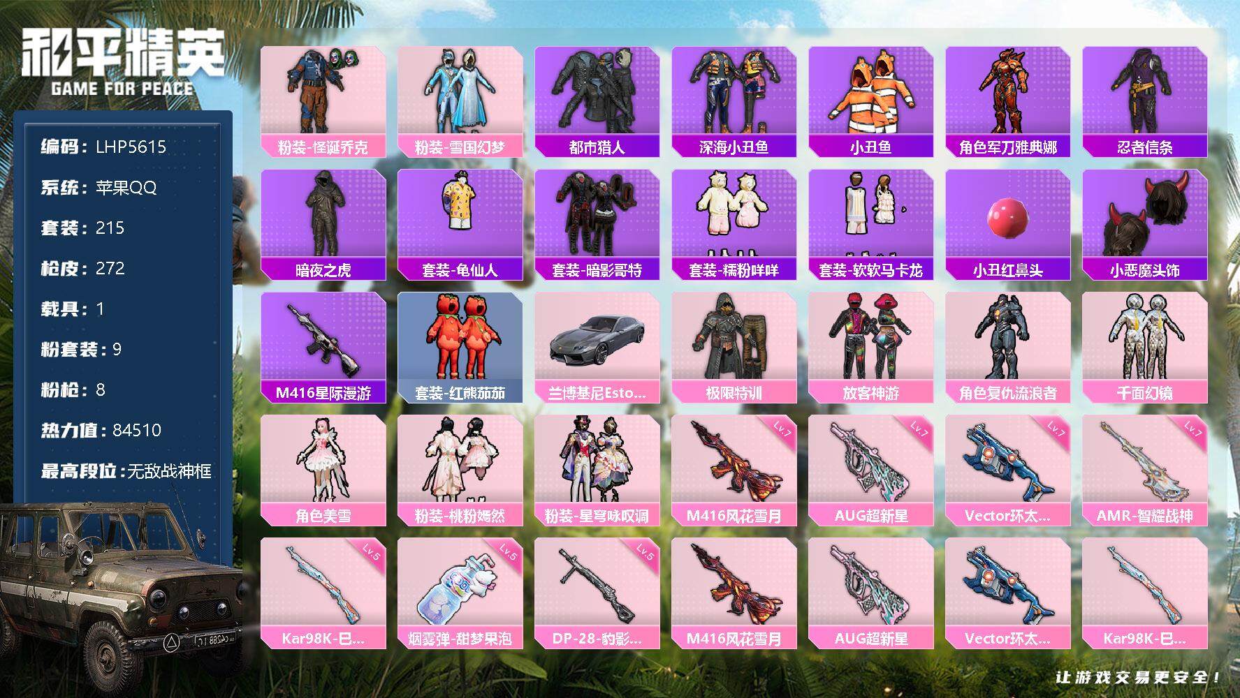 [12844907]素材身法号/无敌战神框3/绝世印记1/地铁满天赋 苹果 手Q-无敌战神框-9粉装-8特效枪-1载具-2粉色飞行器-8.4w热力值-22王牌印记-215套装-272枪皮【热门品类】:粉装-怪诞乔克,粉装-雪国幻梦,套装-都市猎人,套装-深海小丑鱼,套装-小丑鱼,角色-军刀雅典娜,套装-忍者信条,套装-暗夜之虎,套装-龟仙人,套装-暗影哥特,套装-糯粉咩咩,套装-软软马卡龙,小丑红鼻头,小恶魔头饰,M416-星际漫游,套装-红熊茄茄【粉色载具】:兰博基尼Estoque(银翼灰)【粉色套装】:粉装-极限特训,粉装-怪诞乔克,粉装-雪国幻梦,粉装-放客神游,角色-复仇流浪者,粉装-千面幻镜,角色-美雪,粉装-桃粉嫣然,粉装-星穹咏叹调【粉色枪皮等级】:M416-风花雪月(七级),AUG-超新星(七级),Vector-环太平洋(七级),Kar98K-巳巳如意(五级),AMR-智耀战神(七级),DP-28-豹影疾电(五级),烟雾弹-甜梦果泡(五级)【粉色飞行器】:齐天大圣飞行器