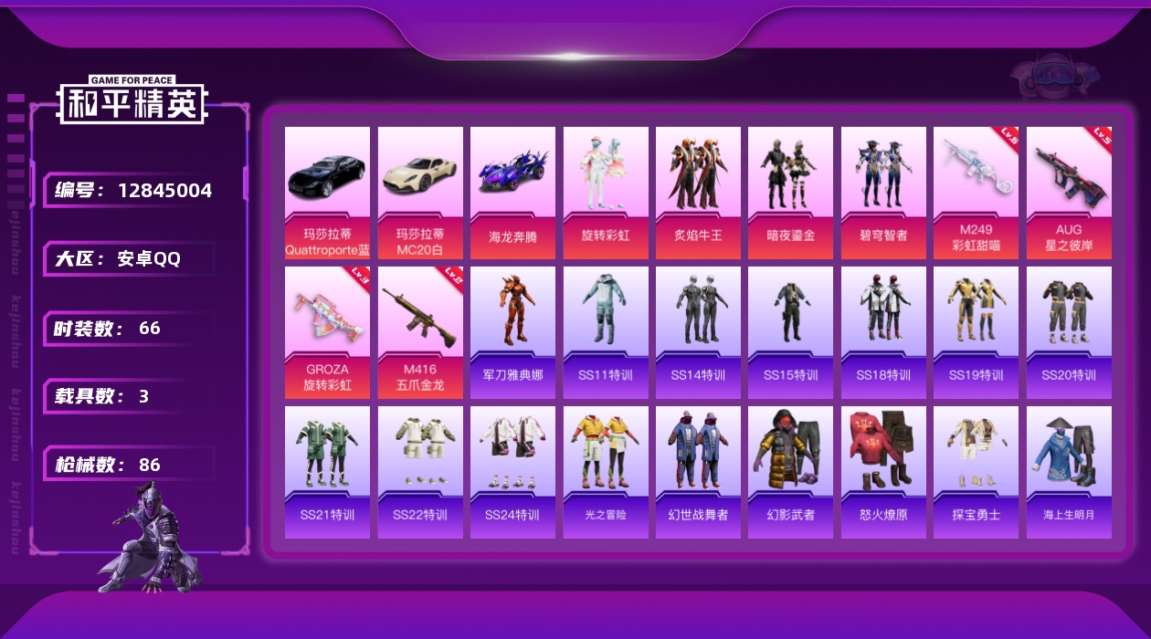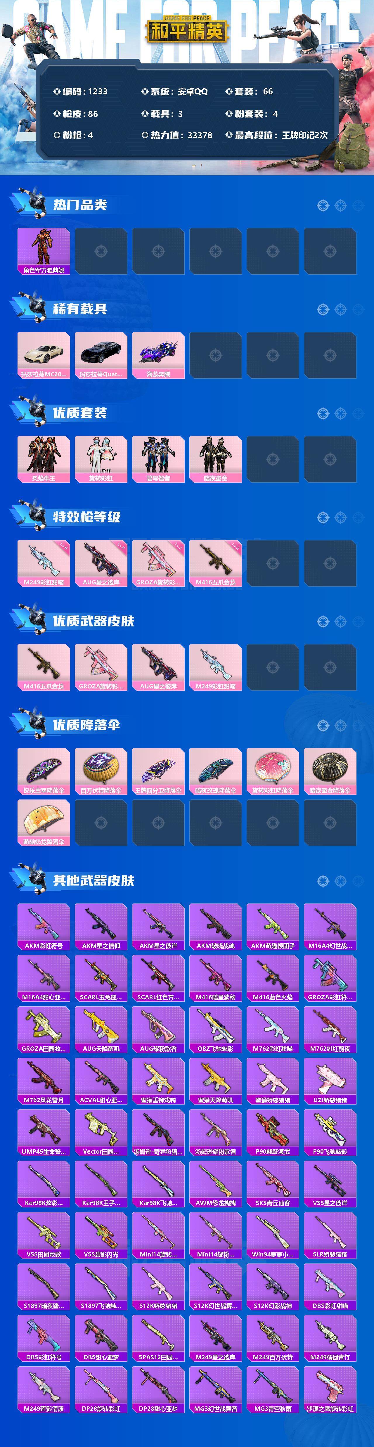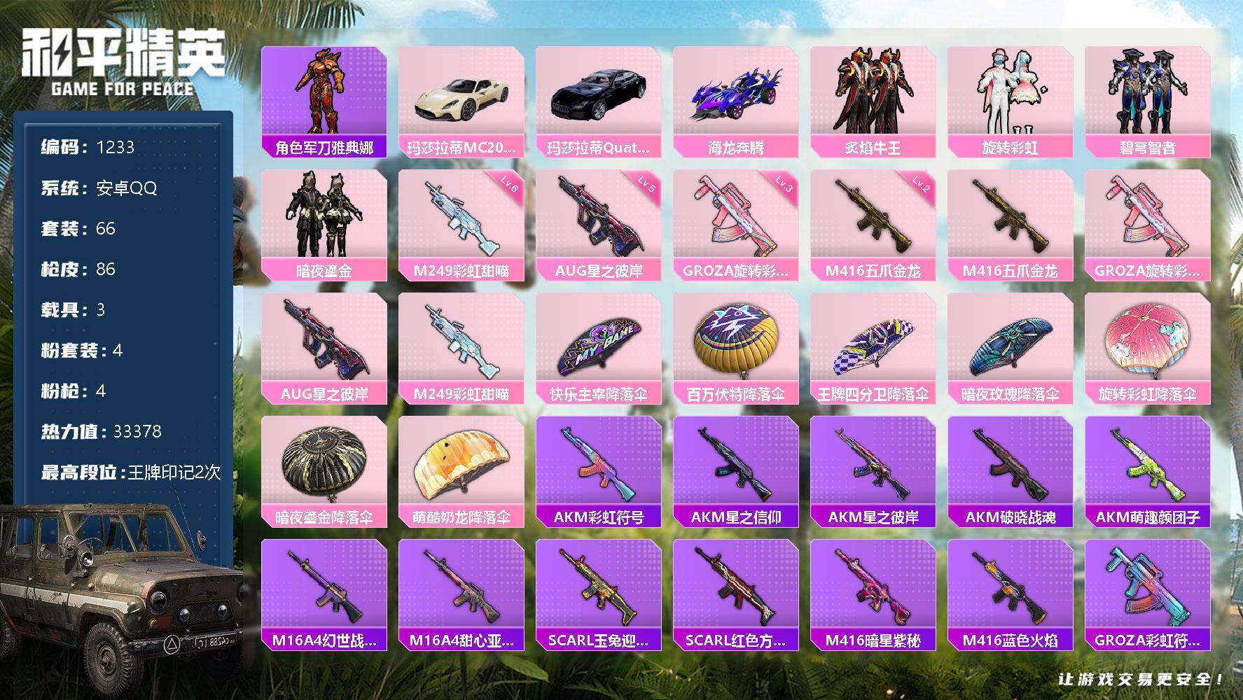 [12845004]安卓 手Q-4粉装-4特效枪-3载具-0粉色飞行器-33378热力值-2王牌印记-66套装-86枪皮 【热门品类】:角色-军刀雅典娜 【粉色载具】:玛莎拉蒂MC20(星石白),玛莎拉蒂Quattroporte(夜幕蓝),海龙奔腾 【粉色套装】:粉装-炙焰牛王,粉装-旋转彩虹,粉装-碧穹智者,粉装-暗夜鎏金 【粉色枪皮等级】:M416-五爪金龙(二级),GROZA-旋转彩虹(三级),AUG-星之彼岸(五级),M249-彩虹甜喵(六级) 【粉色枪皮】:M416-五爪金龙,GROZA-旋转彩虹,AUG-星之彼岸,M249-彩虹甜喵 【粉色降落伞】:快乐主宰降落伞,百万伏特降落伞,王牌四分卫降落伞,暗夜玫瑰降落伞,旋转彩虹降落伞,暗夜鎏金降落伞,萌酷奶龙降落伞 【稀有枪皮】:AKM-彩虹符号,AKM-星之信仰,AKM-星之彼岸,AKM-破晓战魂,AKM-萌趣颜团子,M16A4-幻世战舞者,M16A4-甜心亚梦,SCAR-L-玉兔迎春,SCAR-L-红色方程式,M416-暗星紫秘,M416-蓝色火焰,GROZA-彩虹符号,GROZA-田园牧歌,AUG-天降萌叽,AUG-耀粉歌者,QBZ-飞驰魅影,M762-彩虹甜喵,M762-绯红前夜,M762-风花雪月,AC-VAL-甜心亚梦,蜜獾-垂柳戏鸭,蜜獾-天降萌叽,蜜獾-娇憨猪猪,UZI-娇憨猪猪,UMP45-生命誓言,Vector-田园牧歌,汤姆逊-奇异狩猎者,汤姆逊-耀粉歌者,P90-翩跹演武,P90-飞驰魅影,Kar98K-炫彩节奏,Kar98K-王子的夏天,Kar98K-飞驰魅影,AWM-恐龙拽拽,SKS-青丘仙客,VSS-星之彼岸,VSS-田园牧歌,VSS-碧影闪光,Mini14-旋转彩虹,Mini14-耀粉歌者,Win94-萝萝小趴兔,SLR-娇憨猪猪,S1897-暗夜鎏金,S1897-飞驰魅影,S12K-娇憨猪猪,S12K-幻世战舞者,S12K-幻影战神,DBS-彩虹甜喵,DBS-彩虹符号,DBS-甜心亚梦,SPAS-12-田园牧歌,M249-星之彼岸,M249-百万伏特,M249-糯团青竹,M249-莲影清波,DP-28-旋转彩虹,DP-28-甜心亚梦,MG3-幻世战舞者,MG3-青空秋雨,沙漠之鹰-旋转彩虹,爆炸猎弓-炎氏战神 【其他套装】:套装-SS11特训,套装-SS14特训,套装-SS15特训,套装-SS