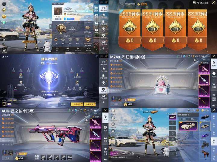【粉色枪皮等级】:M416-五爪金龙(二级),GROZA-旋转彩虹(三级),AUG-星之彼岸(五级),M249-彩虹甜喵(六级)