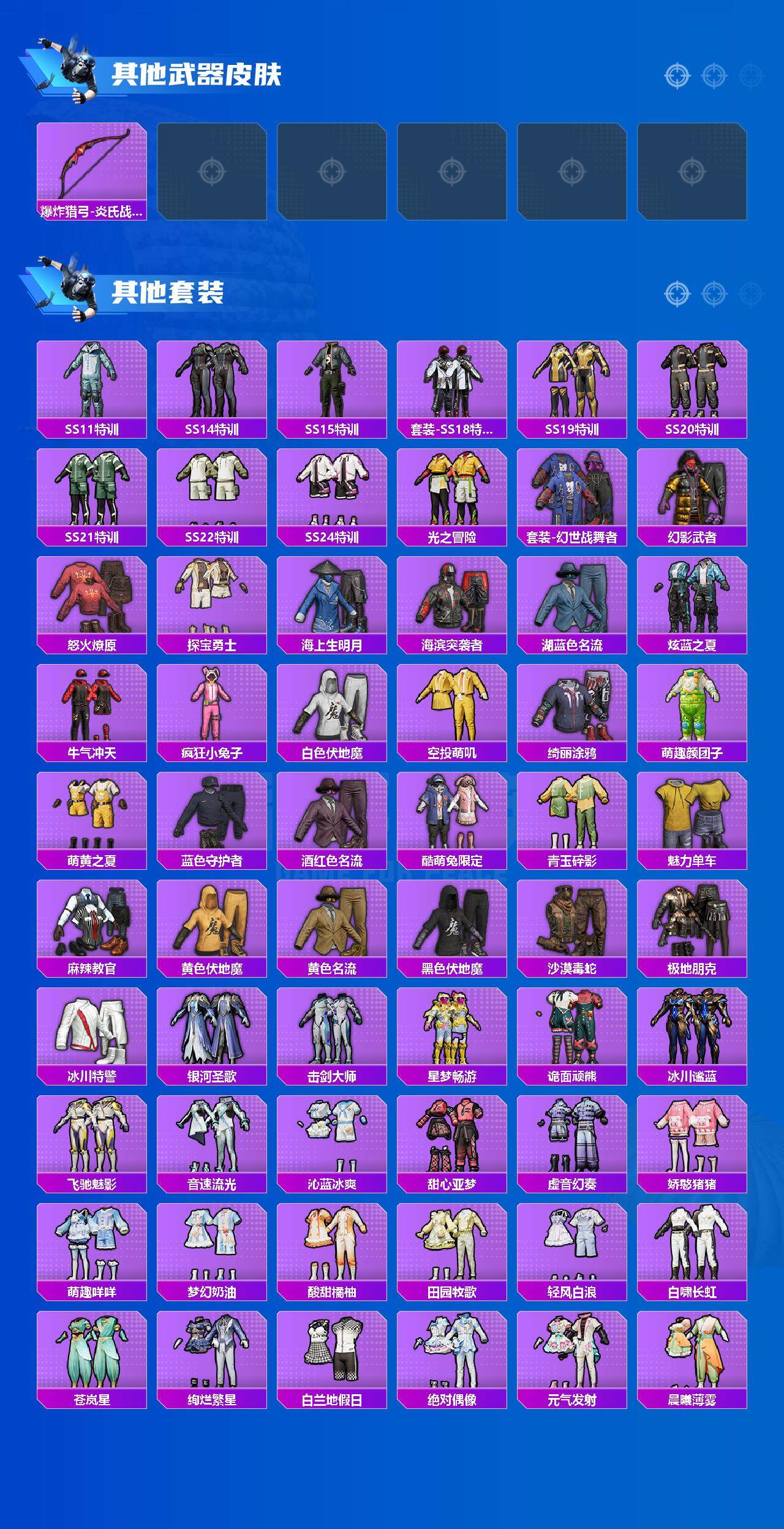 【稀有枪皮】:AKM-彩虹符号,AKM-星之信仰,AKM-星之彼岸,AKM-破晓战魂,AKM-萌趣颜团子,M16A4-幻世战舞者,M16A4-甜心亚梦,SCAR-L-玉兔迎春,SCAR-L-红色方程式,M416-暗星紫秘,M416-蓝色火焰,GROZA-彩虹符号,GROZA-田园牧歌,AUG-天降萌叽,AUG-耀粉歌者,QBZ-飞驰魅影,M762-彩虹甜喵,M762-绯红前夜,M762-风花雪月,AC-VAL-甜心亚梦,蜜獾-垂柳戏鸭,蜜獾-天降萌叽,蜜獾-娇憨猪猪,UZI-娇憨猪猪,UMP45-生命誓言,Vector-田园牧歌,汤姆逊-奇异狩猎者,汤姆逊-耀粉歌者,P90-翩跹演武,P90-飞驰魅影,Kar98K-炫彩节奏,Kar98K-王子的夏天,Kar98K-飞驰魅影,AWM-恐龙拽拽,SKS-青丘仙客,VSS-星之彼岸,VSS-田园牧歌,VSS-碧影闪光,Mini14-旋转彩虹,Mini14-耀粉歌者,Win94-萝萝小趴兔,SLR-娇憨猪猪,S1897-暗夜鎏金,S1897-飞驰魅影,S12K-娇憨猪猪,S12K-幻世战舞者,S12K-幻影战神,DBS-彩虹甜喵,DBS-彩虹符号,DBS-甜心亚梦,SPAS-12-田园牧歌,M249-星之彼岸,M249-百万伏特,M249-糯团青竹,M249-莲影清波,DP-28-旋转彩虹,DP-28-甜心亚梦,MG3-幻世战舞者,MG3-青空秋雨,沙漠之鹰-旋转彩虹,爆炸猎弓-炎氏战神