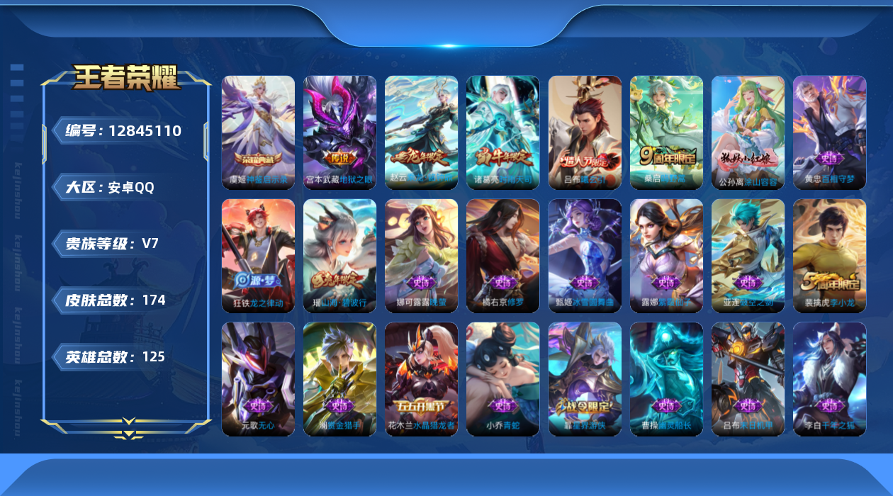 [12845110]安卓Q-V7-至尊星耀III段位-125英雄-174皮肤-1典藏-0珍品无双-0无双-0珍品传说-5传说-62史诗