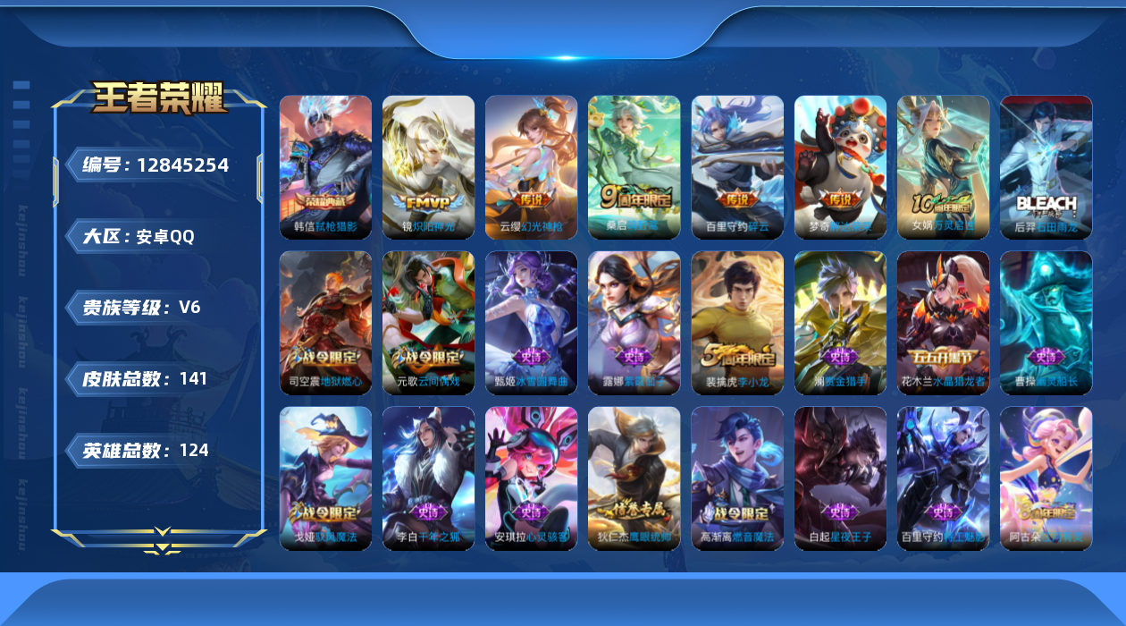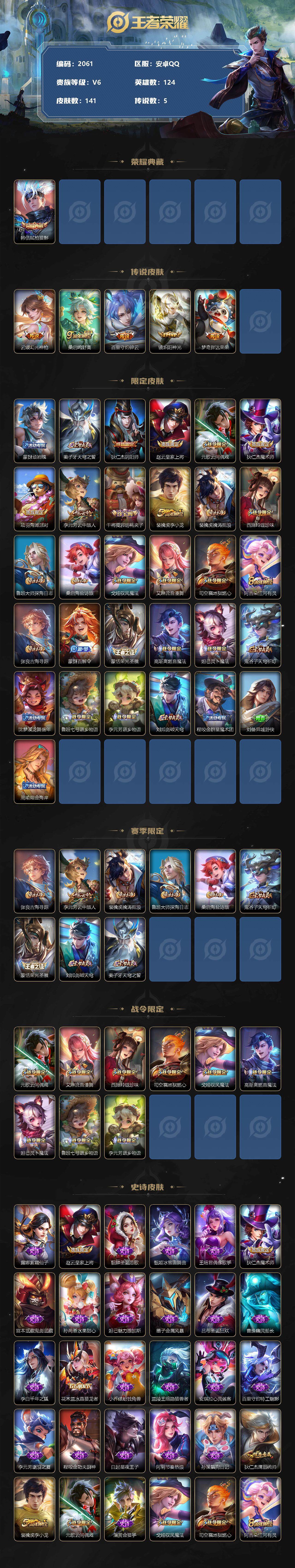 [12845254]安卓Q-V2-最强王者段位-124英雄-141皮肤-1典藏-0珍品无双-0无双-0珍品传说-5传说-39史诗