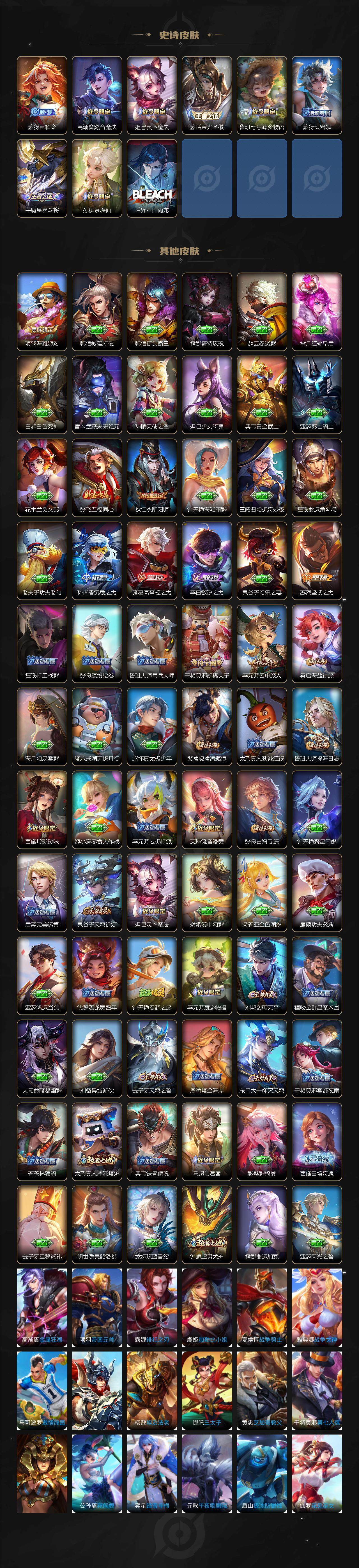 【史诗皮肤】:露娜紫霞仙子,赵云皇家上将,貂蝉圣诞恋歌,甄姬冰雪圆舞曲,王昭君偶像歌手,狄仁杰魔术师,宫本武藏鬼剑武藏,孙尚香水果甜心,妲己魅力维加斯,墨子金属风暴,吕布圣诞狂欢,曹操幽灵船长,李白千年之狐,花木兰水晶猎龙者,小乔缤纷独角兽,兰陵王暗隐猎兽者,安琪拉心灵骇客,百里守约特工魅影,李元芳逐浪之夏,程咬金功夫厨神,白起星夜王子,阿轲节奏热浪,孙策猫狗日记,狄仁杰鹰眼统帅,裴擒虎李小龙,元歌云间偶戏,澜赏金猎手,戈娅驭风魔法,司空震地狱燃心,阿古朵江河有灵,蒙犽百解令,妲己灵卜魔法,高渐离燃音魔法,蒙恬荣光圣徽,鲁班七号蔬乡物语,蒙犽顽岩魄,牛魔星界战将,孙膑茶境仙,后羿石田雨龙,女娲万灵启世