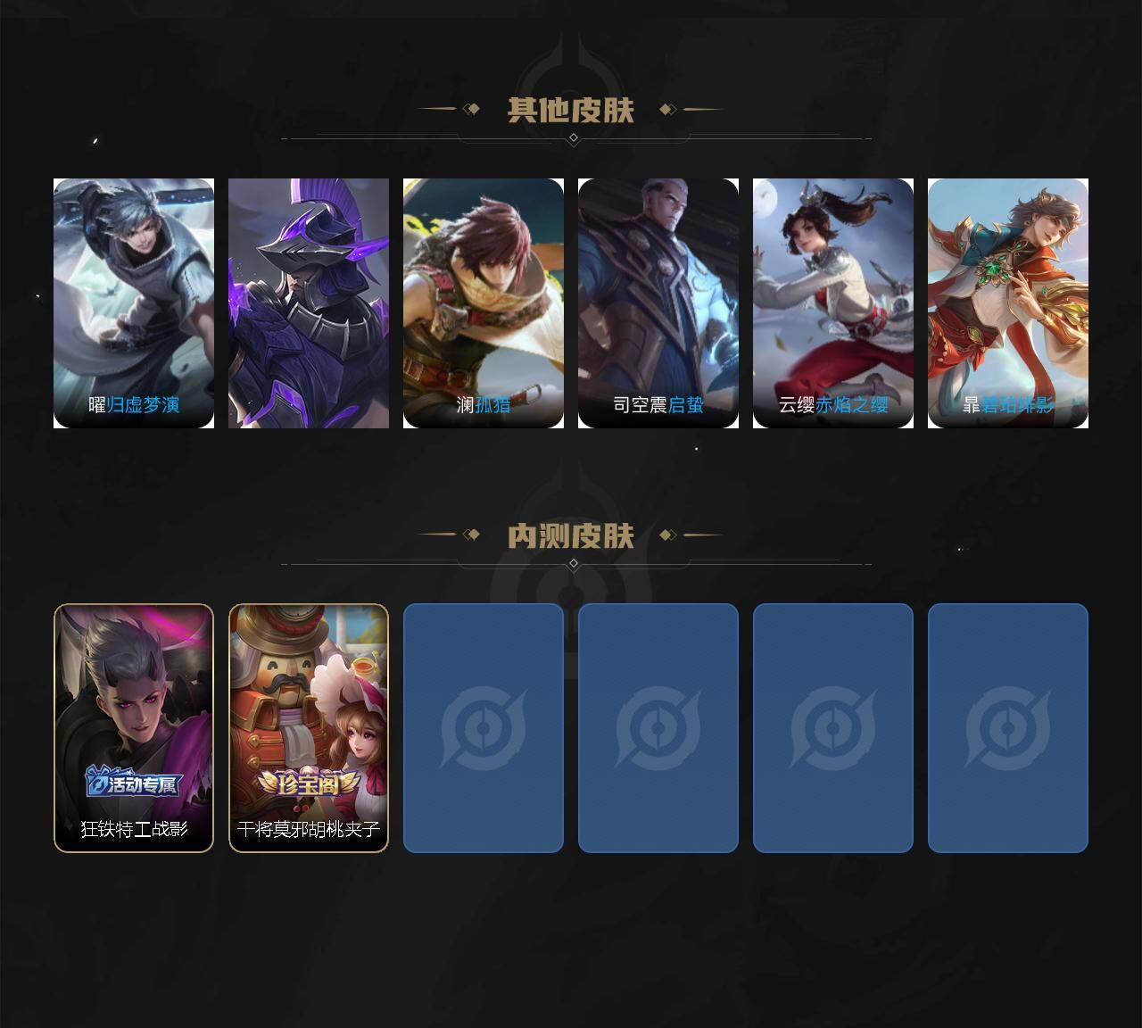 【其他皮肤】:项羽海滩派对,韩信教廷特使,韩信街头霸王,露娜哥特玫瑰,赵云忍炎影,芈月红桃皇后,白起白色死神,宫本武藏未来纪元,孙膑天使之翼,妲己少女阿狸,典韦黄金武士,亚瑟死亡骑士,花木兰兔女郎,张飞五福同心,狄仁杰阴阳师,钟无艳海滩丽影,王昭君幻想奇妙夜,狂铁命运角斗场,老夫子功夫老勺,孙尚香沉稳之力,诸葛亮掌控之力,李白敏锐之力,鬼谷子幻乐之宴,苏烈坚韧之力,