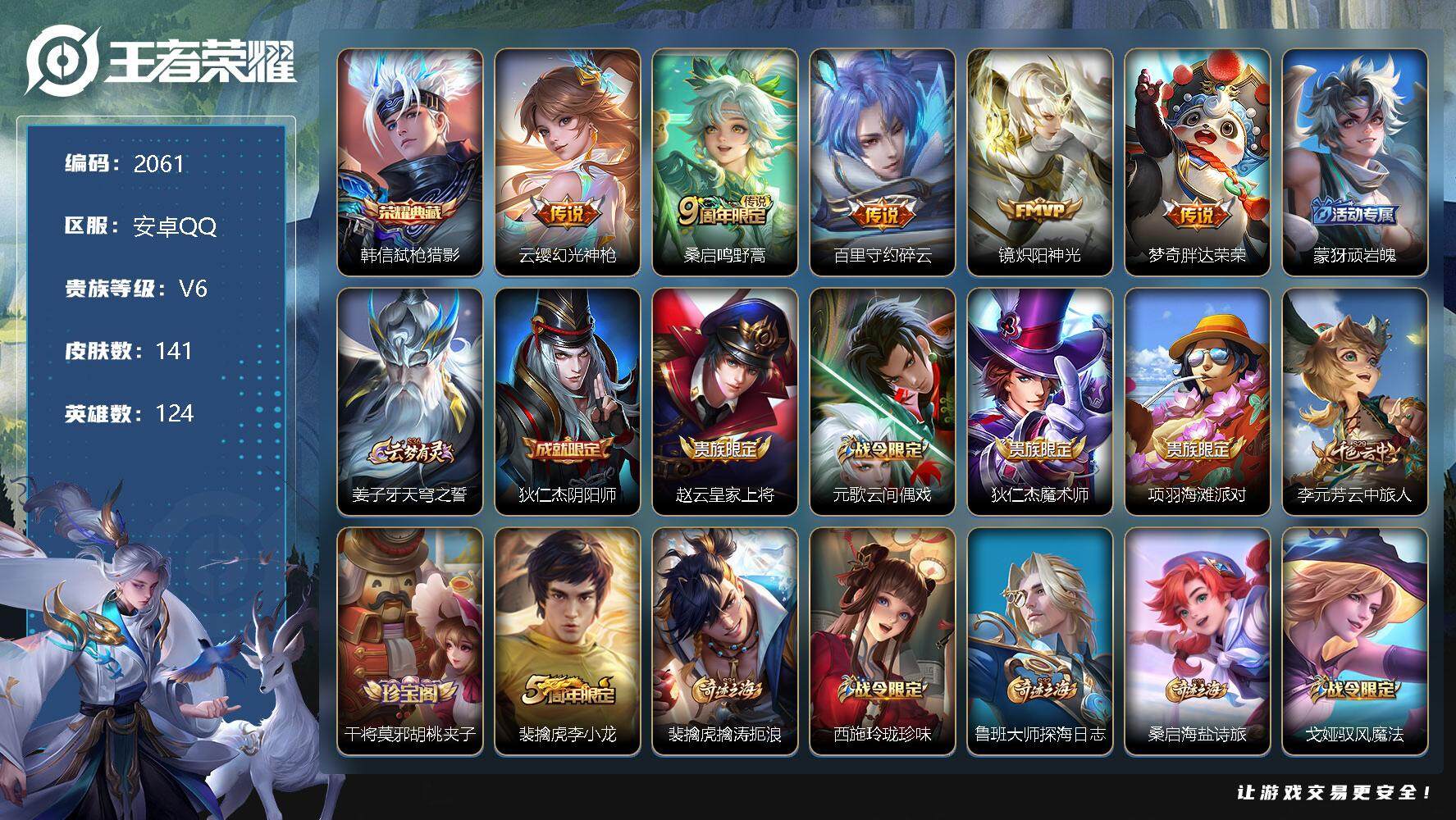 [12845254]安卓Q-V2-最强王者段位-124英雄-141皮肤-1典藏-0珍品无双-0无双-0珍品传说-5传说-39史诗 【英雄全皮】:影全皮 【荣耀典藏】:韩信弑枪猎影 【传说皮肤】:云缨幻光神枪,桑启鸣野蒿,百里守约碎云,镜炽阳神光,梦奇胖达荣荣 【限定皮肤】:蒙犽顽岩魄,姜子牙天穹之誓,狄仁杰阴阳师,赵云皇家上将,元歌云间偶戏,狄仁杰魔术师,项羽海滩派对,李元芳云中旅人,干将莫邪胡桃夹子,裴擒虎李小龙,裴擒虎擒涛扼浪,西施玲珑珍味,鲁班大师探海日志,桑启海盐诗旅,戈娅驭风魔法,艾琳流音漫舞,司空震地狱燃心,阿古朵江河有灵,张良古海寻踪,蒙犽百解令,蒙恬荣光圣徽,高渐离燃音魔法,妲己灵卜魔法,鬼谷子天穹祈灯,沈梦溪龙舞盛年,鲁班七号蔬乡物语,李元芳蔬乡物语,刘邦剑破天穹,程咬金群星魔术团,刘备异域游侠,周瑜熔金海岸 【赛季限定】:张良古海寻踪,李元芳云中旅人,裴擒虎擒涛扼浪,鲁班大师探海日志,桑启海盐诗旅,鬼谷子天穹祈灯,蒙恬荣光圣徽,刘邦剑破天穹,姜子牙天穹之誓 【战令限定】:元歌云间偶戏,艾琳流音漫舞,西施玲珑珍味,司空震地狱燃心,戈娅驭风魔法,高渐离燃音魔法,妲己灵卜魔法,鲁班七号蔬乡物语,李元芳蔬乡物语 【史诗皮肤】:露娜紫霞仙子,赵云皇家上将,貂蝉圣诞恋歌,甄姬冰雪圆舞曲,王昭君偶像歌手,狄仁杰魔术师,宫本武藏鬼剑武藏,孙尚香水果甜心,妲己魅力维加斯,墨子金属风暴,吕布圣诞狂欢,曹操幽灵船长,李白千年之狐,花木兰水晶猎龙者,小乔缤纷独角兽,兰陵王暗隐猎兽者,安琪拉心灵骇客,百里守约特工魅影,李元芳逐浪之夏,程咬金功夫厨神,白起星夜王子,阿轲节奏热浪,孙策猫狗日记,狄仁杰鹰眼统帅,裴擒虎李小龙,元歌云间偶戏,澜赏金猎手,戈娅驭风魔法,司空震地狱燃心,阿古朵江河有灵,蒙犽百解令,妲己灵卜魔法,高渐离燃音魔法,蒙恬荣光圣徽,鲁班七号蔬乡物语,蒙犽顽岩魄,牛魔星界战将,孙膑茶境仙,后羿石田雨龙,女娲万灵启世 【其他皮肤】:项羽海滩派对,韩信教廷特使,韩信街头霸王,露娜哥特玫瑰,赵云忍炎影,芈月红桃皇后,白起白色死神,宫本武藏未来纪元,孙膑天使之翼,妲己少女阿狸,典韦黄金武士,亚瑟死亡骑士,花木兰兔女郎,张飞五福同心,狄仁杰阴阳师,钟无艳海滩丽影,王昭君幻想奇妙夜,狂铁命运角斗场,老夫子功夫老勺,孙尚香沉稳之力,诸葛亮掌控之力,李白敏锐之力,鬼谷子幻乐之宴,苏烈坚韧之力,