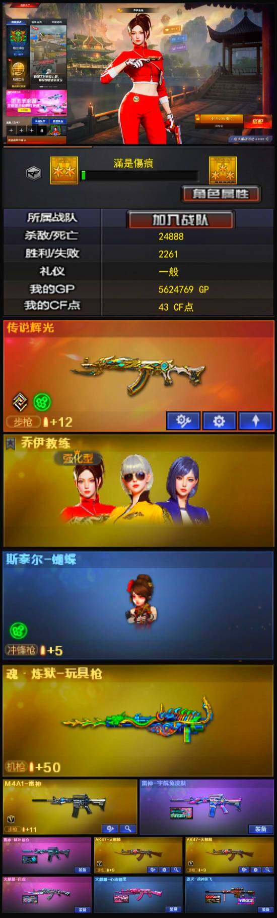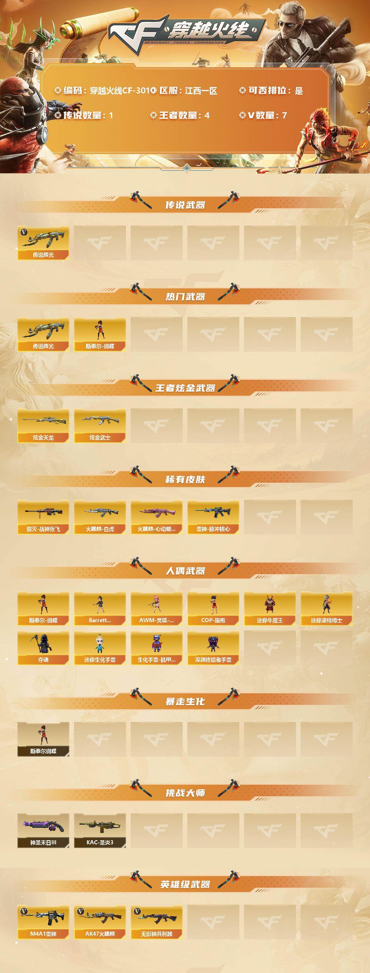 [12845722]江西一区-7V-4王者-2炫金 【传说武器】:传说辉光 【热门武器】:传说辉光,斯泰尔-蝴蝶 【王者炫金武器】:炫金天龙,炫金武士 【稀有皮肤】:雷神-脉冲核心,火麒麟-白虎,火麒麟-心动糖果,毁灭-战神张飞 【人偶武器】:斯泰尔-蝴蝶,Barrett-夜玫瑰,AWM-灵狐-15周年嘉年华,COP-旗袍,迷你牛魔王,迷你波特博士,夺魂,迷你生化手雷,生化手雷-机甲核心,深渊终结者手雷 【暴走生化】:斯泰尔-蝴蝶 【挑战大师】:神圣爆裂者-末日III,KAC-圣炎切割者III 【英雄级武器】:无影-神兵利器,M4A1-雷神,AK47-火麒麟*2 【特殊枪械】:蝴蝶斯泰尔+0烈龙,1蝴蝶斯泰尔