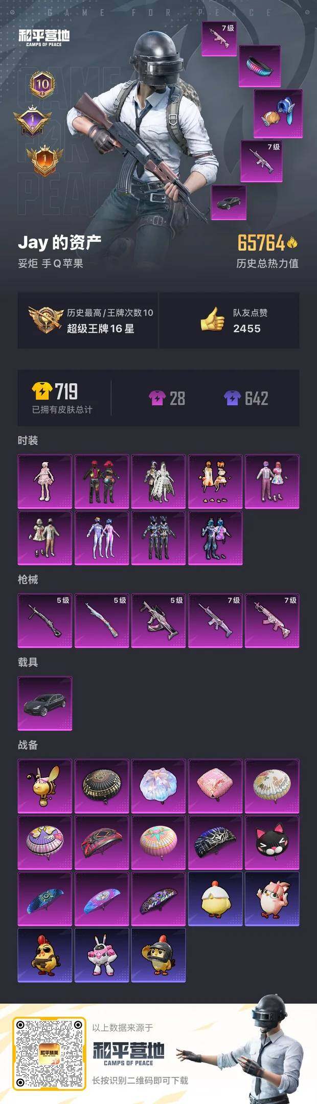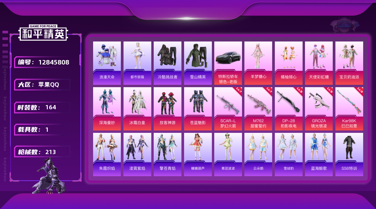 [12845808]苹果 手Q-9粉装-5特效枪-1载具-1粉色飞行器-65764热力值-10王牌印记-164套装-213枪皮