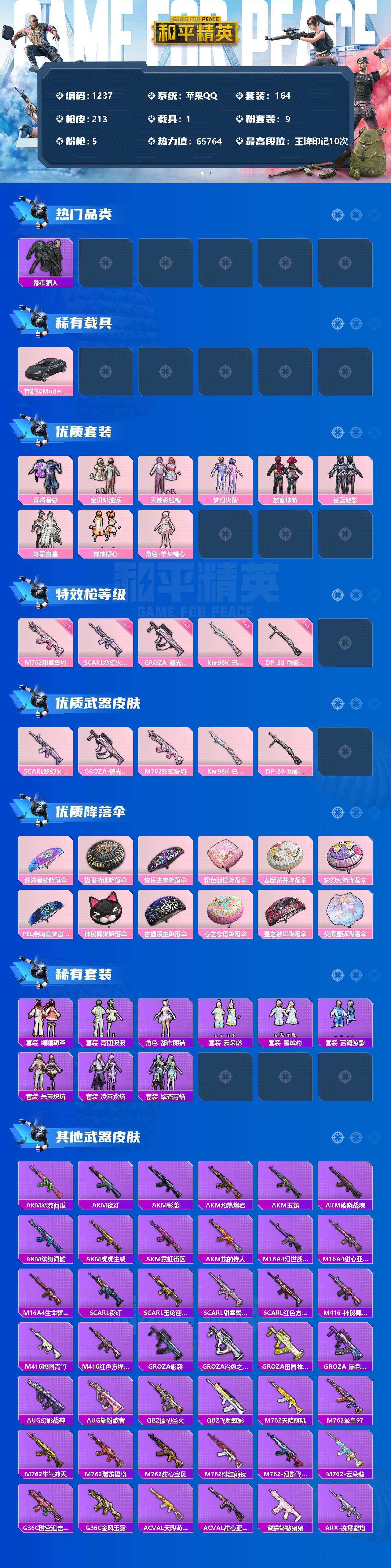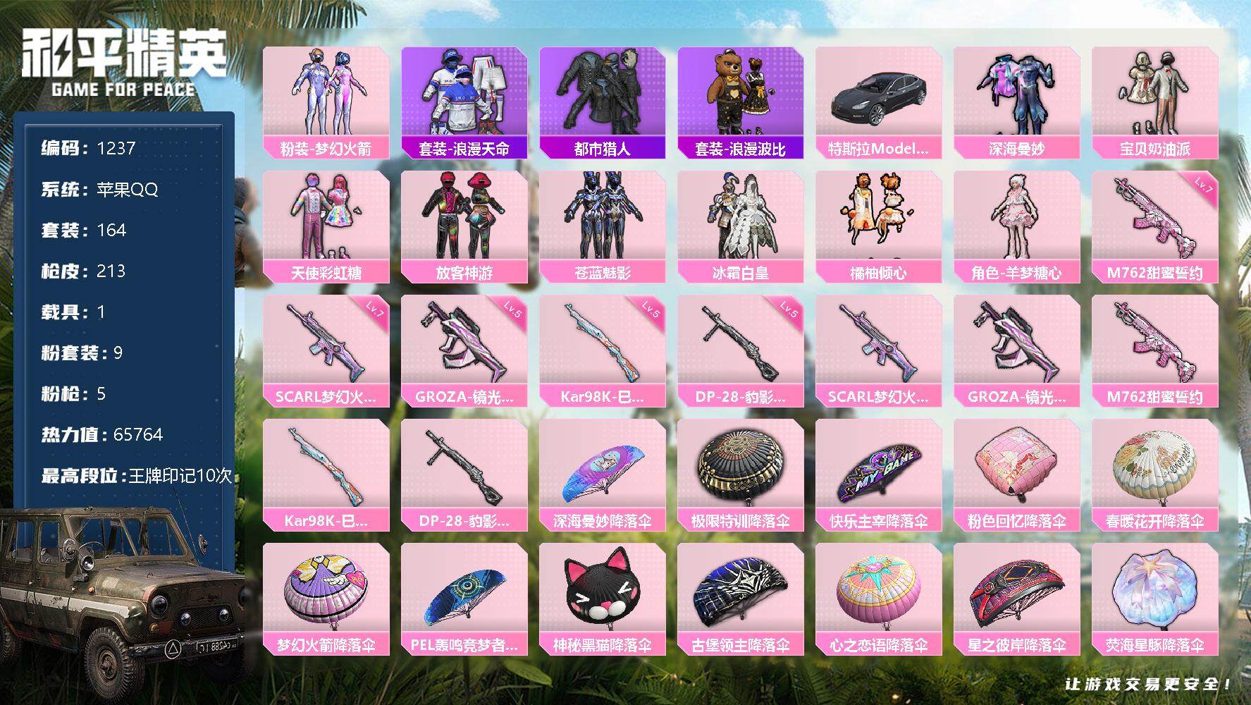 [12845808]苹果 手Q-9粉装-5特效枪-1载具-1粉色飞行器-65764热力值-10王牌印记-164套装-213枪皮 【热门品类】:粉装-梦幻火箭,套装-浪漫天命,套装-都市猎人,套装-浪漫波比 【粉色载具】:特斯拉Model 3(冷光银) 【粉色套装】:粉装-深海曼妙,粉装-宝贝奶油派,粉装-天使彩虹糖,粉装-梦幻火箭,粉装-放客神游,粉装-苍蓝魅影,粉装-冰霜白皇,粉装-橘柚倾心,角色-羊梦糖心 【粉色枪皮等级】:SCAR-L-梦幻火箭(七级),GROZA-镜光银凌(五级),M762-甜蜜誓约(七级),Kar98K-巳巳如意(五级),DP-28-豹影疾电(五级) 【粉色枪皮】:SCAR-L-梦幻火箭,GROZA-镜光银凌,M762-甜蜜誓约,Kar98K-巳巳如意,DP-28-豹影疾电 【粉色降落伞】:深海曼妙降落伞,极限特训降落伞,快乐主宰降落伞,粉色回忆降落伞,春暖花开降落伞,梦幻火箭降落伞,PEL轰鸣竞梦者降落伞,神秘黑猫降落伞,古堡领主降落伞,心之恋语降落伞,星之彼岸降落伞,荧海星豚降落伞 【稀有套装】:套装-糖糖葫芦,套装-青团波波,角色-都市丽猫,套装-云朵鹅,套装-雪绒豹,套装-蓝海鲸歌,套装-朱霞炽焰,套装-凌霄紫焰,套装-擎苍青焰 【稀有枪皮】:AKM-冰凉西瓜,AKM-夜灯,AKM-影袭,AKM-灼热熔岩,AKM-玉龙,AKM-破晓战魂,AKM-缤纷海域,AKM-虎虎生威,AKM-霓虹街区,AKM-龙的传人,M16A4-幻世战舞者,M16A4-甜心亚梦,M16A4-生命誓言,SCAR-L-夜灯,SCAR-L-玉兔迎春,SCAR-L-甜蜜誓约,SCAR-L-红色方程式,M416-神秘黑猫,M416-糯团青竹,M416-红色方程式,GROZA-影袭,GROZA-治愈之星,GROZA-田园牧歌,GROZA-黑色刀锋,AUG-幻影战神,AUG-耀粉歌者,QBZ-原初圣火,QBZ-飞驰魅影,M762-天降萌叽,M762-拳皇97,M762-牛气冲天,M762-瑞龙福将,M762-甜心宝贝,M762-绯红前夜,M762-云朵鹅,M762-幻影飞狐,G36C-时空追击者,G36C-金风玉露,AC-VAL-天降萌叽,AC-VAL-甜心亚梦,蜜獾-娇憨猪猪,ARX-凌霄紫焰,UZI-众神之王,UZI-古堡领主,UZI-天降萌叽,UZI-娇憨猪猪,UZI-影袭,UZI-