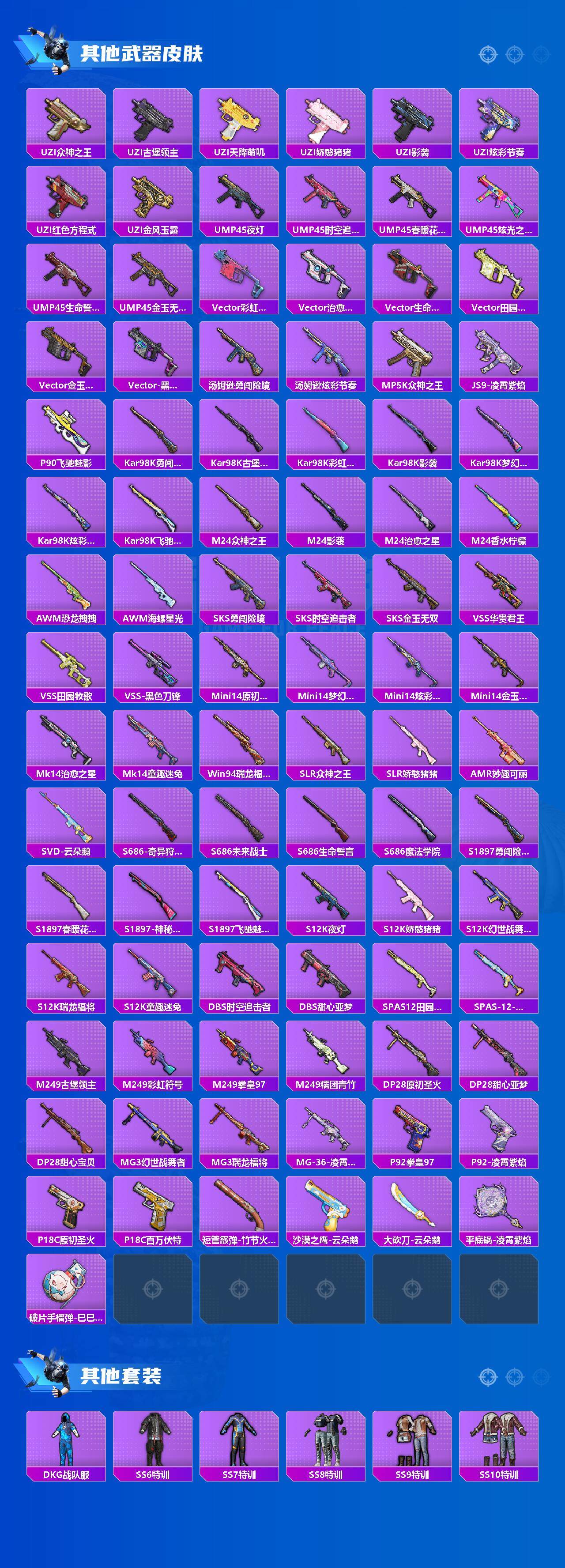 【稀有枪皮】:AKM-冰凉西瓜,AKM-夜灯,AKM-影袭,AKM-灼热熔岩,AKM-玉龙,AKM-破晓战魂,AKM-缤纷海域,AKM-虎虎生威,AKM-霓虹街区,AKM-龙的传人,M16A4-幻世战舞者,M16A4-甜心亚梦,M16A4-生命誓言,SCAR-L-夜灯,SCAR-L-玉兔迎春,SCAR-L-甜蜜誓约,SCAR-L-红色方程式,M416-神秘黑猫,M416-糯团青竹,M416-红色方程式,GROZA-影袭,GROZA-治愈之星,GROZA-田园牧歌,GROZA-黑色刀锋,AUG-幻影战神,AUG-耀粉歌者,QBZ-原初圣火,QBZ-飞驰魅影,M762-天降萌叽,M762-拳皇97,M762-牛气冲天,M762-瑞龙福将,M762-甜心宝贝,M762-绯红前夜,M762-云朵鹅,M762-幻影飞狐,G36C-时空追击者,G36C-金风玉露,AC-VAL-天降萌叽,AC-VAL-甜心亚梦,蜜獾-娇憨猪猪,ARX-凌霄紫焰,UZI-众神之王,UZI-古堡领主,UZI-天降萌叽,UZI-娇憨猪猪,UZI-影袭,UZI-