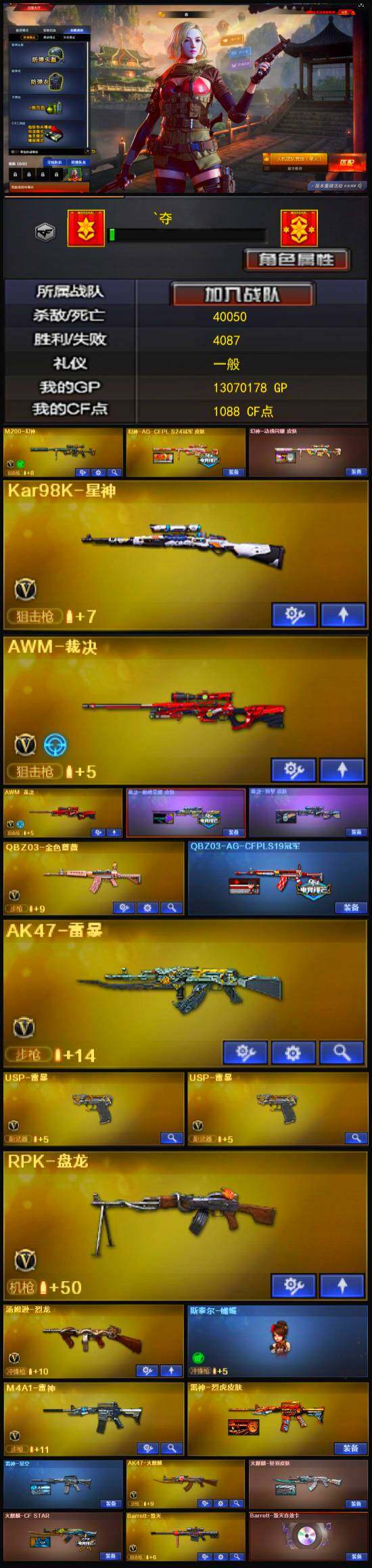 【热门武器】:QBZ03-金色蔷薇,M200-幻神,Kar98K-星神,汤姆逊-烈龙,RPK-盘龙,斯泰尔-蝴蝶,USP-雷暴*2,沙鹰-修罗*3