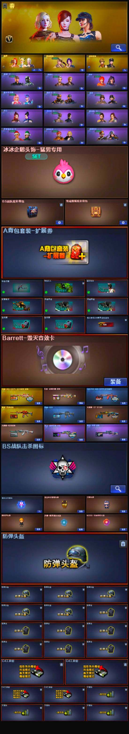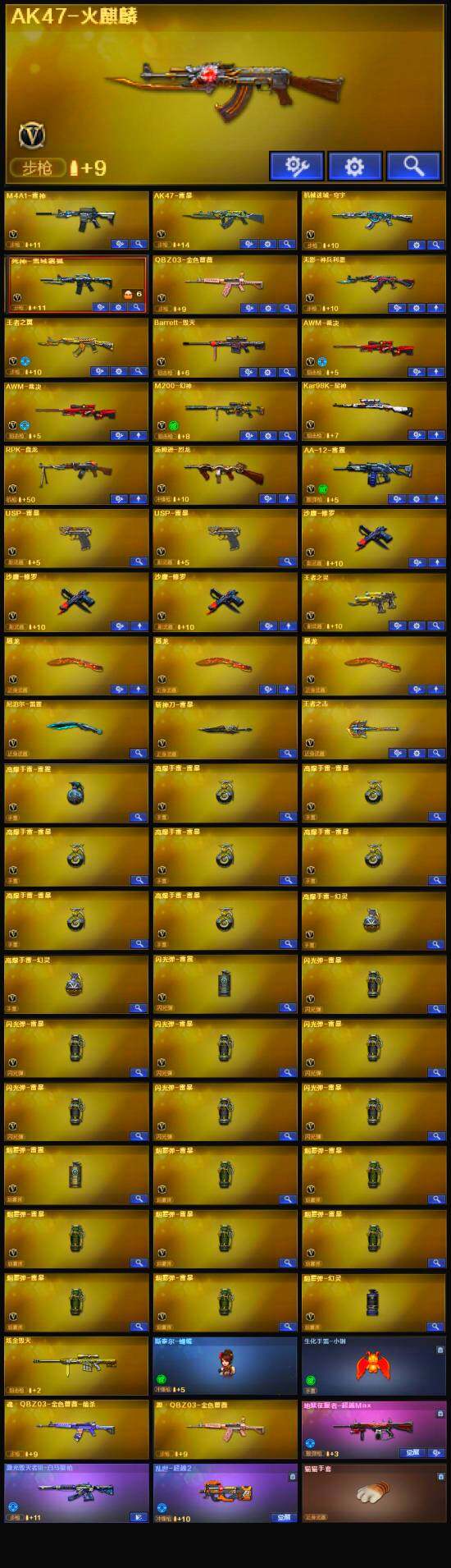 【英雄级武器】:AK47-雷暴,USP-雷暴*2,斩神刀-雷暴,QBZ03-金色蔷薇,无影-神兵利器,M4A1-雷神,RPK-盘龙,汤姆逊-烈龙,AK47-火麒麟,Barrett-毁灭,AWM-裁决*2,AA-12-雷霆,Kar98K-星神,M200-幻神,死神-雪域霜狐,M4A1-赤狱骑士,沙鹰-修罗*3,屠龙*3
