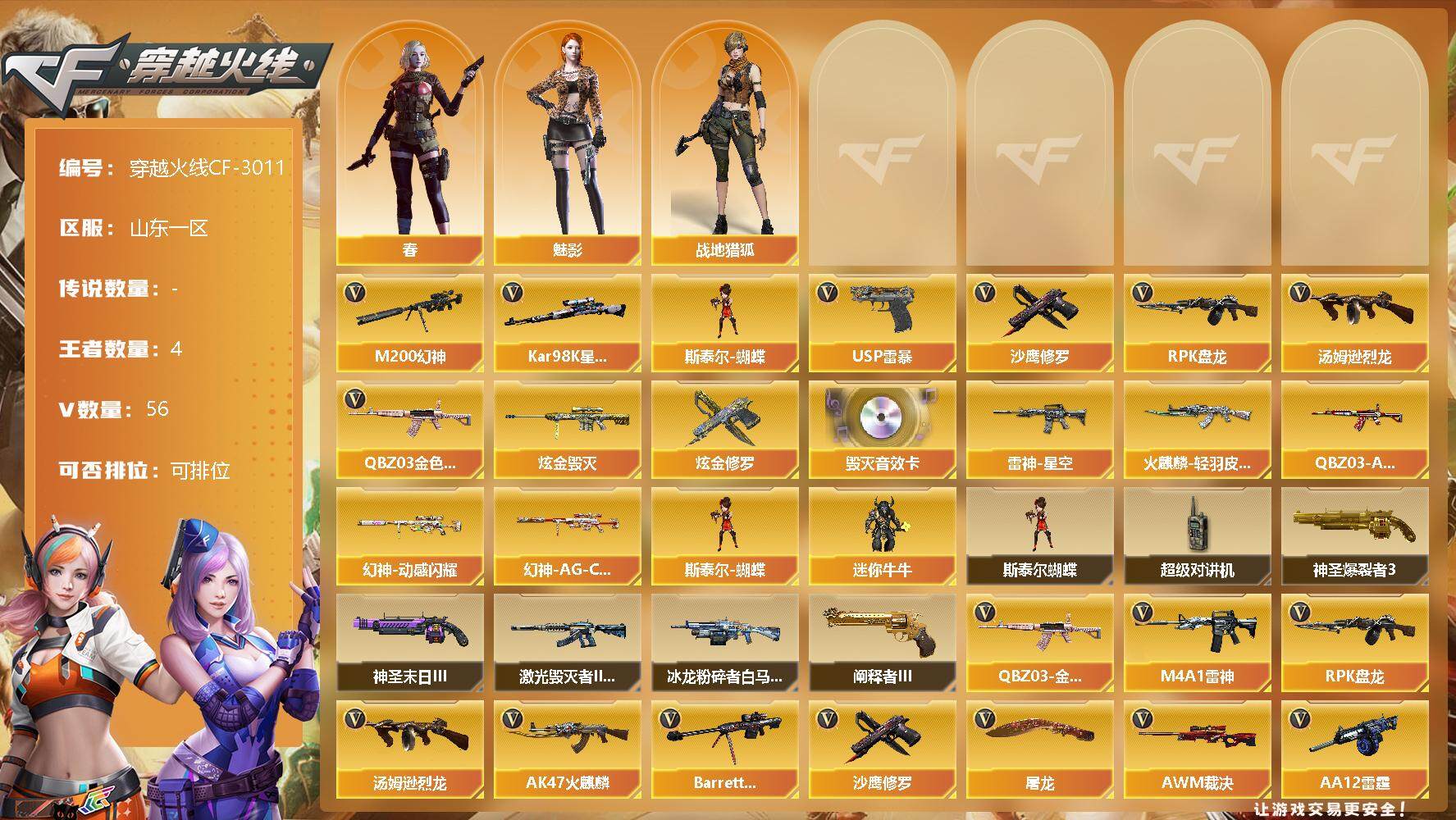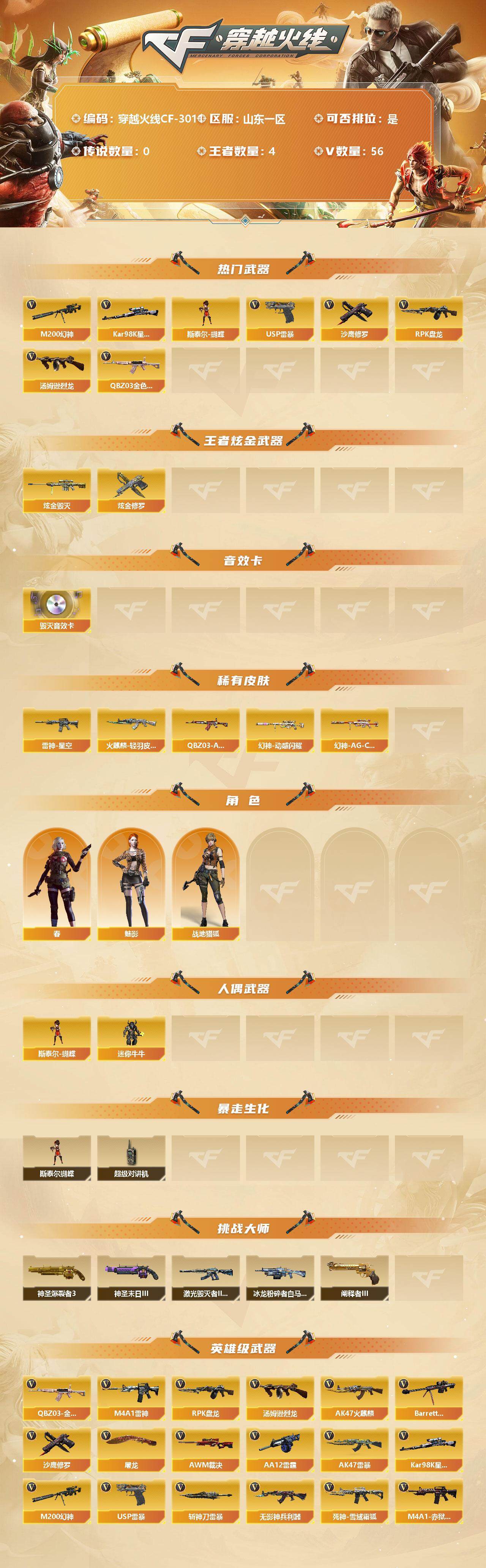 [12846124]山东一区-56V-4王者-2炫金 【热门武器】:QBZ03-金色蔷薇,M200-幻神,Kar98K-星神,汤姆逊-烈龙,RPK-盘龙,斯泰尔-蝴蝶,USP-雷暴*2,沙鹰-修罗*3 【王者炫金武器】:炫金毁灭,炫金修罗 【音效卡】:Barrett-毁灭音效卡 【稀有皮肤】:幻神-动感闪耀 皮肤,幻神-AG-CFPL S24冠军 皮肤,QBZ03-AG-CFPLS19冠军,雷神-星空,火麒麟-轻羽皮肤 【角色】:魅影,春,战地猎狐 【人偶武器】:斯泰尔-蝴蝶,迷你牛牛*2 【暴走生化】:斯泰尔-蝴蝶,超级对讲机 【挑战大师】:神圣爆裂者III,神圣爆裂者-末日III,阐释者III,激光毁灭者III-白马银枪,冰龙粉碎者-白马银枪 【英雄级武器】:AK47-雷暴,USP-雷暴*2,斩神刀-雷暴,QBZ03-金色蔷薇,无影-神兵利器,M4A1-雷神,RPK-盘龙,汤姆逊-烈龙,AK47-火麒麟,Barrett-毁灭,AWM-裁决*2,AA-12-雷霆,Kar98K-星神,M200-幻神,死神-雪域霜狐,M4A1-赤狱骑士,沙鹰-修罗*3,屠龙*3 【特殊枪械】:蝴蝶斯泰尔+1烈龙,1烈龙,1盘龙,1蝴蝶斯泰尔