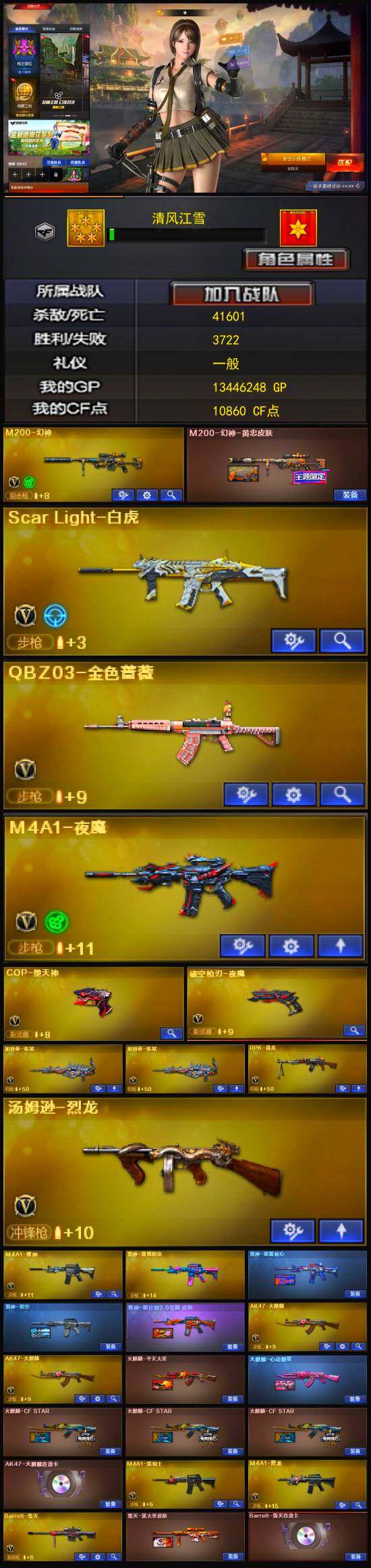 【热门武器】:QBZ03-金色蔷薇,Scar Light-白虎,M200-幻神,修罗-古蛇迷踪,C.A.T,M4A1-黑骑士,汤姆逊-烈龙,RPK-盘龙,加特林-炼狱*2,COP-堕天神,沙鹰-修罗