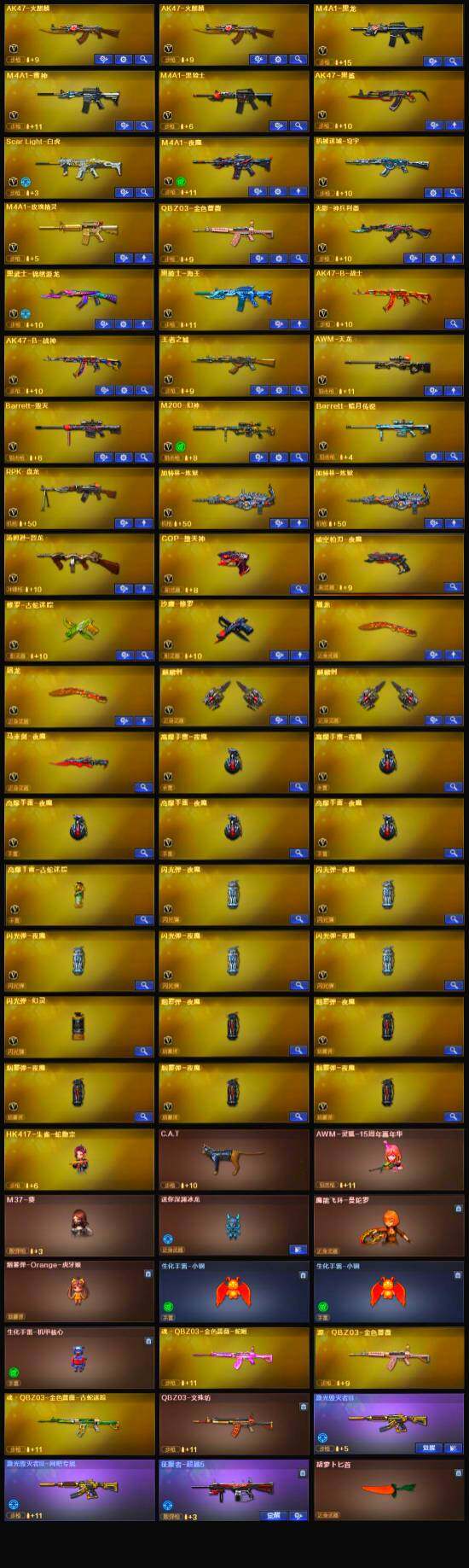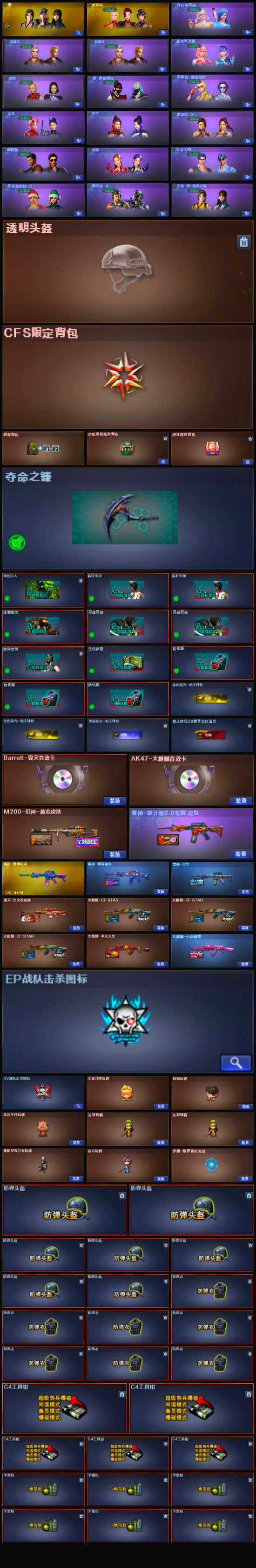【英雄级武器】:M4A1-夜魔,破空枪刃-夜魔,马来剑-夜魔,COP-堕天神,QBZ03-金色蔷薇,Scar Light-白虎,无影-神兵利器,M4A1-雷神,M4A1-黑龙,M4A1-玫瑰精灵,M4A1-黑骑士,RPK-盘龙,加特林-炼狱*2,汤姆逊-烈龙,AK47-火麒麟*2,AWM-天龙,Barrett-毁灭,M200-幻神,AK47-黑鲨,黑武士-锦绣游龙,黑骑士-海王,AK-47-猩红传说,AK47-B-战神,M4A1-赤狱骑士,修罗-古蛇迷踪,沙鹰-修罗,麒麟刺*2,屠龙*2