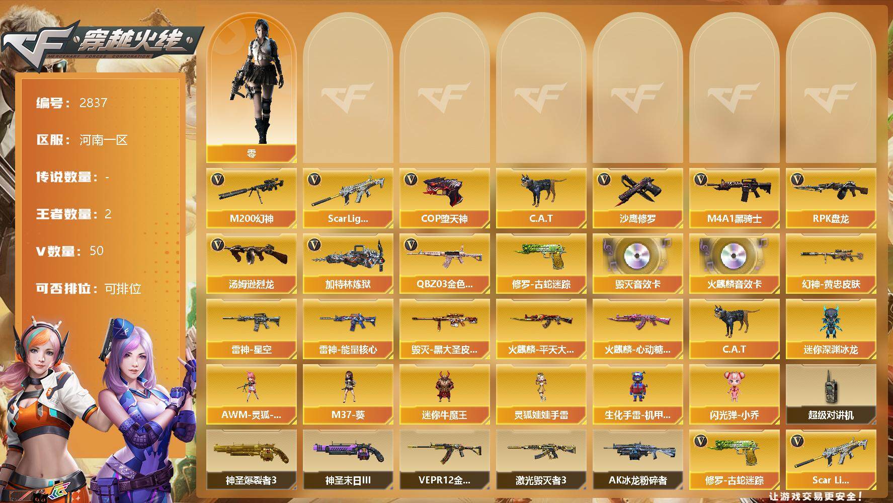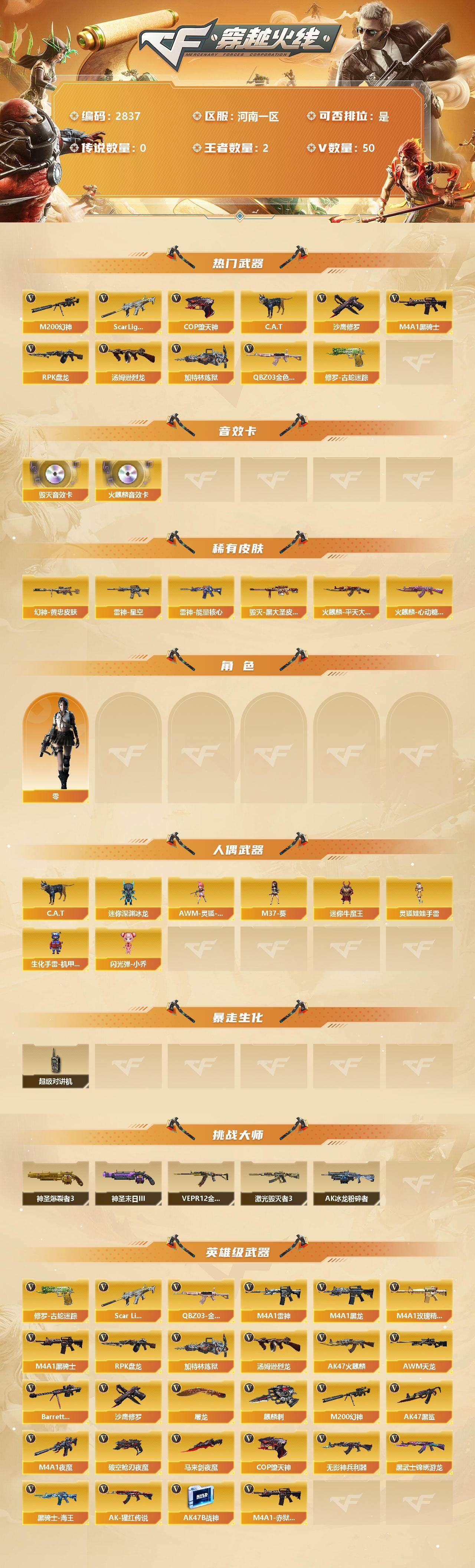 [12846519]河南一区-50V-2王者-0炫金 【热门武器】:QBZ03-金色蔷薇,Scar Light-白虎,M200-幻神,修罗-古蛇迷踪,C.A.T,M4A1-黑骑士,汤姆逊-烈龙,RPK-盘龙,加特林-炼狱*2,COP-堕天神,沙鹰-修罗 【音效卡】:AK47-火麒麟音效卡,Barrett-毁灭音效卡 【稀有皮肤】:M200-幻神-黄忠皮肤,雷神-能量核心,雷神-星空,火麒麟-平天大圣,火麒麟-心动糖果,毁灭-黑大圣皮肤 【角色】:零 【人偶武器】:AWM-灵狐-15周年嘉年华,M37-葵,C.A.T,迷你深渊冰龙,迷你牛魔王,灵狐娃娃手雷,生化手雷-机甲核心,闪光弹-小乔 【暴走生化】:超级对讲机 【挑战大师】:神圣爆裂者III,神圣爆裂者-末日III*2,激光毁灭者III,VEPR-12-金魔,AK47-冰龙粉碎者 【英雄级武器】:M4A1-夜魔,破空枪刃-夜魔,马来剑-夜魔,COP-堕天神,QBZ03-金色蔷薇,Scar Light-白虎,无影-神兵利器,M4A1-雷神,M4A1-黑龙,M4A1-玫瑰精灵,M4A1-黑骑士,RPK-盘龙,加特林-炼狱*2,汤姆逊-烈龙,AK47-火麒麟*2,AWM-天龙,Barrett-毁灭,M200-幻神,AK47-黑鲨,黑武士-锦绣游龙,黑骑士-海王,AK-47-猩红传说,AK47-B-战神,M4A1-赤狱骑士,修罗-古蛇迷踪,沙鹰-修罗,麒麟刺*2,屠龙*2 【特殊枪械】:1白虎,1黑骑士,1烈龙,1盘龙,2炼狱