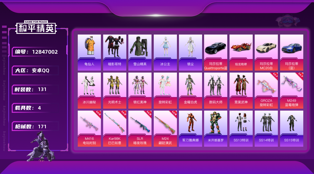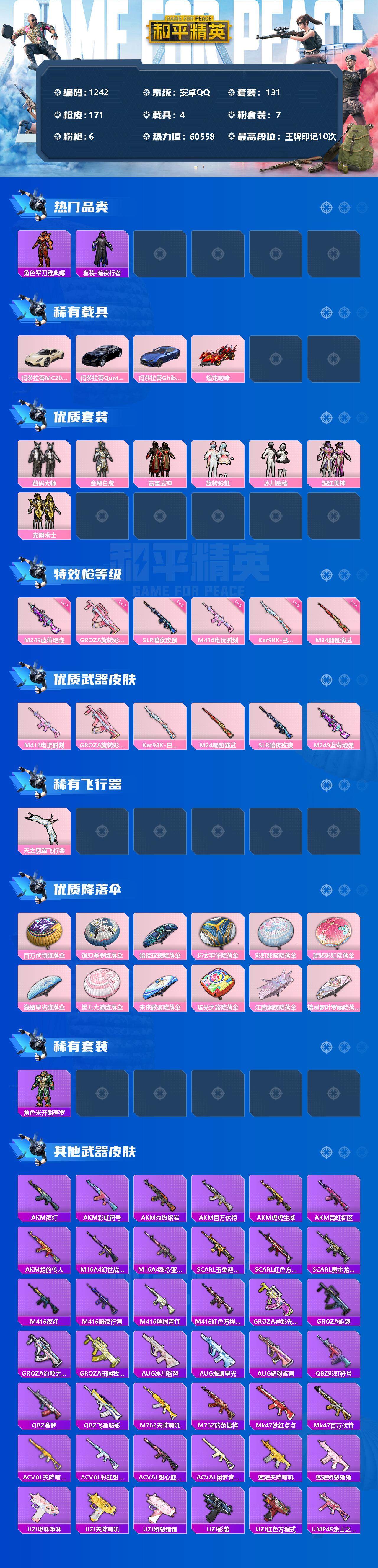 [12847002]安卓 手Q-7粉装-6特效枪-4载具-1粉色飞行器-60558热力值-10王牌印记-131套装-171枪皮 【热门品类】:角色-军刀雅典娜,套装-暗夜行者,套装-龟仙人,套装-暗影哥特 【粉色载具】:玛莎拉蒂MC20(星石白),玛莎拉蒂Quattroporte(夜幕蓝),玛莎拉蒂Ghibli(蓝),焰龙咆哮 【粉色套装】:粉装-数码大师,粉装-金曜白虎,粉装-霓裳武神,粉装-旋转彩虹,粉装-冰川幽秘,粉装-银红美神,粉装-光明术士 【粉色枪皮等级】:M416-电玩时刻(五级),GROZA-旋转彩虹(七级),Kar98K-巳巳如意(五级),M24-翩跹演武(四级),SLR-暗夜玫瑰(五级),M249-蓝莓炮弹(七级) 【粉色枪皮】:M416-电玩时刻,GROZA-旋转彩虹,Kar98K-巳巳如意,M24-翩跹演武,SLR-暗夜玫瑰,M249-蓝莓炮弹 【粉色飞行器】:天之羽翼飞行器 【粉色降落伞】:百万伏特降落伞,银刃赛罗降落伞,暗夜玫瑰降落伞,环太平洋降落伞,彩虹甜喵降落伞,旋转彩虹降落伞,海螺星光降落伞,第五大道降落伞,未来歌姬降落伞,炫光之旅降落伞,江南烟雨降落伞,精灵梦叶罗丽降落伞 【稀有套装】:套装-龟仙人,角色-米开朗基罗 【稀有枪皮】:AKM-夜灯,AKM-彩虹符号,AKM-灼热熔岩,AKM-百万伏特,AKM-虎虎生威,AKM-霓虹街区,AKM-龙的传人,M16A4-幻世战舞者,M16A4-甜心亚梦,SCAR-L-玉兔迎春,SCAR-L-红色方程式,SCAR-L-黄金龙骨,M416-夜灯,M416-暗夜行者,M416-糯团青竹,M416-红色方程式,GROZA-异彩先驱,GROZA-影袭,GROZA-治愈之星,GROZA-田园牧歌,AUG-冰川粉黛,AUG-海螺星光,AUG-耀粉歌者,QBZ-彩虹符号,QBZ-赛罗,QBZ-飞驰魅影,M762-天降萌叽,M762-瑞龙福将,Mk47-妙红点点,Mk47-百万伏特,AC-VAL-天降萌叽,AC-VAL-彩虹甜喵,AC-VAL-甜心亚梦,AC-VAL-闲梦青缨,蜜獾-天降萌叽,蜜獾-娇憨猪猪,UZI-啾咪啾咪,UZI-天降萌叽,UZI-娇憨猪猪,UZI-影袭,UZI-红色方程式,UMP45-涂山之恋,UMP45-炫光之旅,UMP45-蓝色火焰,Vector-焰鹰斗篷,Vector-彩虹符号,Vector-暗