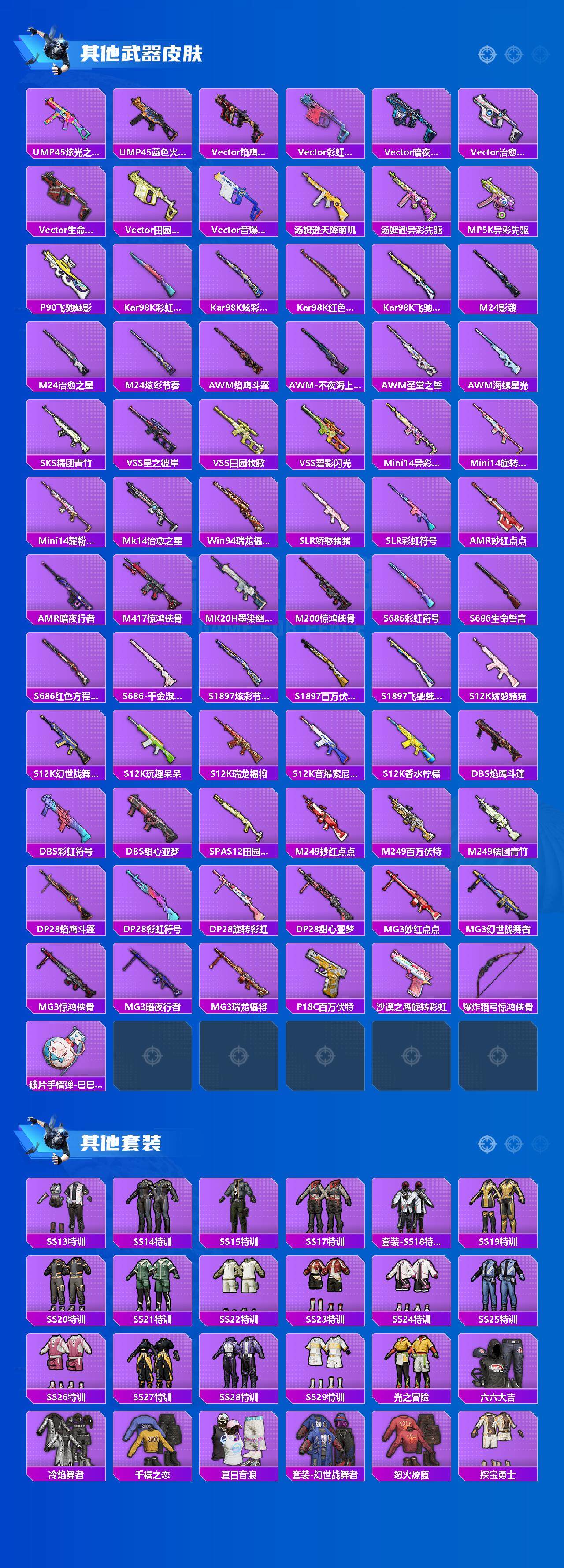 【稀有枪皮】:AKM-夜灯,AKM-彩虹符号,AKM-灼热熔岩,AKM-百万伏特,AKM-虎虎生威,AKM-霓虹街区,AKM-龙的传人,M16A4-幻世战舞者,M16A4-甜心亚梦,SCAR-L-玉兔迎春,SCAR-L-红色方程式,SCAR-L-黄金龙骨,M416-夜灯,M416-暗夜行者,M416-糯团青竹,M416-红色方程式,GROZA-异彩先驱,GROZA-影袭,GROZA-治愈之星,GROZA-田园牧歌,AUG-冰川粉黛,AUG-海螺星光,AUG-耀粉歌者,QBZ-彩虹符号,QBZ-赛罗,QBZ-飞驰魅影,M762-天降萌叽,M762-瑞龙福将,Mk47-妙红点点,Mk47-百万伏特,AC-VAL-天降萌叽,AC-VAL-彩虹甜喵,AC-VAL-甜心亚梦,AC-VAL-闲梦青缨,蜜獾-天降萌叽,蜜獾-娇憨猪猪,UZI-啾咪啾咪,UZI-天降萌叽,UZI-娇憨猪猪,UZI-影袭,UZI-红色方程式,UMP45-涂山之恋,UMP45-炫光之旅,UMP45-蓝色火焰,Vector-焰鹰斗篷,Vector-彩虹符号,Vector-暗