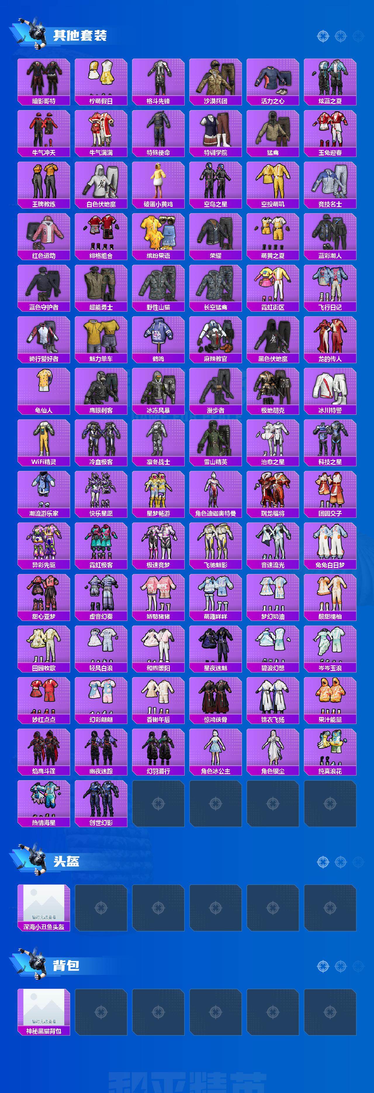 角色-军刀雅典娜,套装-龟仙人,套装-暗影哥特,套装-破蛋小黄鸡,套装-漫步者,套装-雪山精英,角色-迪迦奥特曼,套装-瑞龙福将,套装-团圆交子