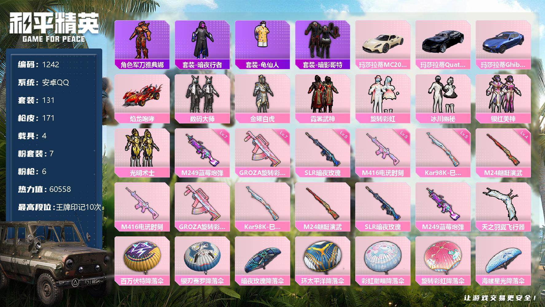 [12847002]安卓 手Q-7粉装-6特效枪-4载具-1粉色飞行器-60558热力值-10王牌印记-131套装-171枪皮