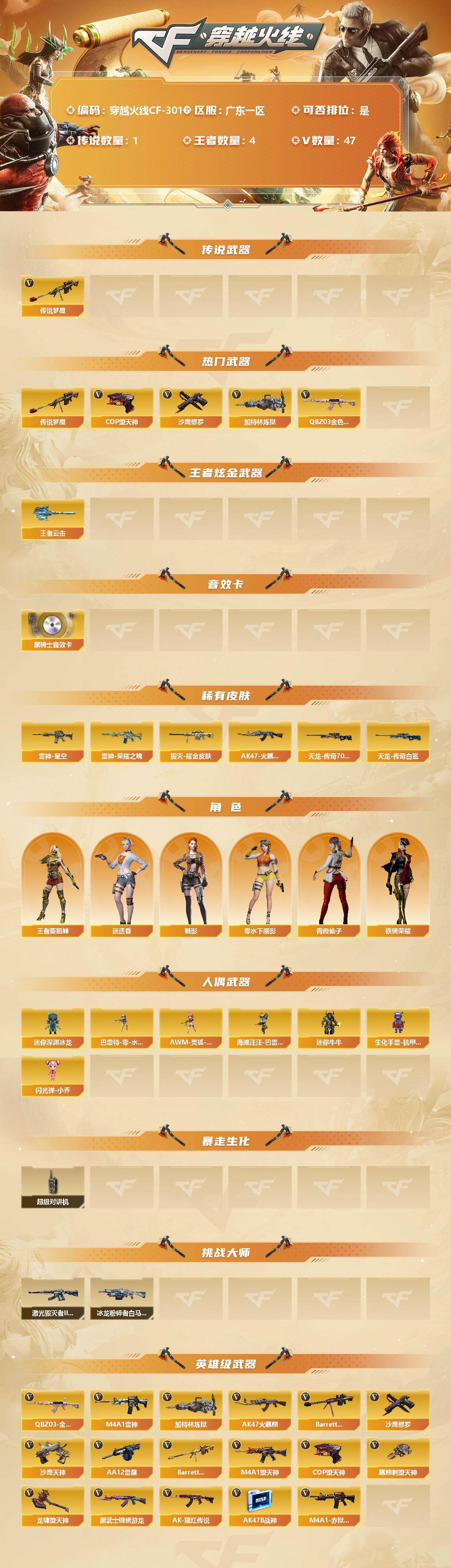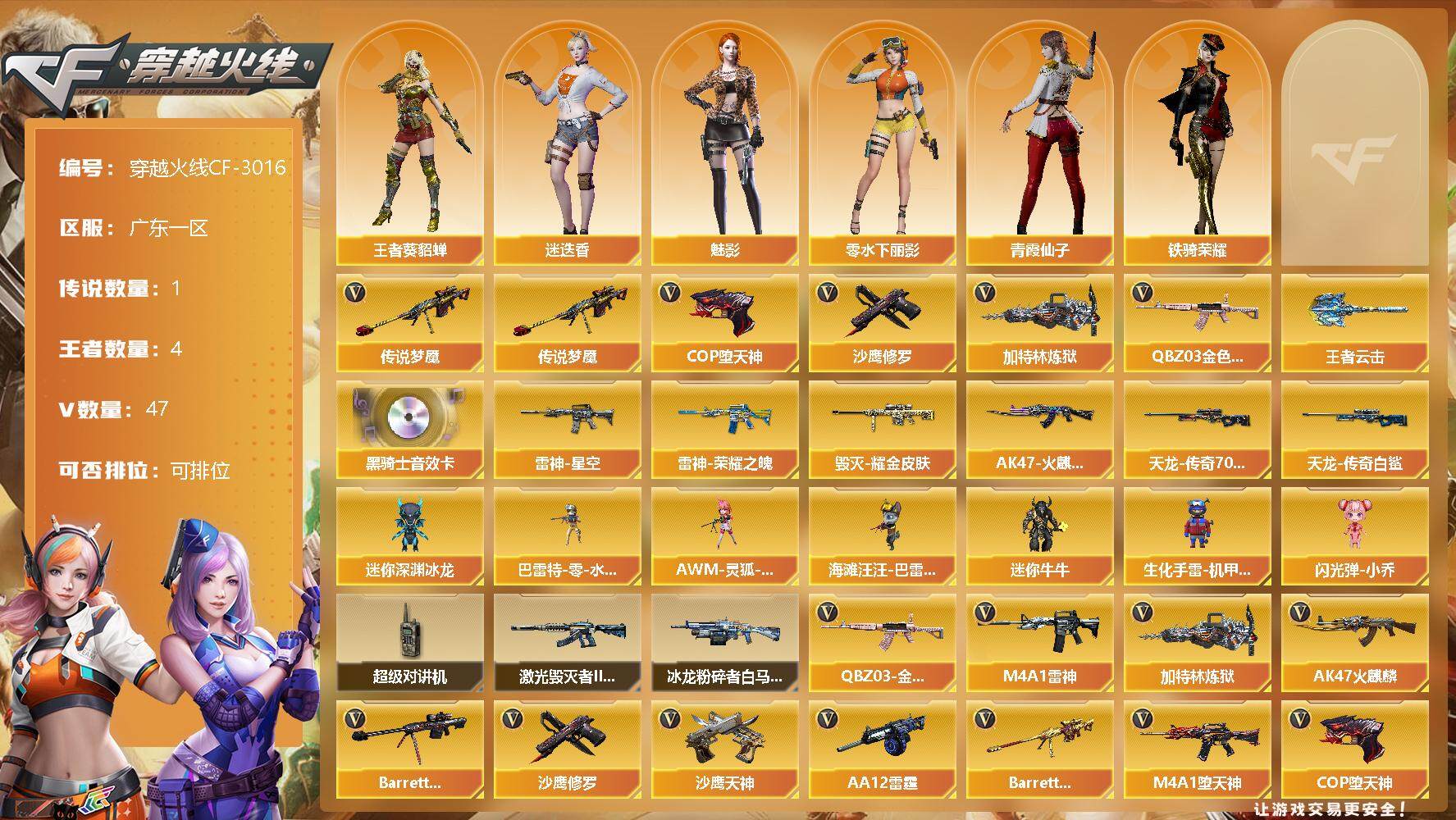 [12847368]广东一区-47V-4王者-0炫金 【传说武器】:传说梦魇 【热门武器】:传说梦魇,QBZ03-金色蔷薇,加特林-炼狱,COP-堕天神*2,沙鹰-修罗 【王者炫金武器】:王者云击 【音效卡】:M4A1-黑骑士音效卡 【稀有皮肤】:雷神-荣耀之魄,雷神-星空,AK47-火麒麟-传奇EVEN,毁灭耀金皮肤,AWM-天龙-传奇70KG,AWM-天龙-传奇白鲨 【角色】:王者-葵-貂蝉,零-水下丽影,魅影,迷迭香,铁骑荣耀,青霞仙子 【人偶武器】:巴雷特-零-水下丽影,AWM-灵狐-15周年嘉年华,海滩汪汪-巴雷特,迷你深渊冰龙,迷你牛牛,生化手雷-机甲核心,闪光弹-小乔 【暴走生化】:超级对讲机 【挑战大师】:激光毁灭者III-白马银枪,冰龙粉碎者-白马银枪 【英雄级武器】:M4A1-堕天神,COP-堕天神*2,麒麟刺-堕天神,龙啸-堕天神*2,QBZ03-金色蔷薇,M4A1-雷神,加特林-炼狱,AK47-火麒麟,Barrett-毁灭,AA-12-雷霆,Barrett-朱雀,黑武士-锦绣游龙,AK-47-猩红传说,AK47-B-战神,M4A1-赤狱骑士,沙鹰-天神,沙鹰-修罗 【特殊枪械】:1炼狱