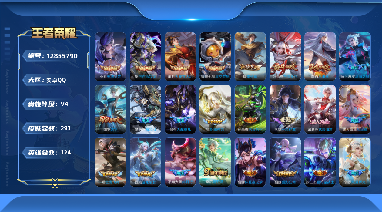 [12855790]安卓Q-V4-最强王者段位-124英雄-293皮肤-4典藏-0珍品无双-0无双-0珍品传说-23传说-85史诗