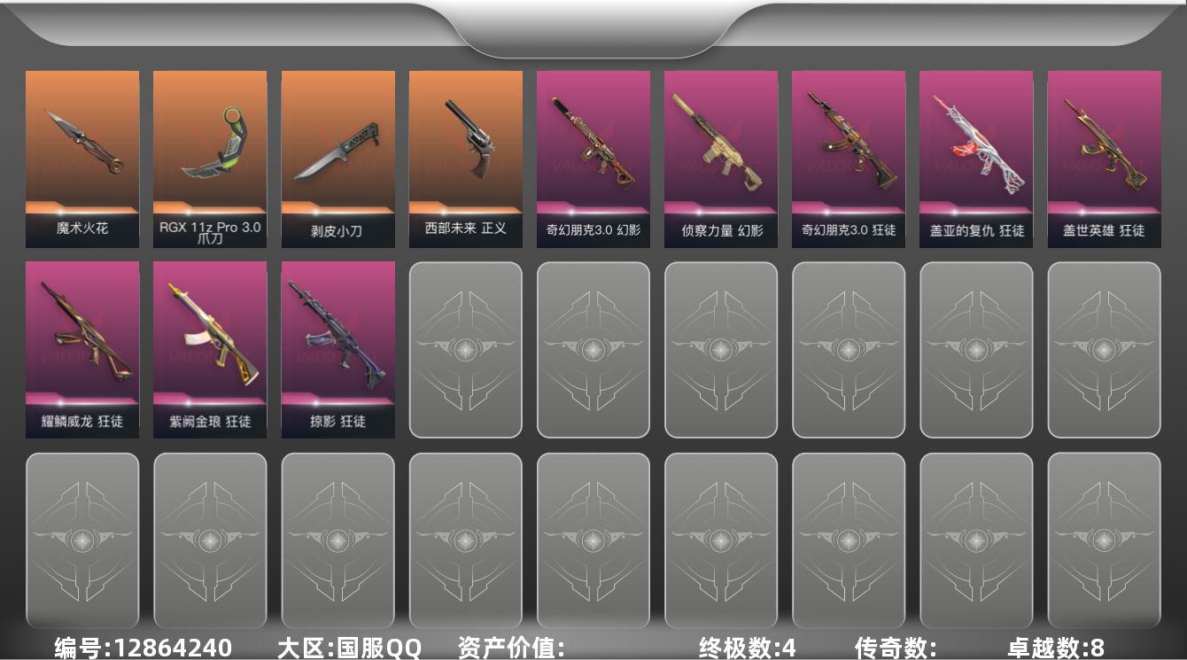 [12864240]【英雄】:幻棱,炼狱,维斯,暮蝶,钛狐,壹决,铁臂,捷风,雷兹,幽影,不死鸟,贤者,猎枭,零,芮娜,尚勃勒,霓虹,斯凯,夜露,盖可,钢锁 【近战 武器】:近战武器-魔术火花,近战武器-剥皮小刀,近战武器-RGX 11z Pro//3.0 爪刀,近战武器-魔术火花 【狂徒】:狂徒-掠影,狂徒-盖世英雄,狂徒-盖亚的复仇,狂徒-耀鳞威龙,狂徒-紫阙金琅,狂徒-奇幻朋克//3.0 【幻影】:幻影-侦察力量,幻影-奇幻朋克//3.0 【标配】:标配-超能偶像 【正义】:正义-西部未来,正义-超限闪存,正义-复古浪潮,正义-纳米打击 【鬼魅】:鬼魅-诡秘蛇影,鬼魅-光导纤维,鬼魅-灵魂消声者,鬼魅-星云暗涌 【卡面】:终章:激斗汉堡 卡面,进入射程 卡面,纳米打击 卡面,《双城之战》拥抱 卡面,精灵大战 卡面,欢迎来到底城 卡面,南瓜盛典 卡面,修车达人 卡面,正义的化身 卡面,终章:生意人麦宝 卡面,铁之华 卡面,时间到 卡面,最高舞台 卡面,声感陷阱设计图 卡面,梦幻奶茶 卡面,源能反应 卡面,暂别喧嚣 卡面,零点嗅探设计图 卡面,终章:瓦娃脸雪糕 卡面,表象之下 卡面,沙雕爆能器 卡面,无畏契约GO!第一卷:芮娜 卡面,清除名单 卡面,无畏契约GO!第一卷:零 卡面,终章:同步耍酷 卡面,龍记 卡面,化茧成蝶 卡面,完美调谐 卡面 ,暗枪 卡面,夯实根基 卡面,"Luie" 卡面,铁臂设计图 卡面,代号红色 卡面,新兵报到 卡面,V契约 卡面,无畏契约 卡面 【喷漆】:嗨宝南瓜灯 喷漆,嘭! 喷漆,都算到了 喷漆,控场勿近 喷漆,小丑猫 喷漆,熊抱 喷漆,超级粉丝 喷漆,捷风差距 喷漆,惊声尖叫 喷漆,拼一枪 喷漆,我觉得不行 喷漆,我的刀呢? 喷漆,UWU 喷漆,新潮流 喷漆,双击点赞 喷漆,买装还是存钱 喷漆,醒狮贺春 喷漆,旅行小熊 喷漆,蕊形灯 喷漆,真相只有一个 喷漆,再吃最后一口 喷漆,老铁困了 喷漆,胜利属于无畏契约 喷漆,GLHF 喷漆,无畏契约 喷漆 【挂饰】:终章:猫猫木乃伊 挂饰,悠闲鸡块 挂饰,伞绳 挂饰,《双城之战》小蛋糕 挂饰,第九季//第三幕 纪念币 挂饰,工具腰带 挂饰,无畏契约GO!第一卷 芮娜 挂饰,无畏契约GO!第一卷 零 挂饰,熔岩灯 挂饰,第九季//第二幕 纪念币 挂饰,终章:这瓜保熟 挂饰,糖葫芦 挂饰,袖珍捷风 挂饰,迷你