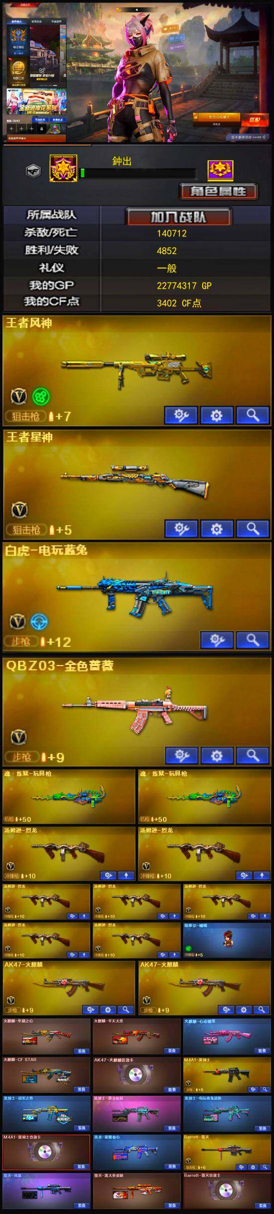- [12658068]湖南一区-87V-10王者-4炫金 【热门武器】:HK417-朱雀,M4A1-青龙,M200-幻神,死亡之眼,Kar98K-星神,M4A1-黑骑士*2,汤姆逊-烈龙*3,RPK-盘龙*6,加特林-炼狱,沙鹰-修罗*7 【王者炫金武器】:炫金骑士,炫金雷神*3,王者之戮,超新星-悦享,王者之击 【音效卡】:AK47-火麒麟音效卡,M4A1-雷神音效卡,M4A1-黑龙音效卡,Barrett-毁灭音效卡 【稀有皮肤】:雷神-耀金皮肤,火麒麟-轻羽皮肤,毁灭-星空,无影耀金皮肤,修罗-星空 【角色】:王者-瞳-闭月羞花,雅典娜,零-水下丽影,魅影,凌霄 【人偶武器】:火麒麟-灵狐,M37-葵 【暴走生化】:死亡之眼 【英雄级武器】:M4A1-夜魔*2,破空枪刃-夜魔*2,马来剑-夜魔,HK417-朱雀,M4A1-青龙,M4A1-雷神*2,M4A1-黑龙,M4A1-黑骑士*2,RPK-盘龙*6,加特林-炼狱,汤姆逊-烈龙*3,AK47-无影*4,AK47-火麒麟*6,AK47-黑武士*2,AK12-天启*2,AWM-天龙*3,Barrett-毁灭*3,Barrett-极光,AWM-裁决,AA-12-雷霆,Kar98K-星神,M200-幻神,AK47-黑鲨*2,M4A1-千变*2,沙鹰-修罗*7,屠龙*2 【特殊枪械】:2黑骑士,3烈龙,6盘龙,1炼狱